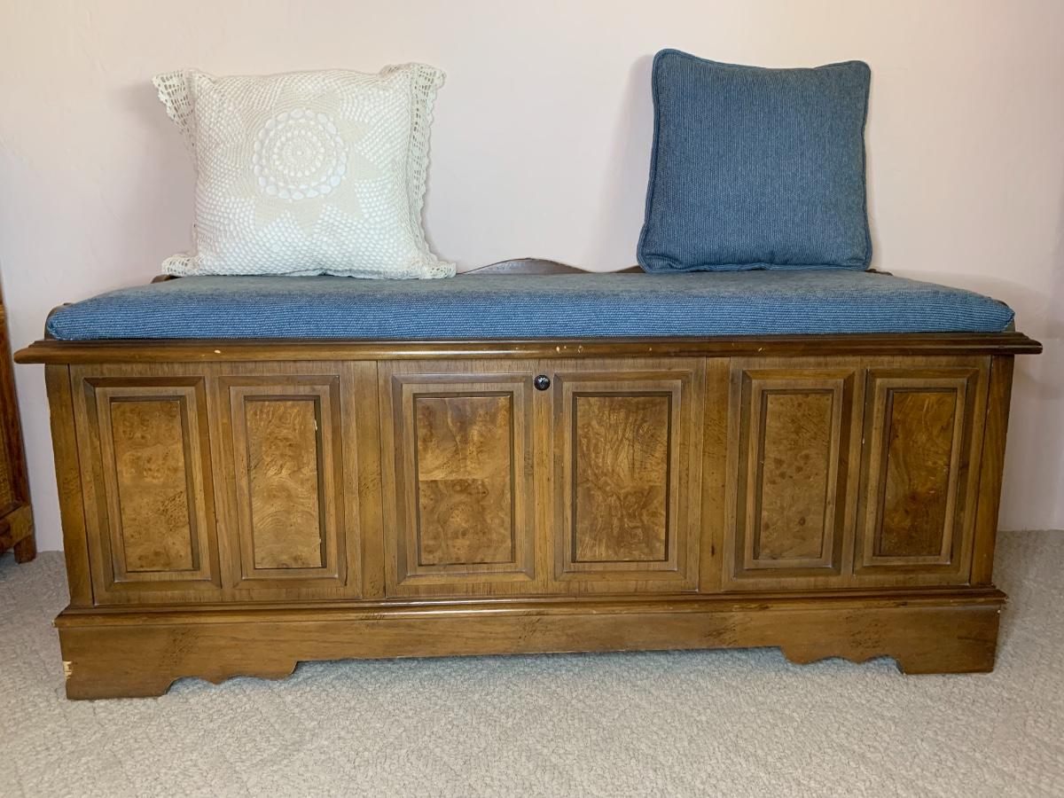 Cedar Lane Chest with Cushion in great condition. Has a push lock with no key. Comes with 2 pillows. (48” L x 18” D x 19.5 “ H)