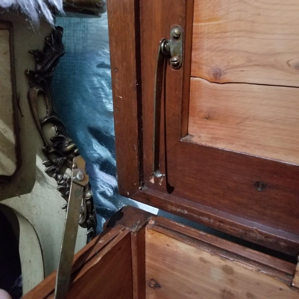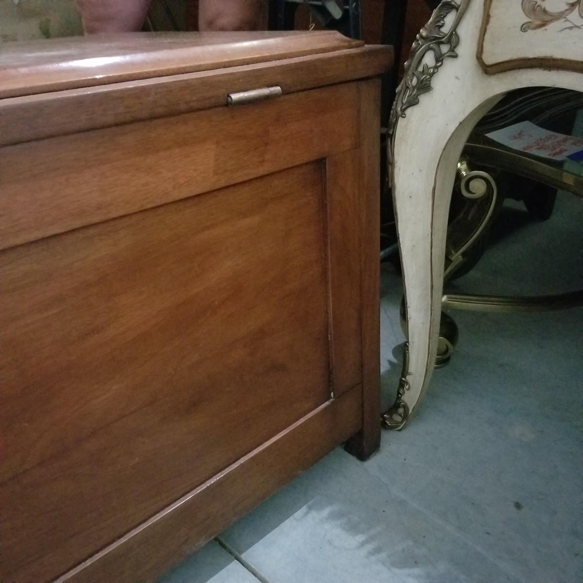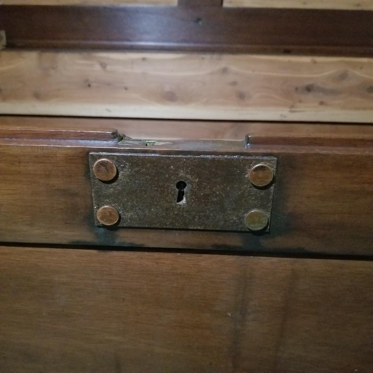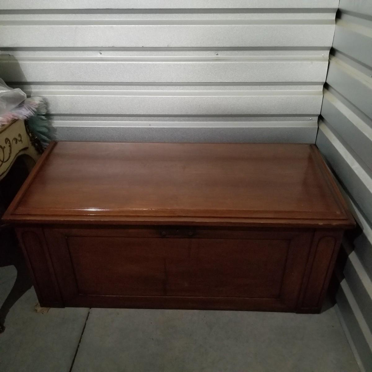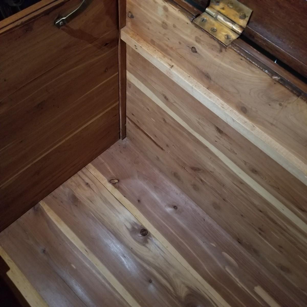 Solid wood cedar chest w/lift lid. Chest measures 48" x22" x23", has rail lip inside to hold tray, not included. Minor damage to one side support and the front feet are not attached, butvare included. See photos for details. Local pickup only.