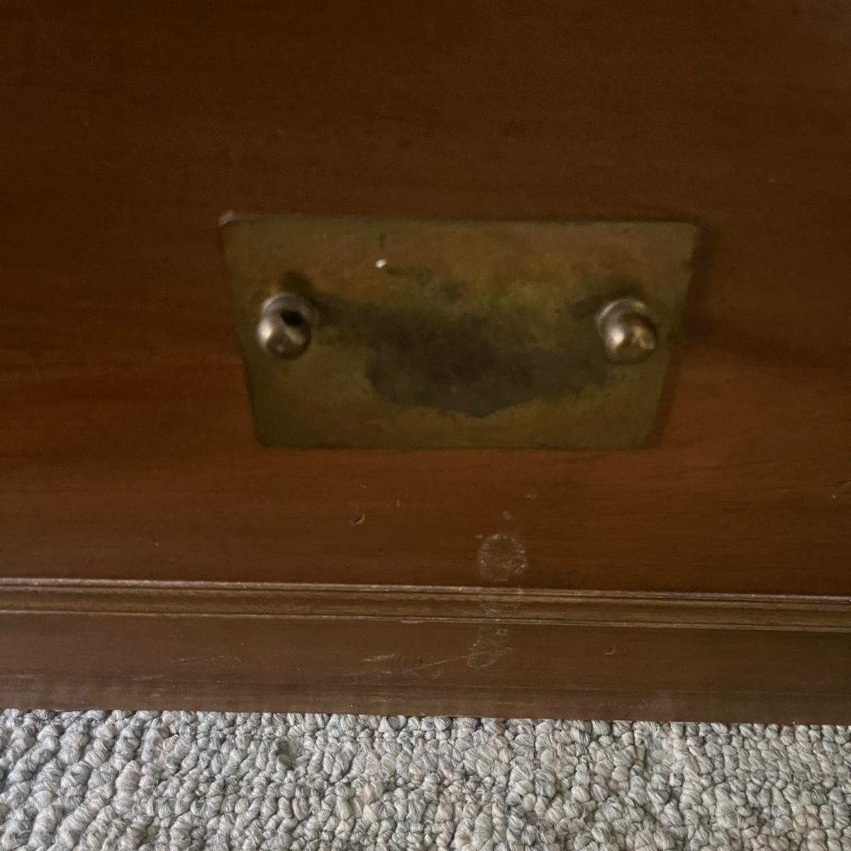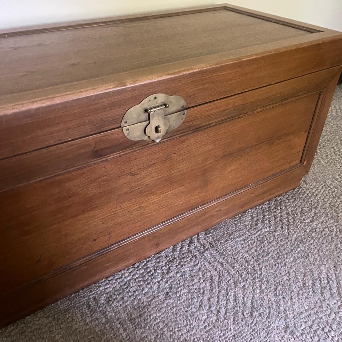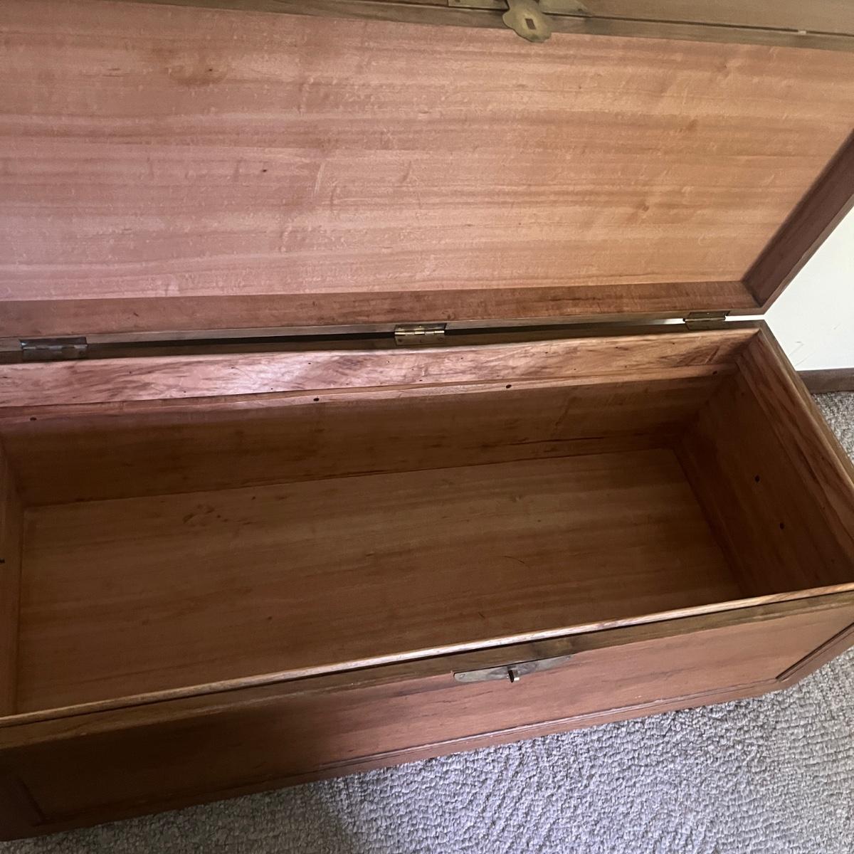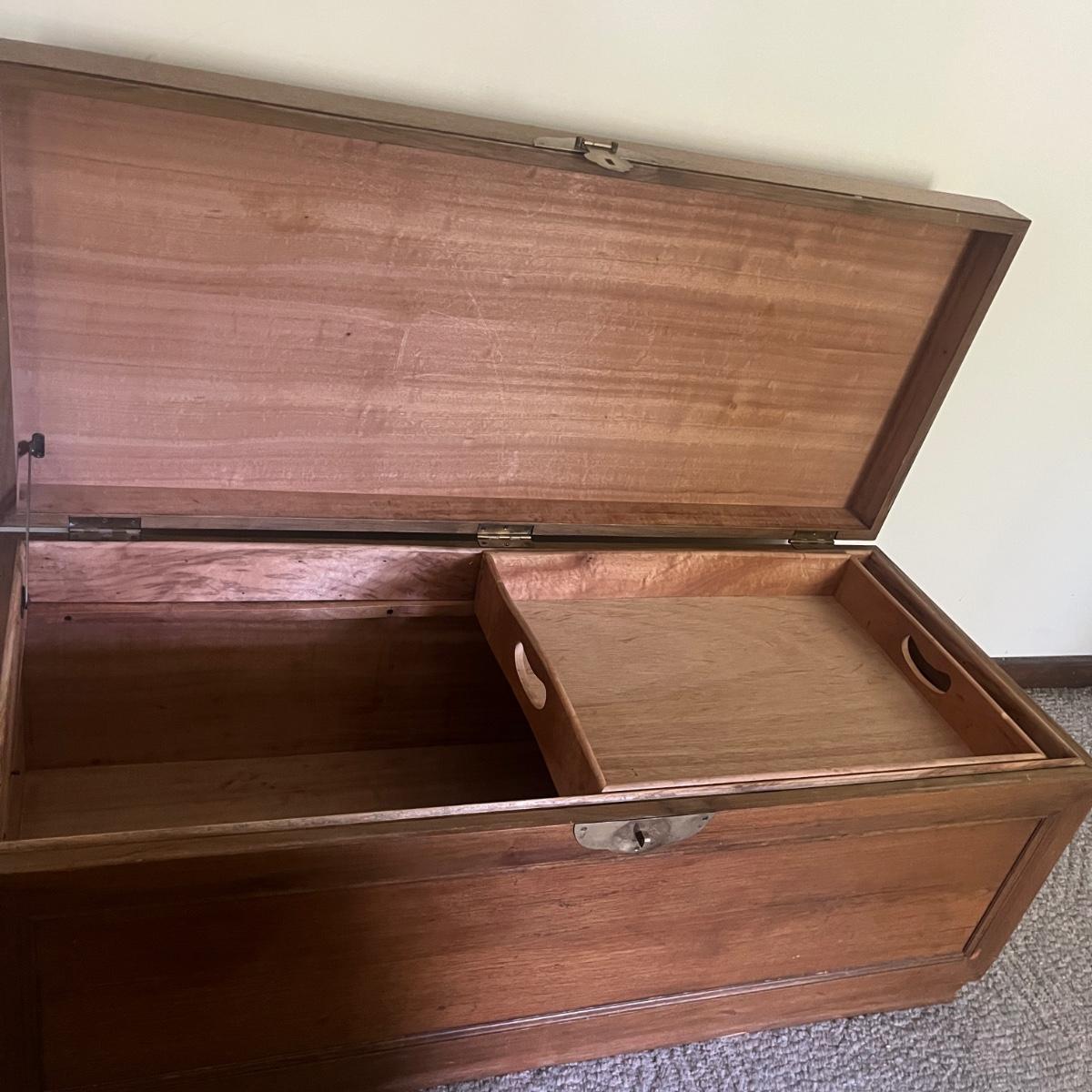 Lot includes a large cedar lined chest with one wooden tray. Chest measures 48” x 20” x 20”H. Handles on both ends are missing pieces, see pictures.