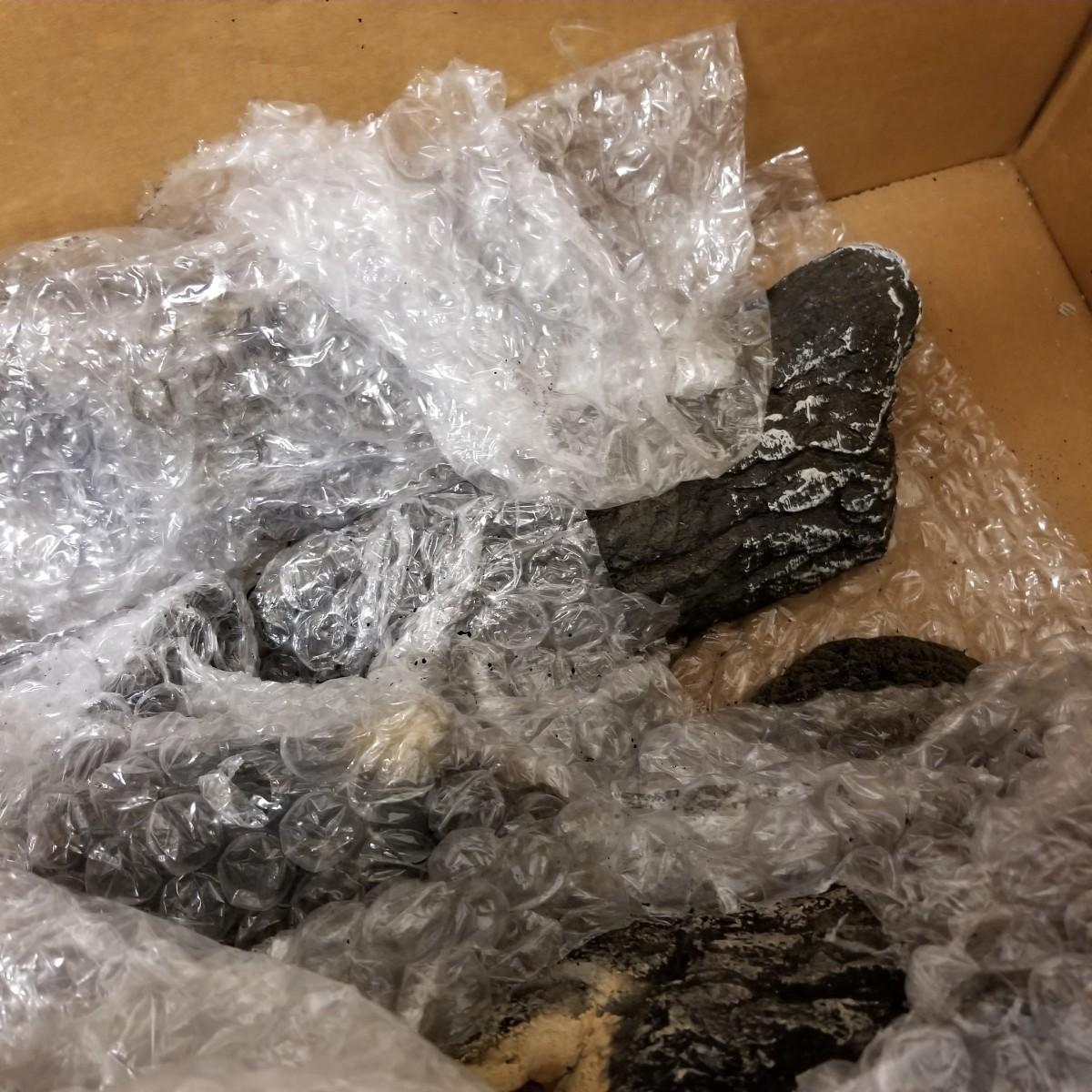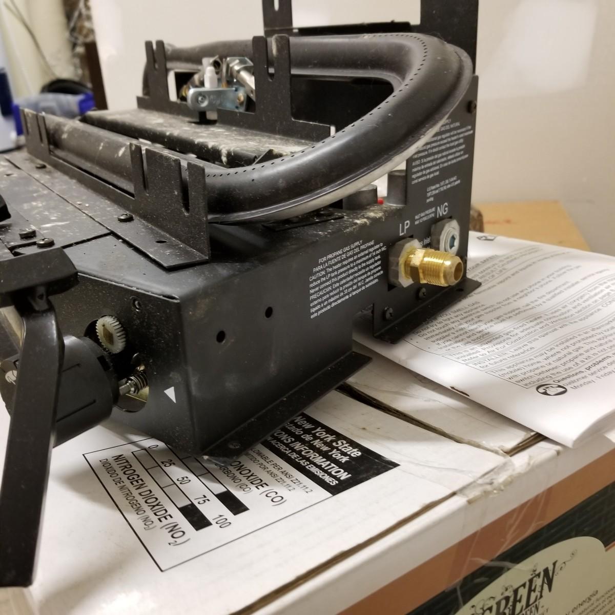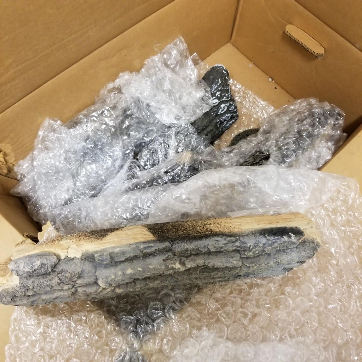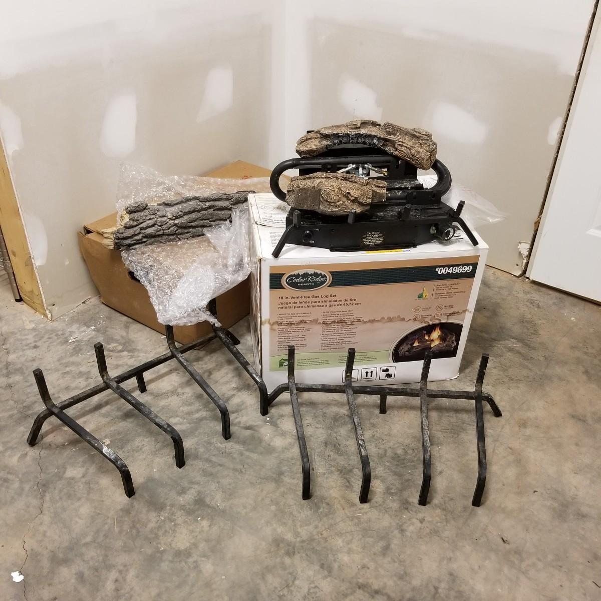This unit is designed to be professionally installed in a fireplace. Will run on natural gas or LP. Basic gas unit measures 21"x14"x8" but would be bigger with all logs attached. Untested. Includes one set of gas logs with kit, and one box of six additional larger gas logs. Also included are two cast iron fire grates, 26"x13"8". See photos for details. Local pickup only.