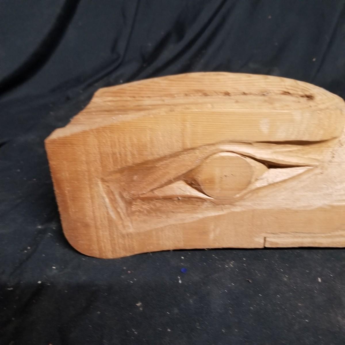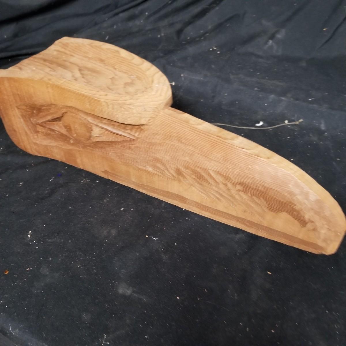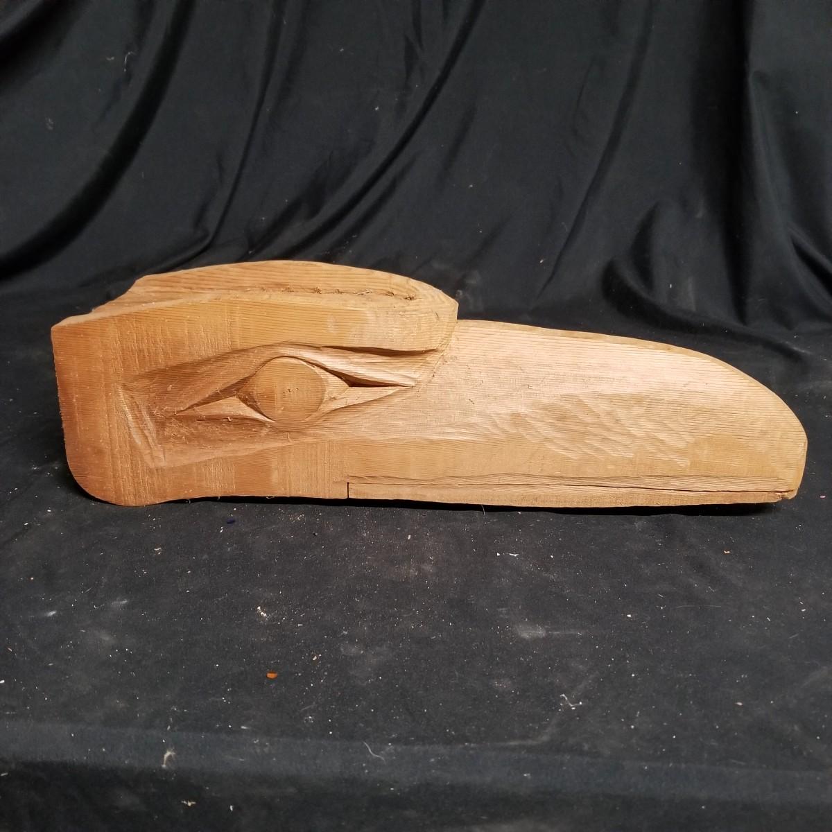 Hand carved cedar seahawk head.   Mouth opens, has leather hinge.  See photos for more detail.  19"x6"x5.5".  Shipping available.