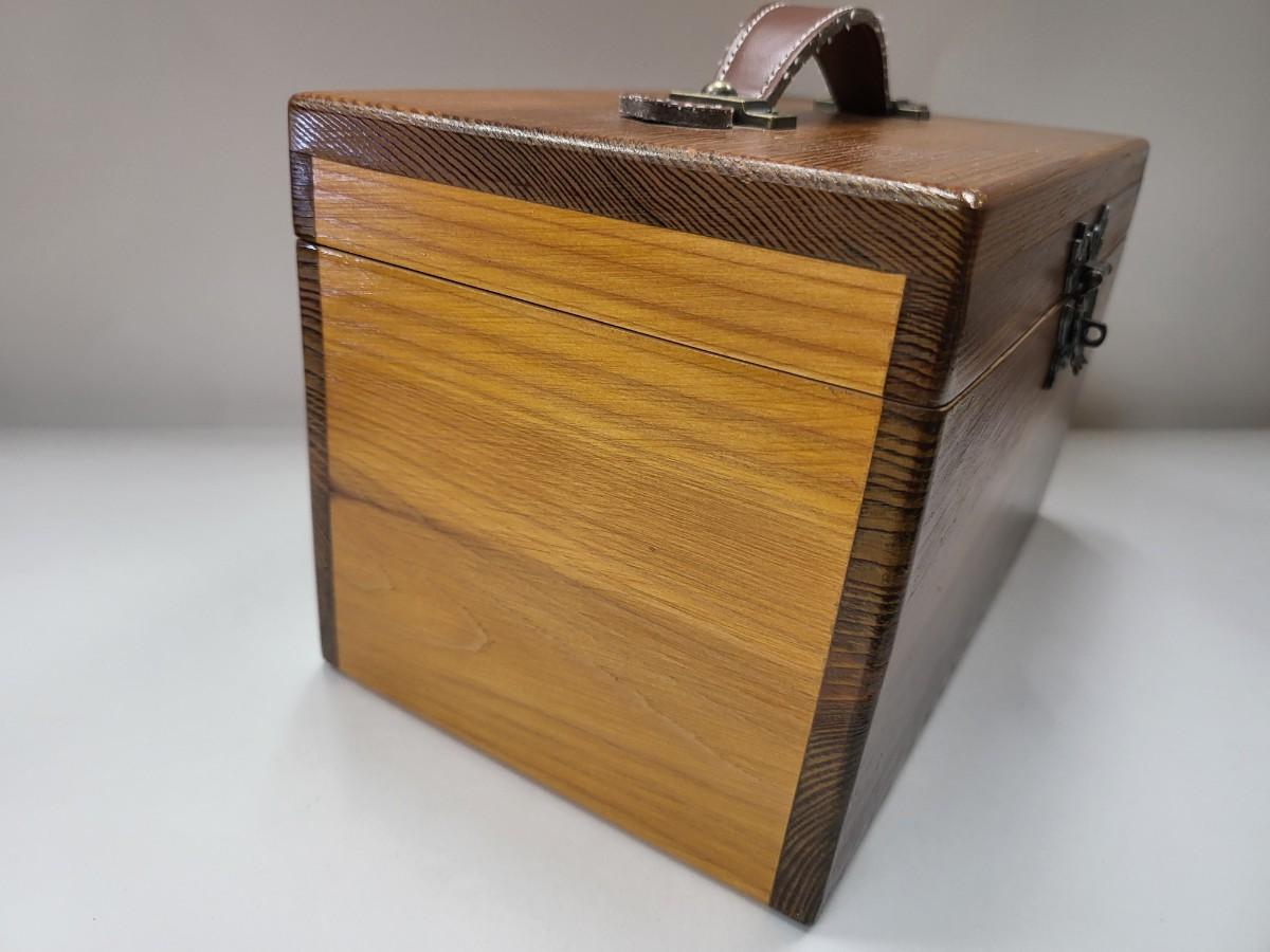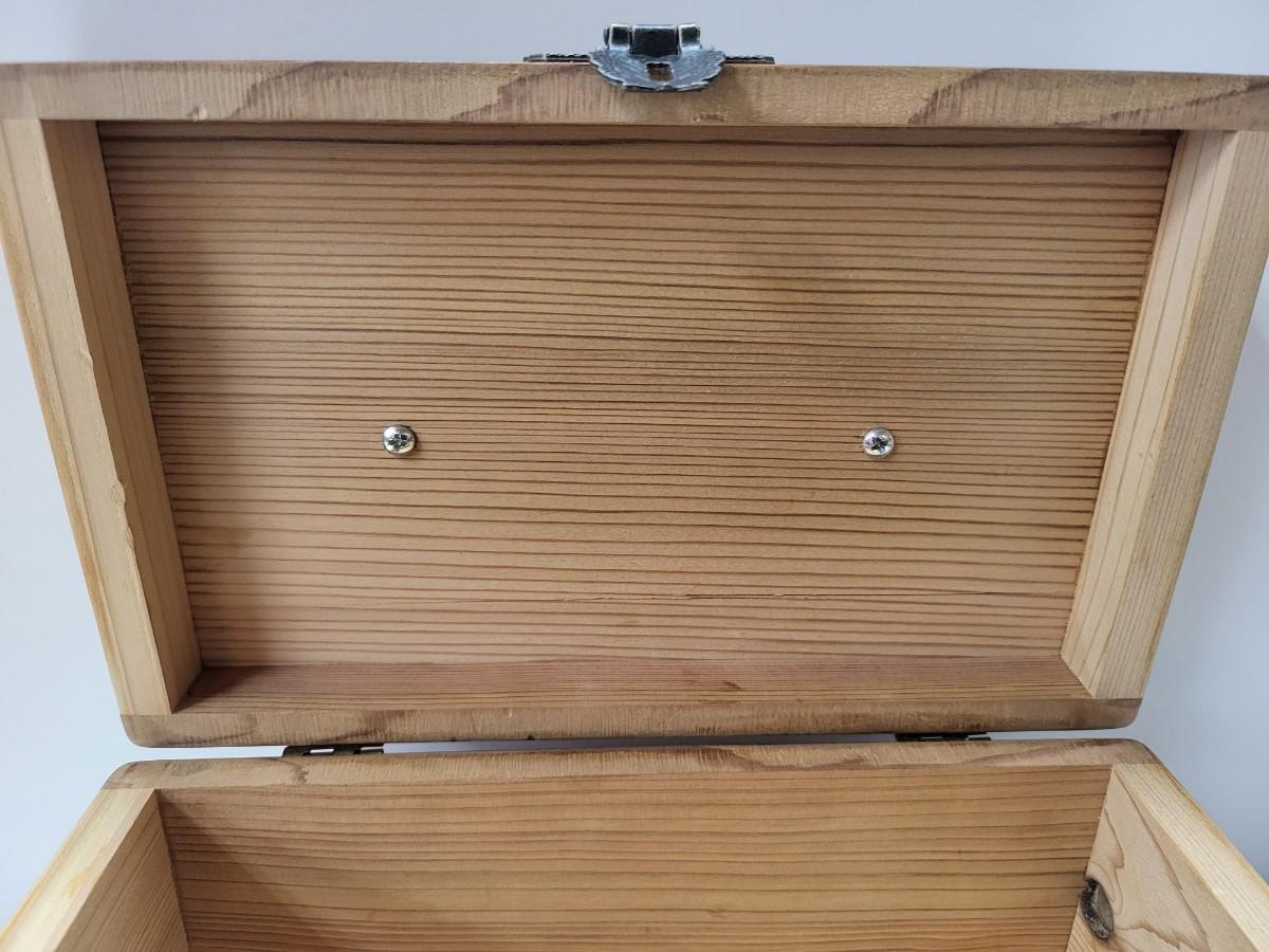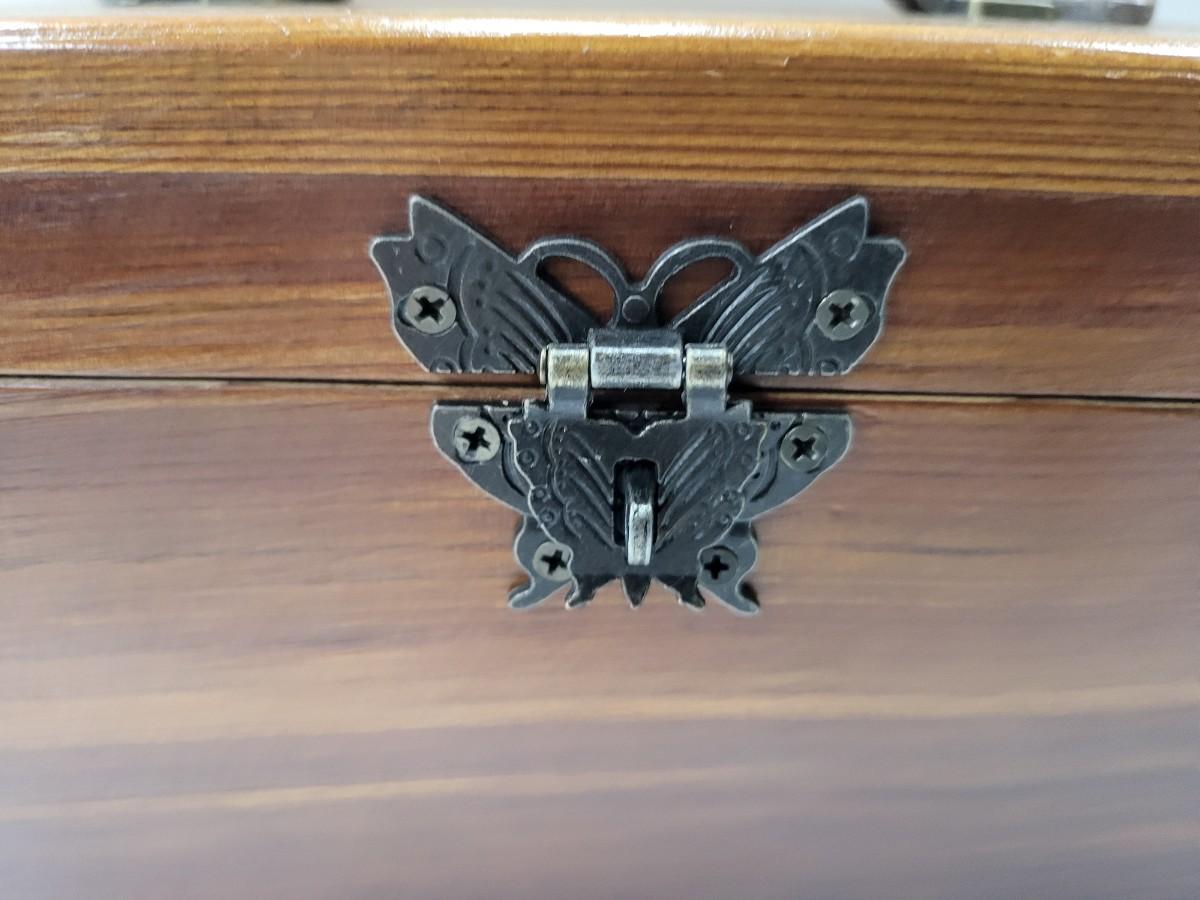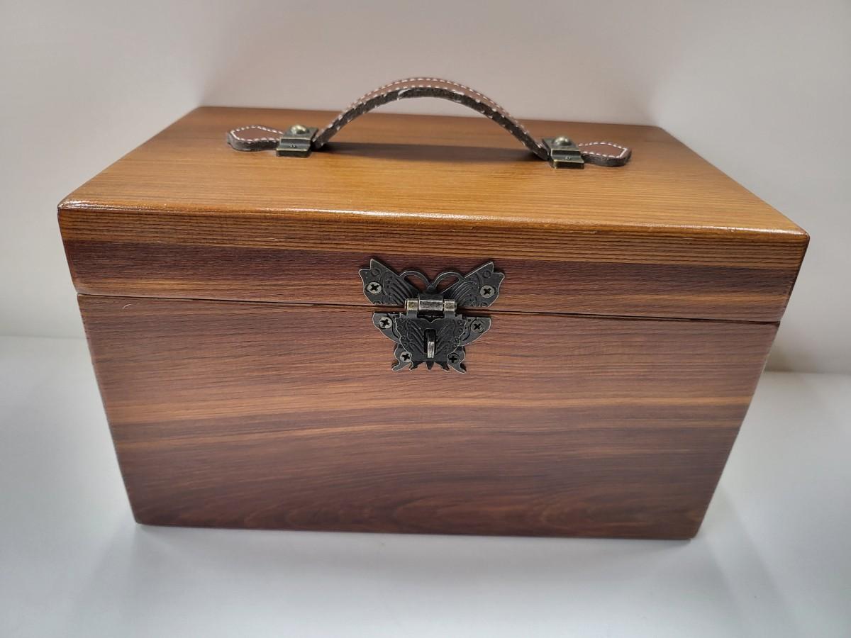 Cedar box with hand strap. Measures 10" long x 6" tall x 6" deep. Bronzed butterfly lock hardware. Perfect to hold your small treasures, jewelry, etc.