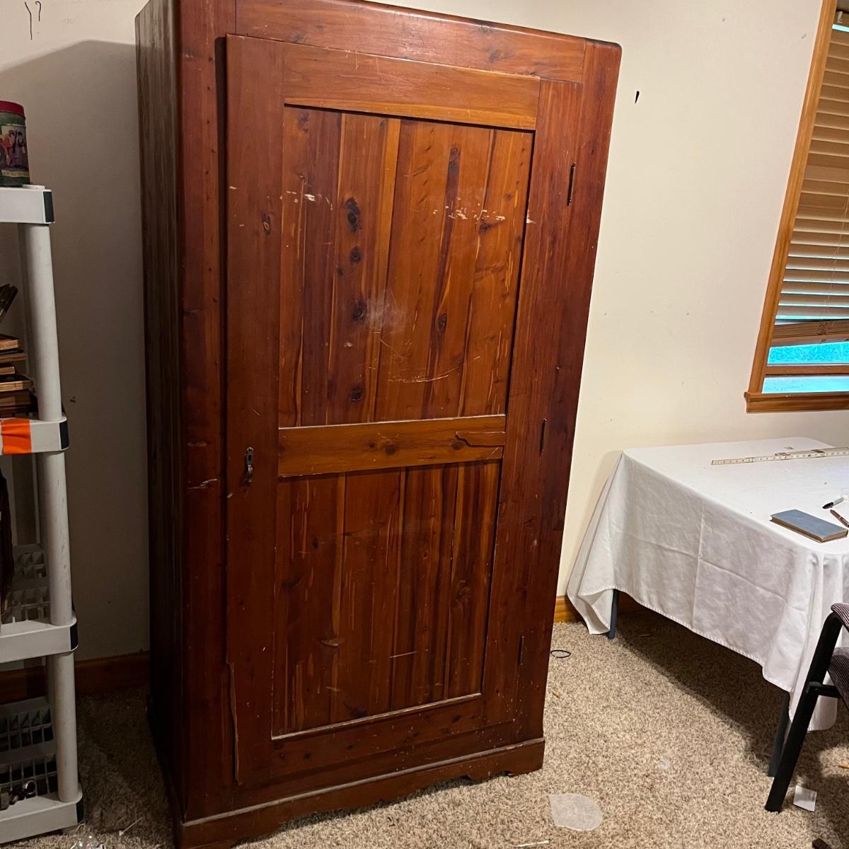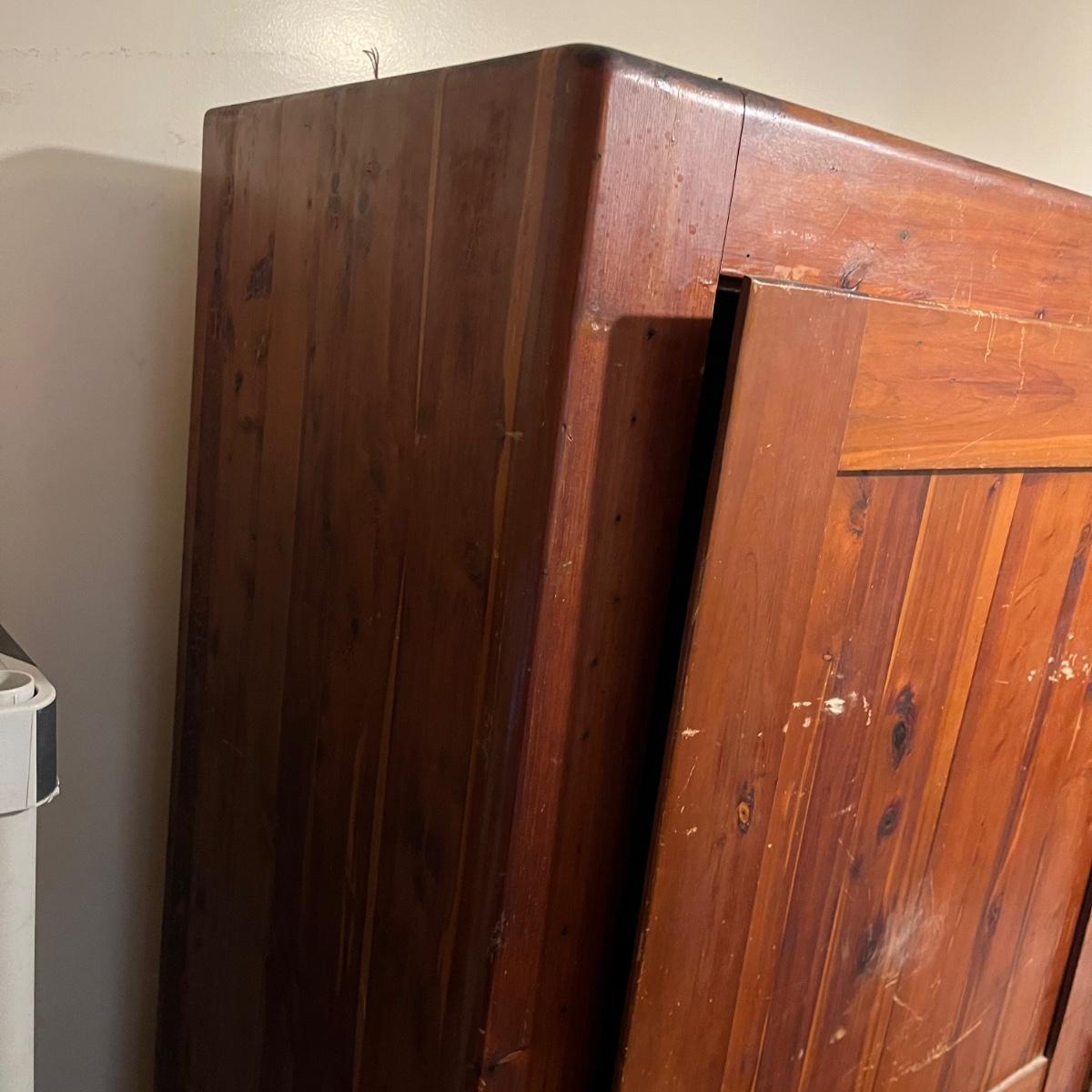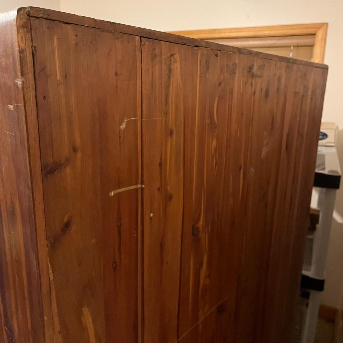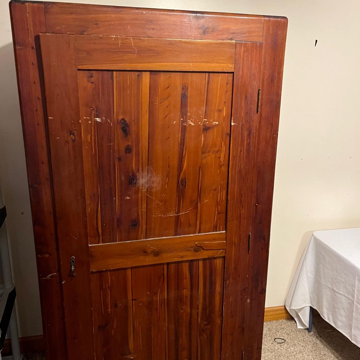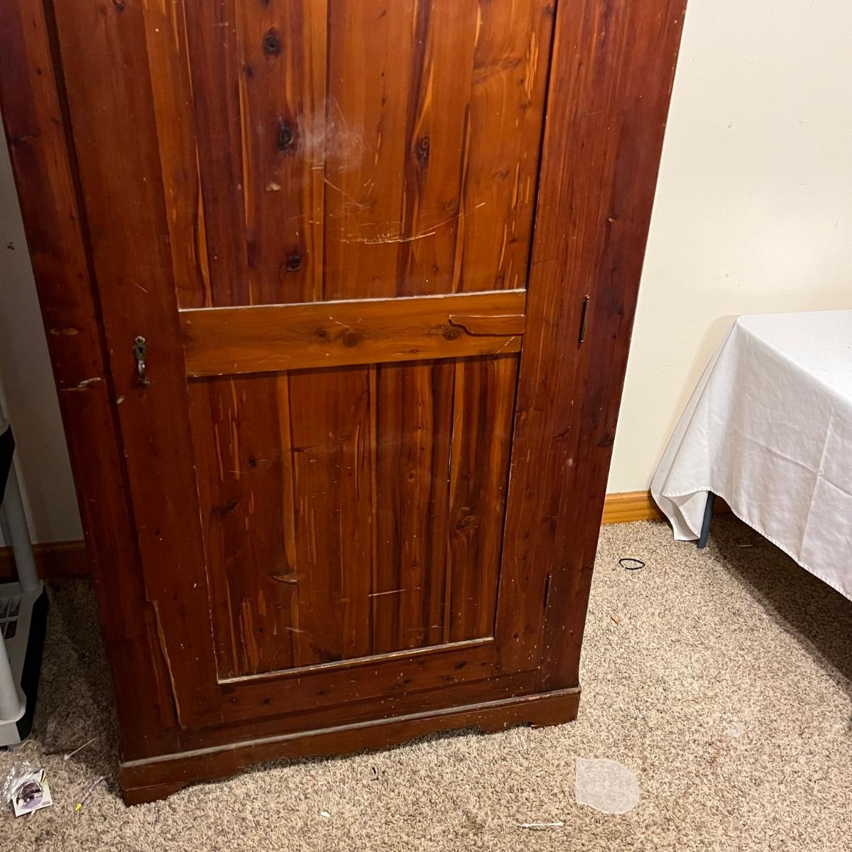 Lot includes a unique large cedar wardrobe. Wardrobe door has split in middle and will not completely close. Wardrobe has some superficial scratches and nicks, see pictures. Wardrobe measures 22” x 35.5” x 70”.