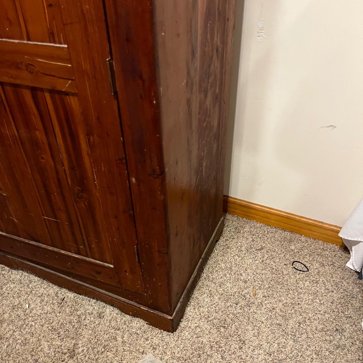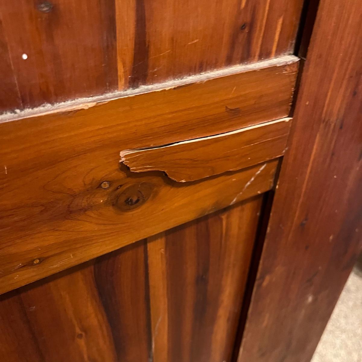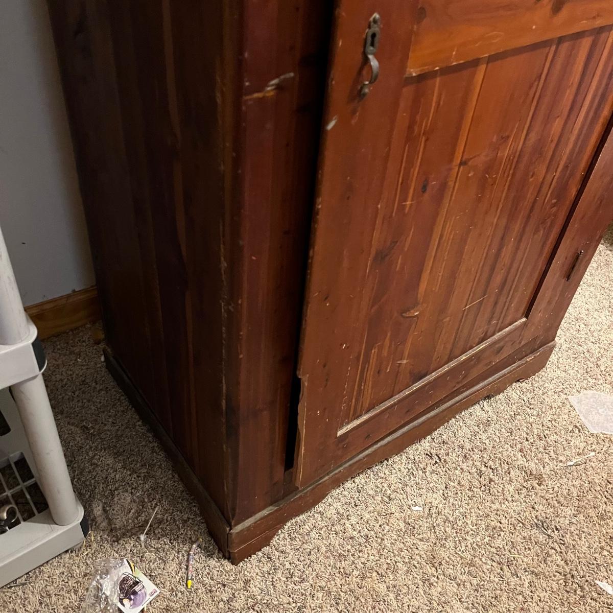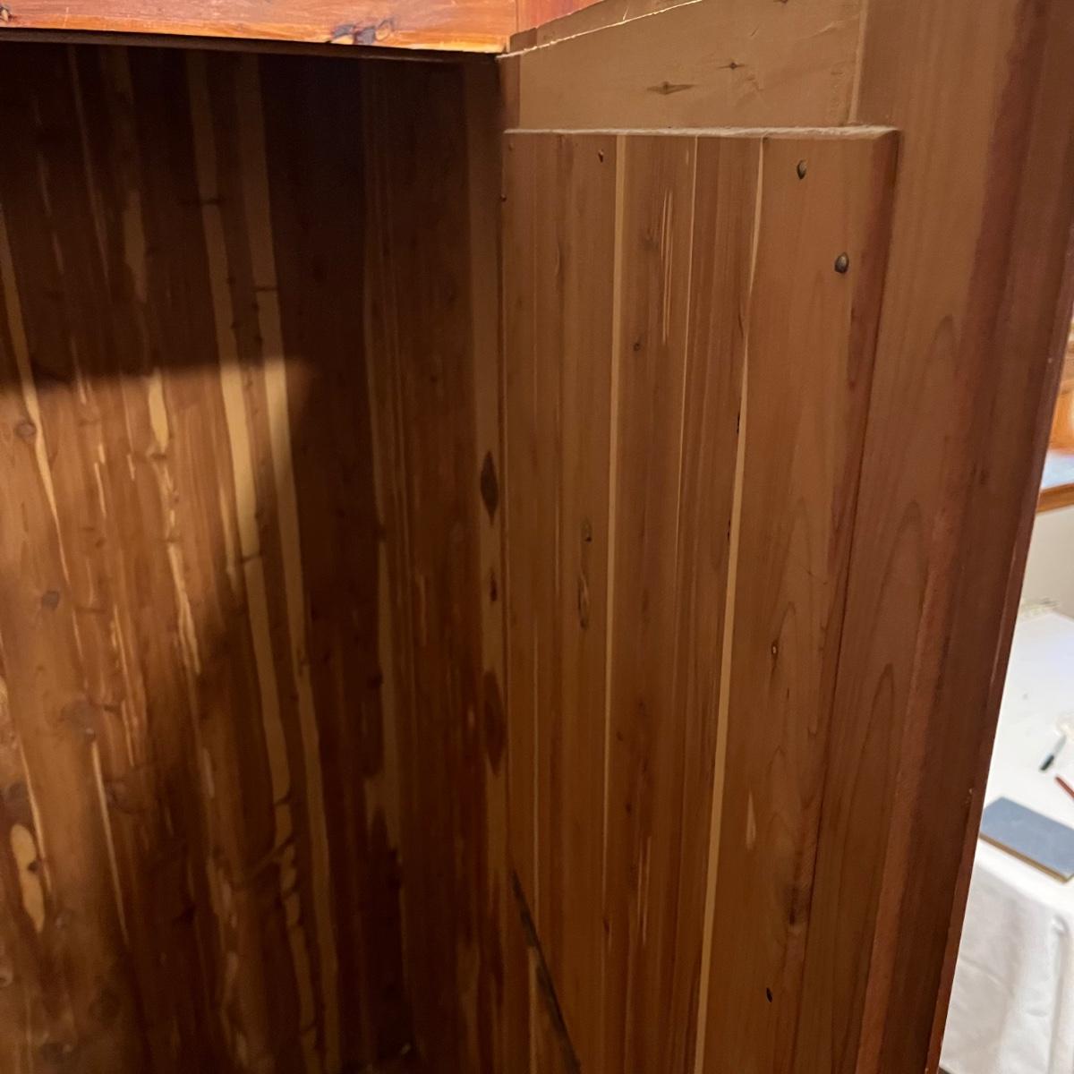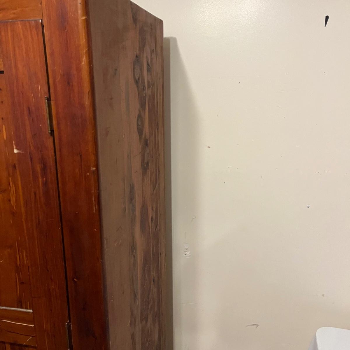 Lot includes a unique large cedar wardrobe. Wardrobe door has split in middle and will not completely close. Wardrobe has some superficial scratches and nicks, see pictures. Wardrobe measures 22” x 35.5” x 70”.