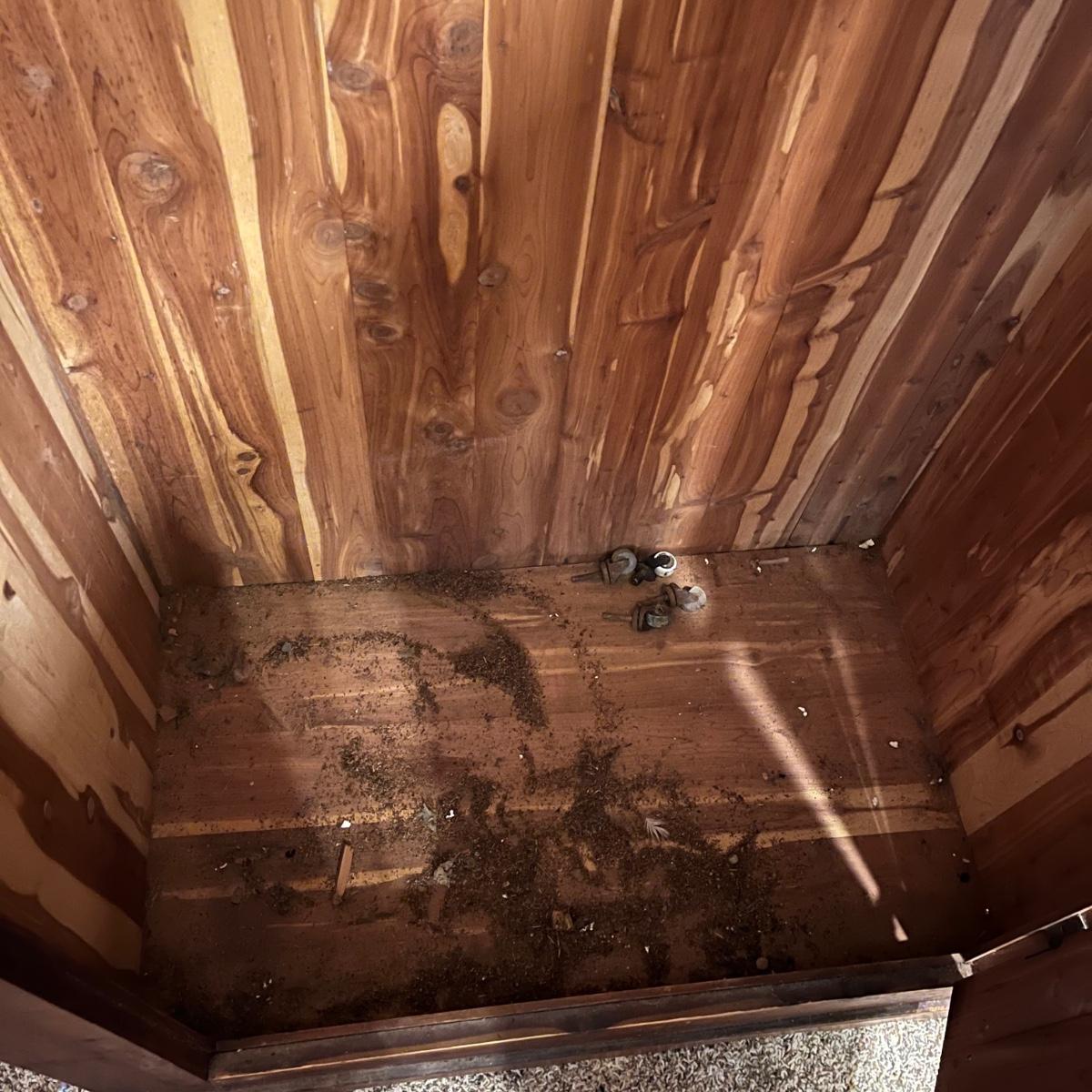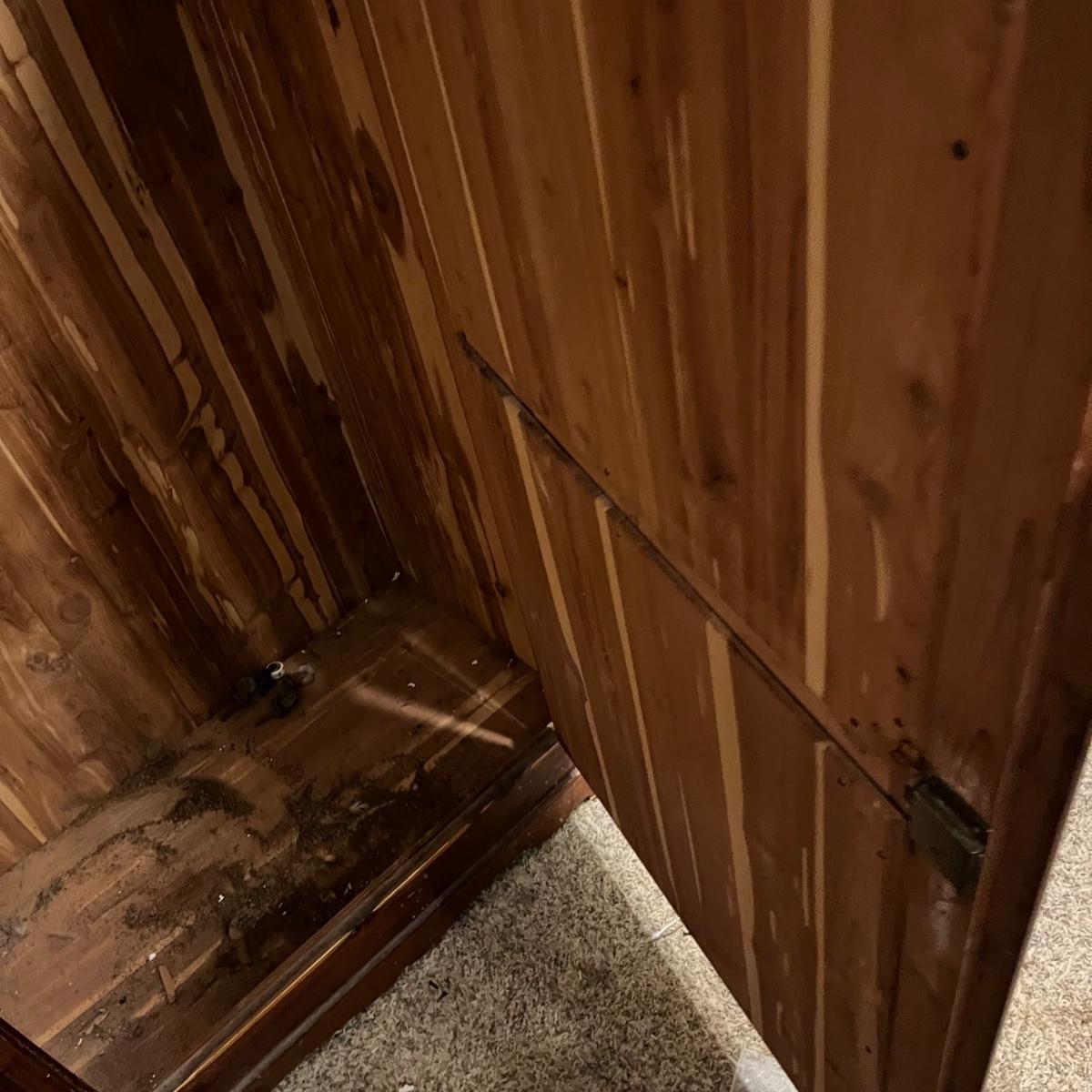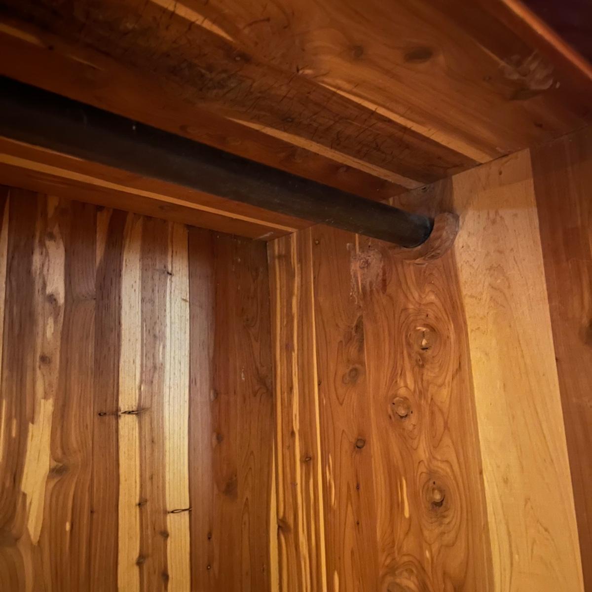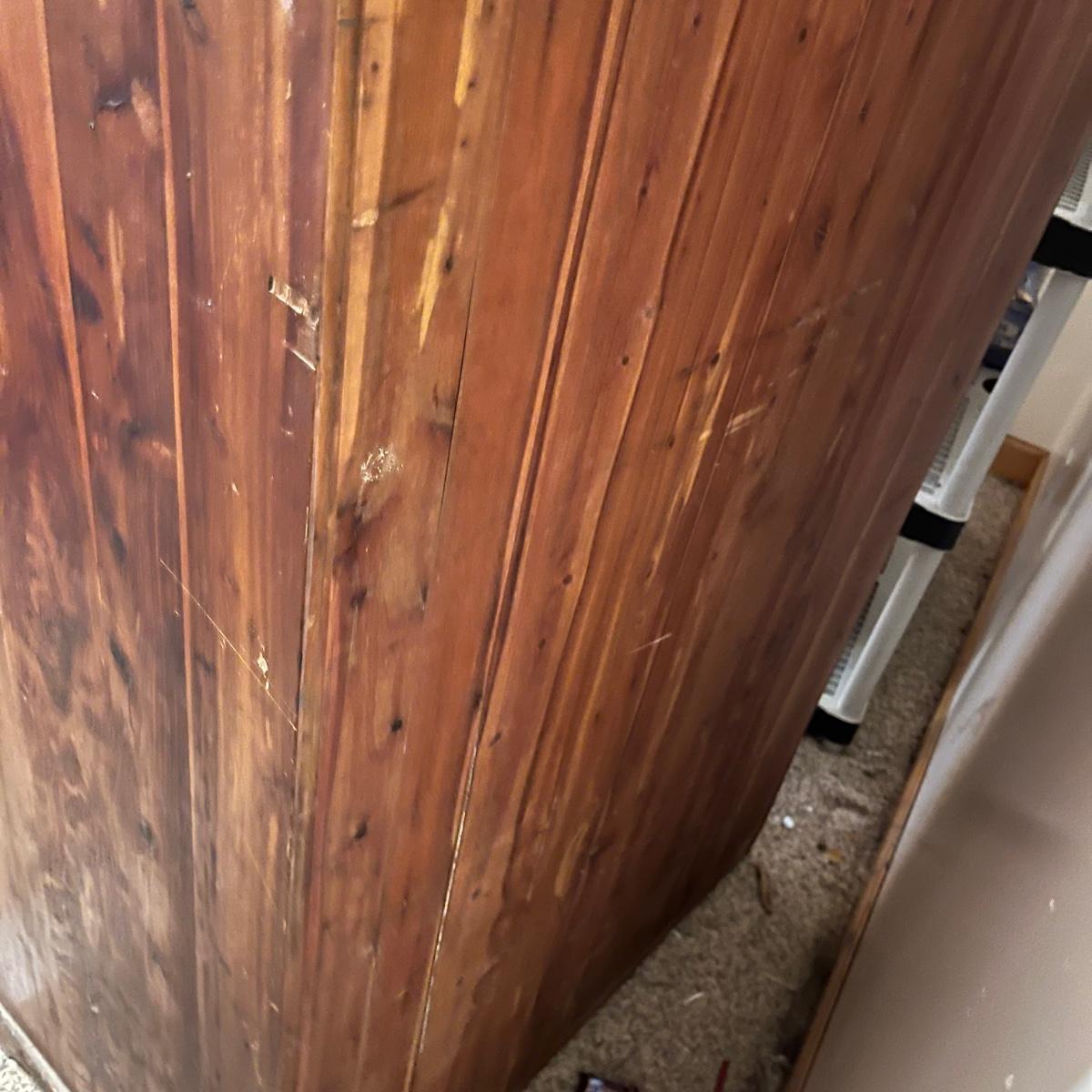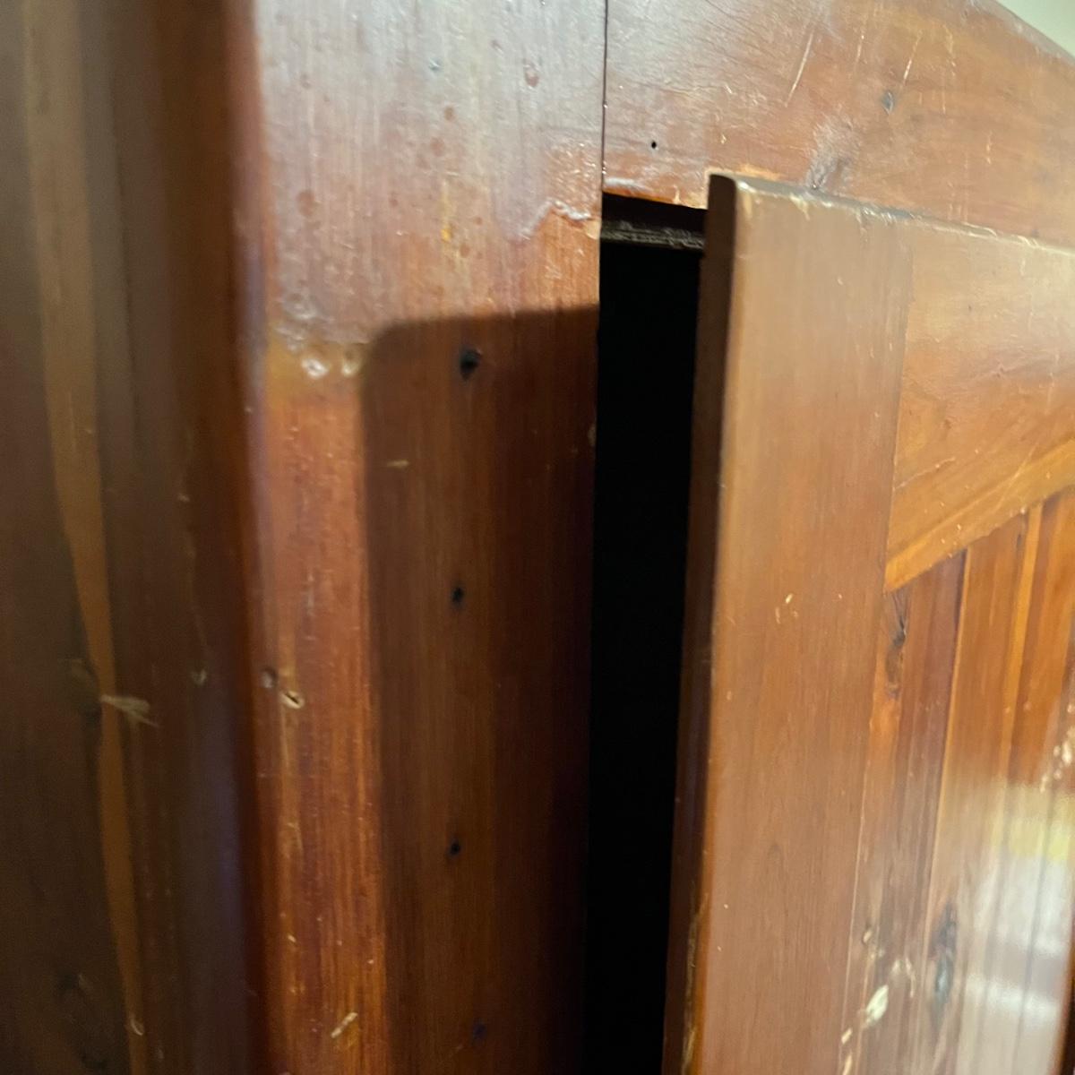 Lot includes a unique large cedar wardrobe. Wardrobe door has split in middle and will not completely close. Wardrobe has some superficial scratches and nicks, see pictures. Wardrobe measures 22” x 35.5” x 70”.