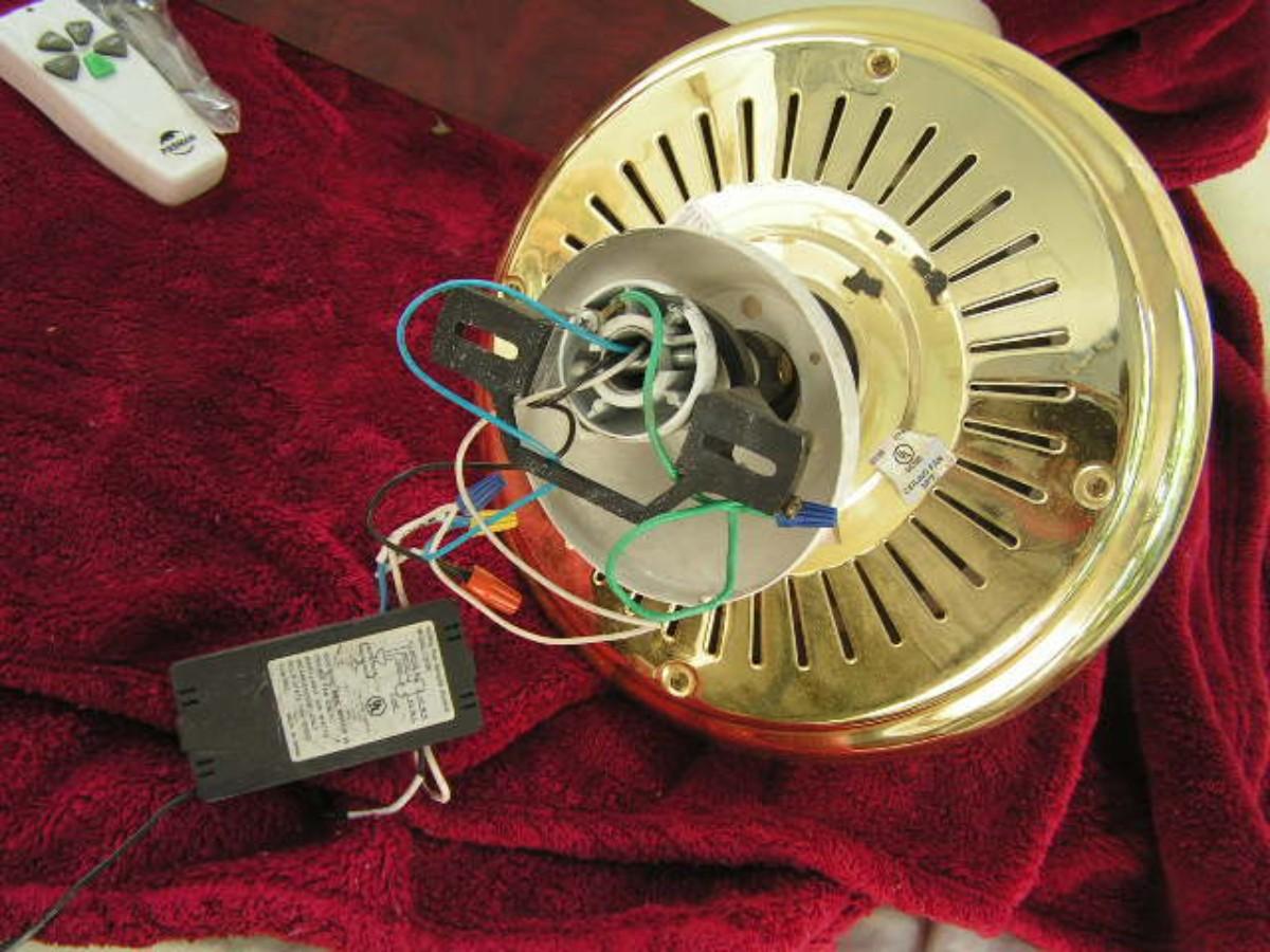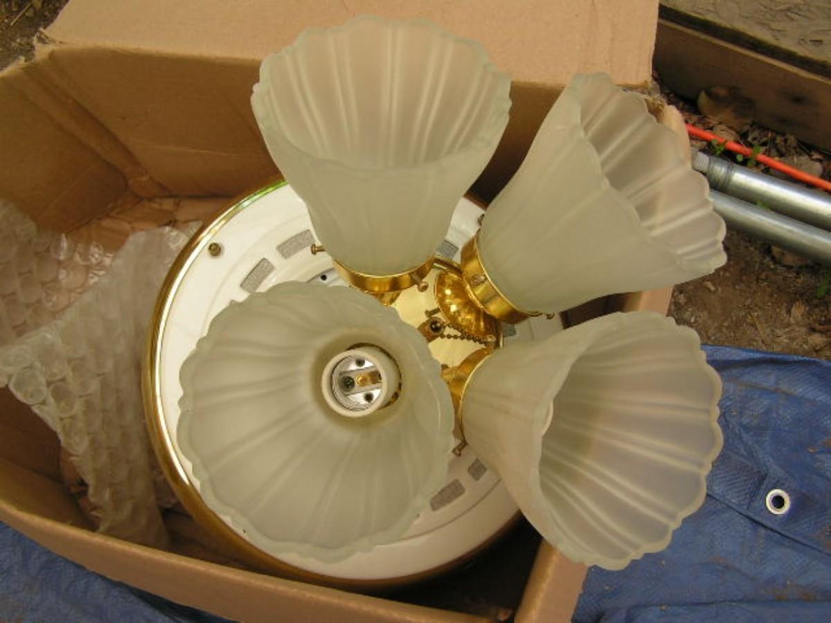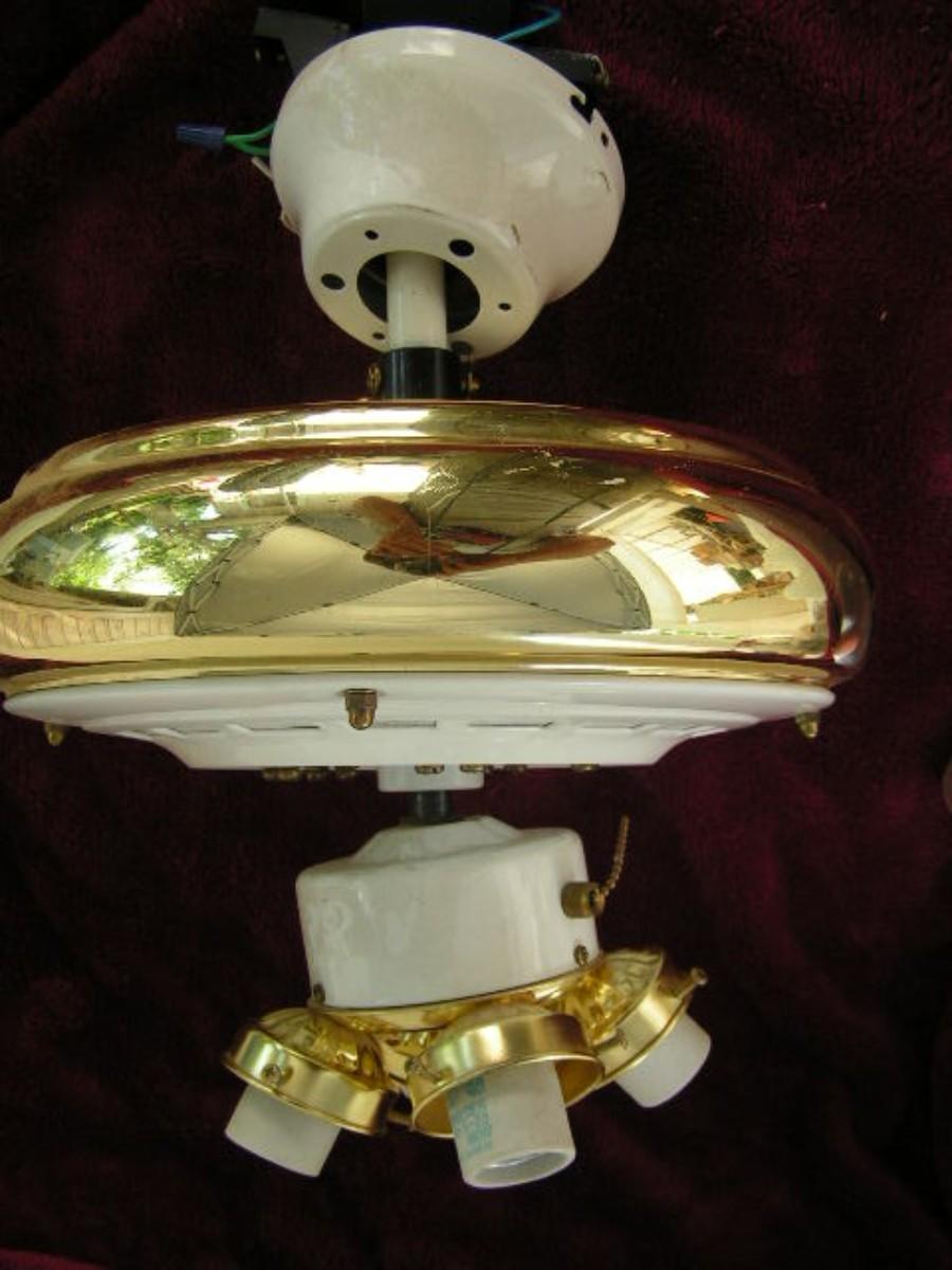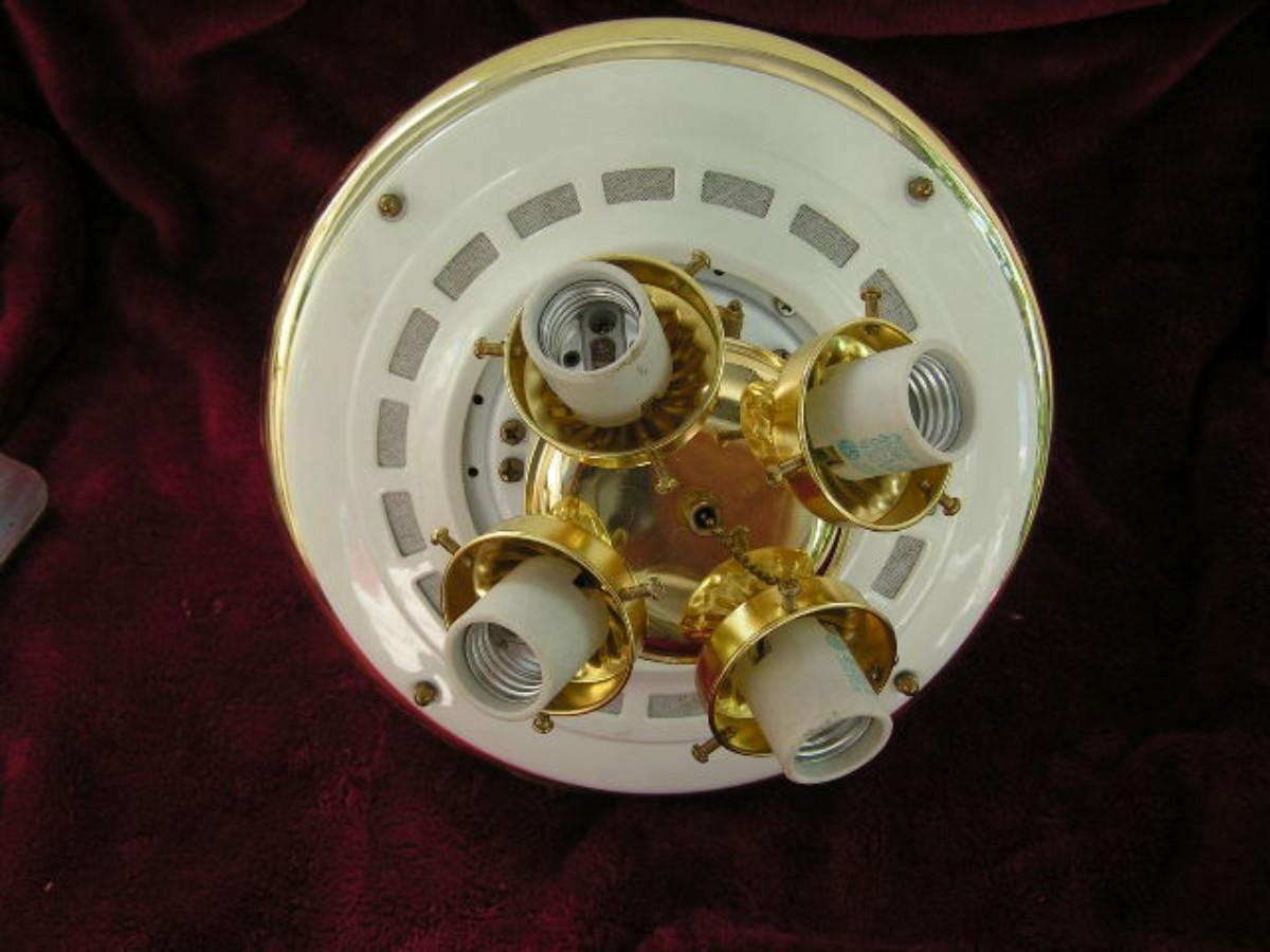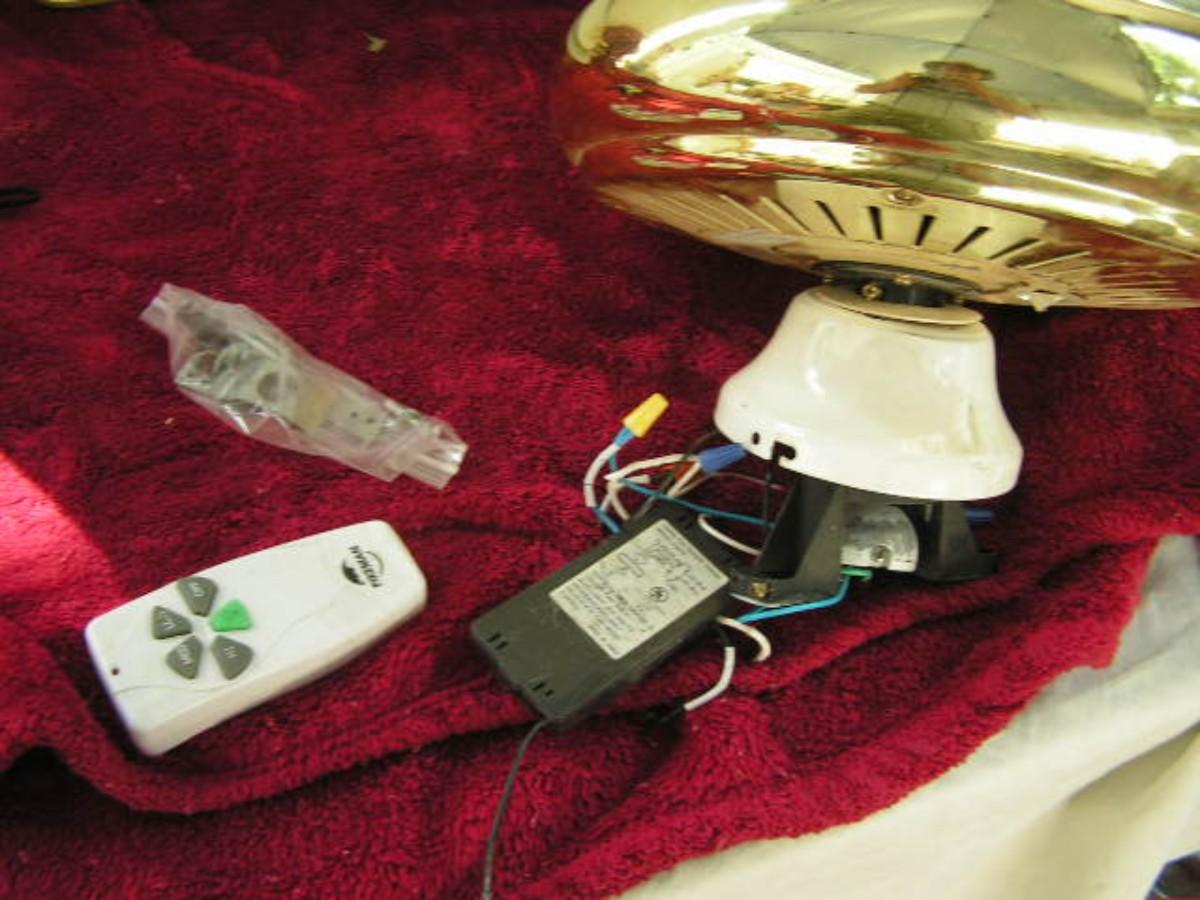 Ceiling fan w/remote control, reported by owner as working when removed from house. White/gold/brown. 5 blades are 2 color. reversible - white/burly walnut (brown). Four light shades included. NOT tested. AS IS!