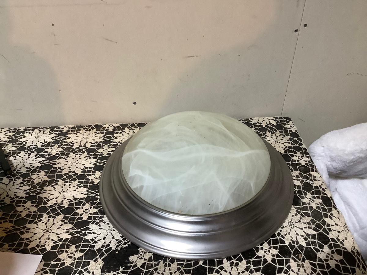 This is a silver modern ceiling light with frosted shade.