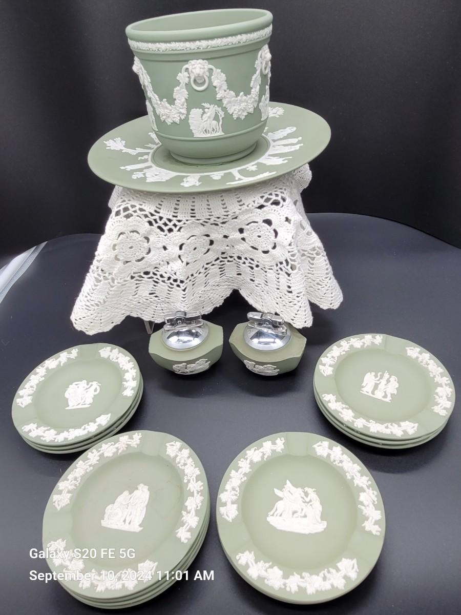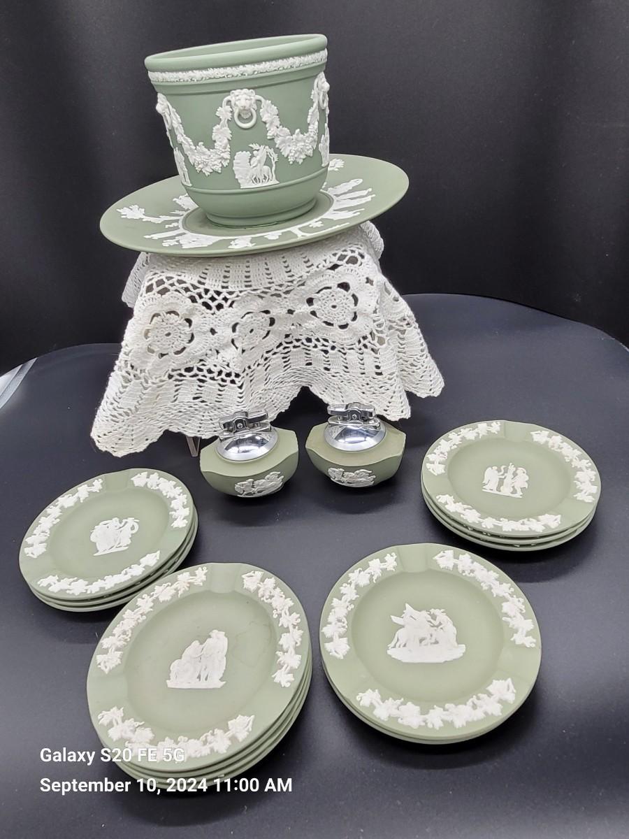 12 ashtrays - 5 different motifs, 2 lighters, and a planter on a tray.