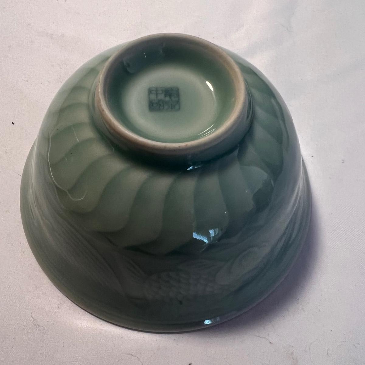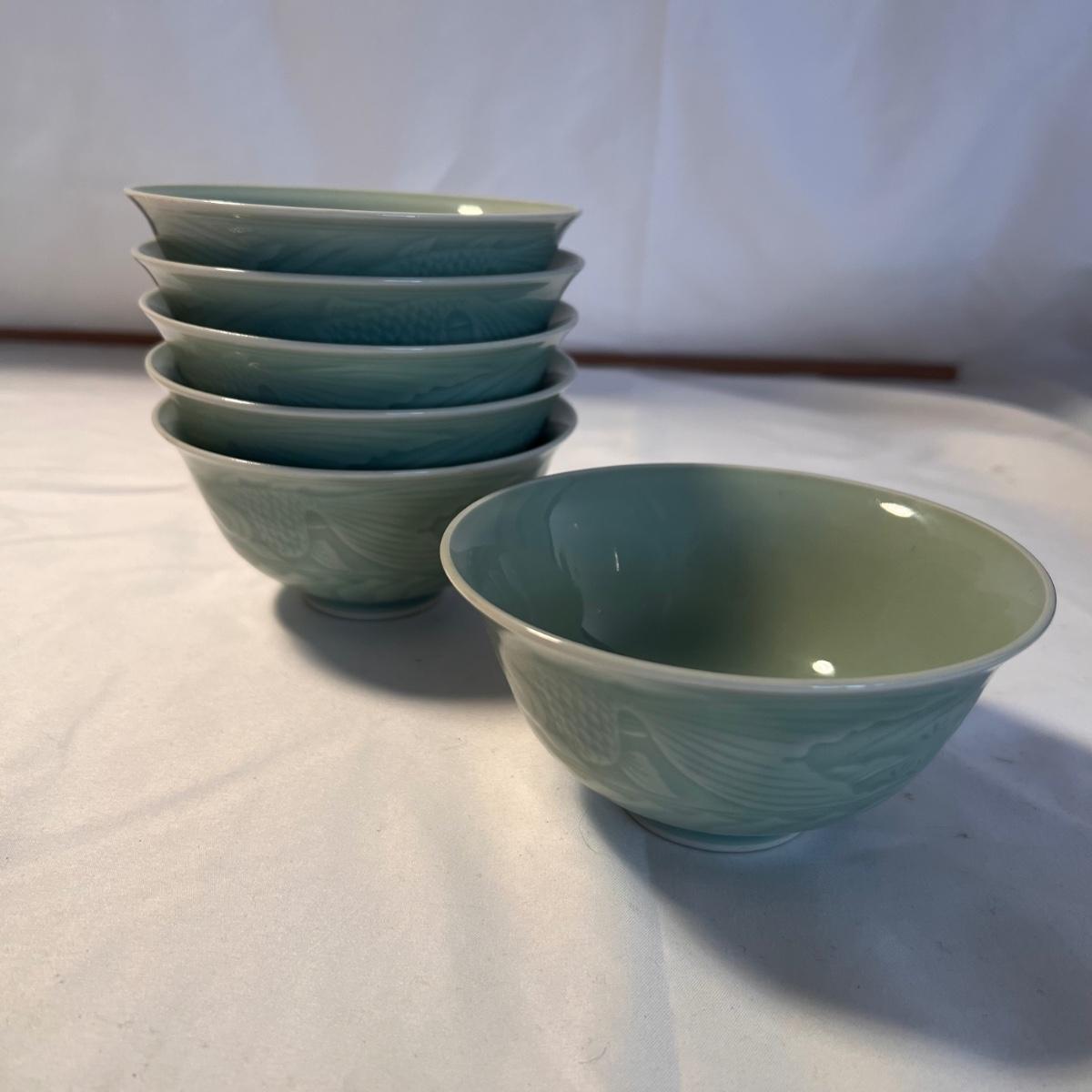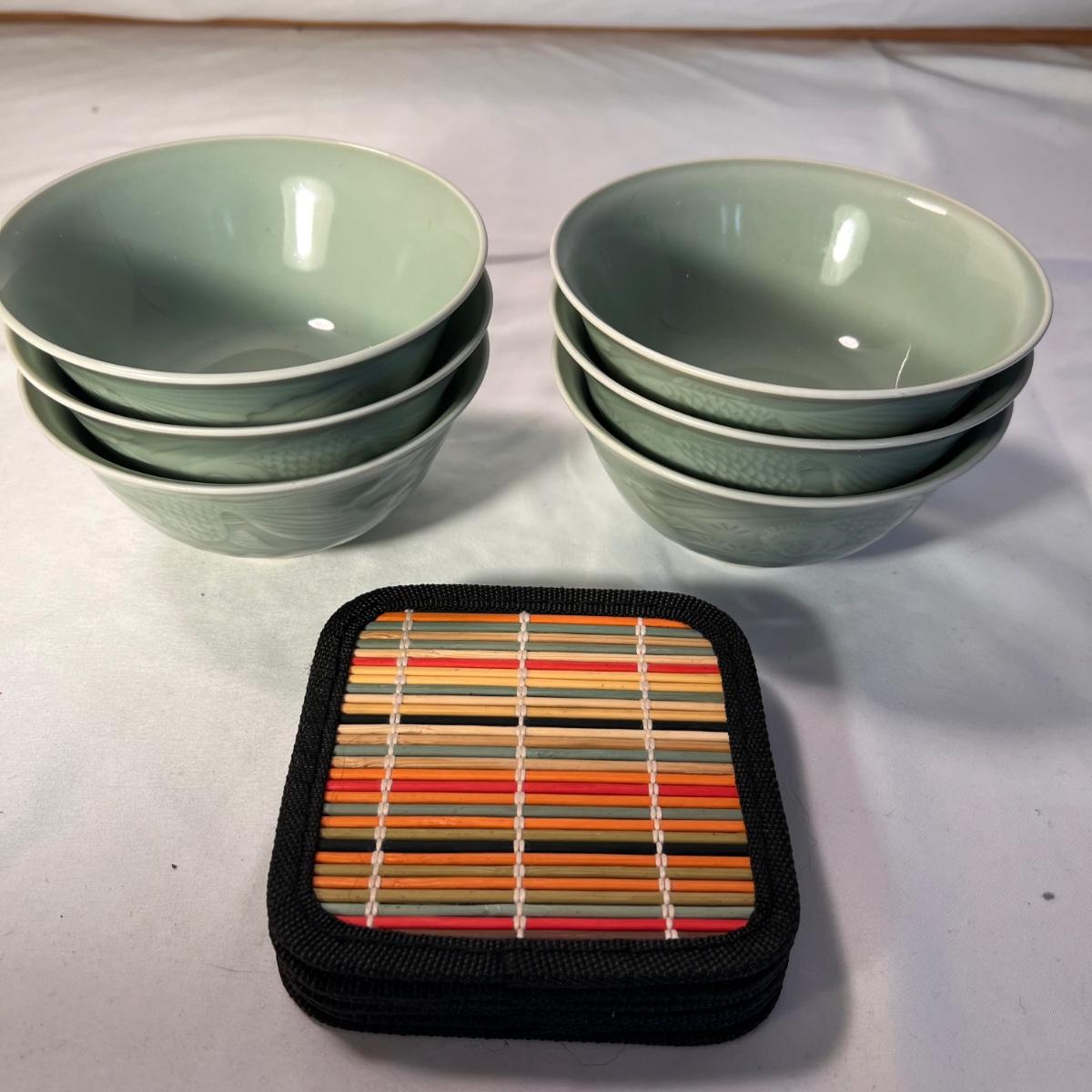 Six matching Celadon bowls have a Koi Fishbowl design; they measure 5”D x 2.5”H. All have the same makers mark on base, and one also has a sticker; note one bowl has a tiny mark which happened during production as it’s under the glaze We have paired them with six coasters made up of small pieces of rattan-like wood and held together by thread and black fabric edging.