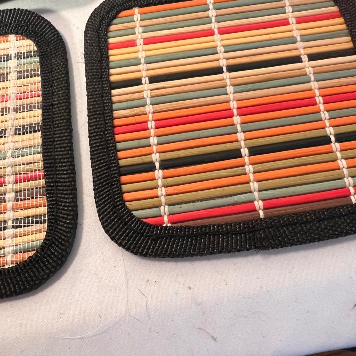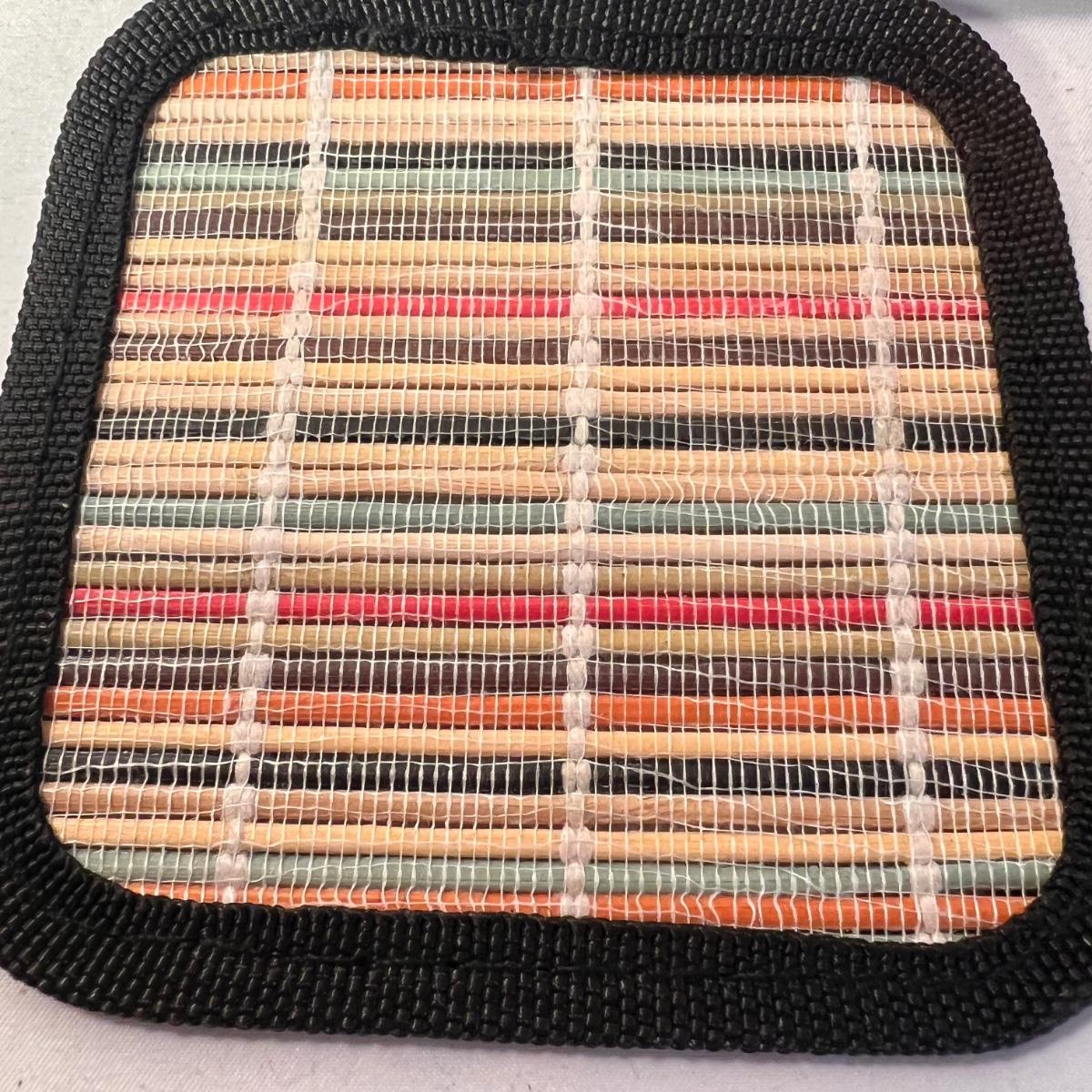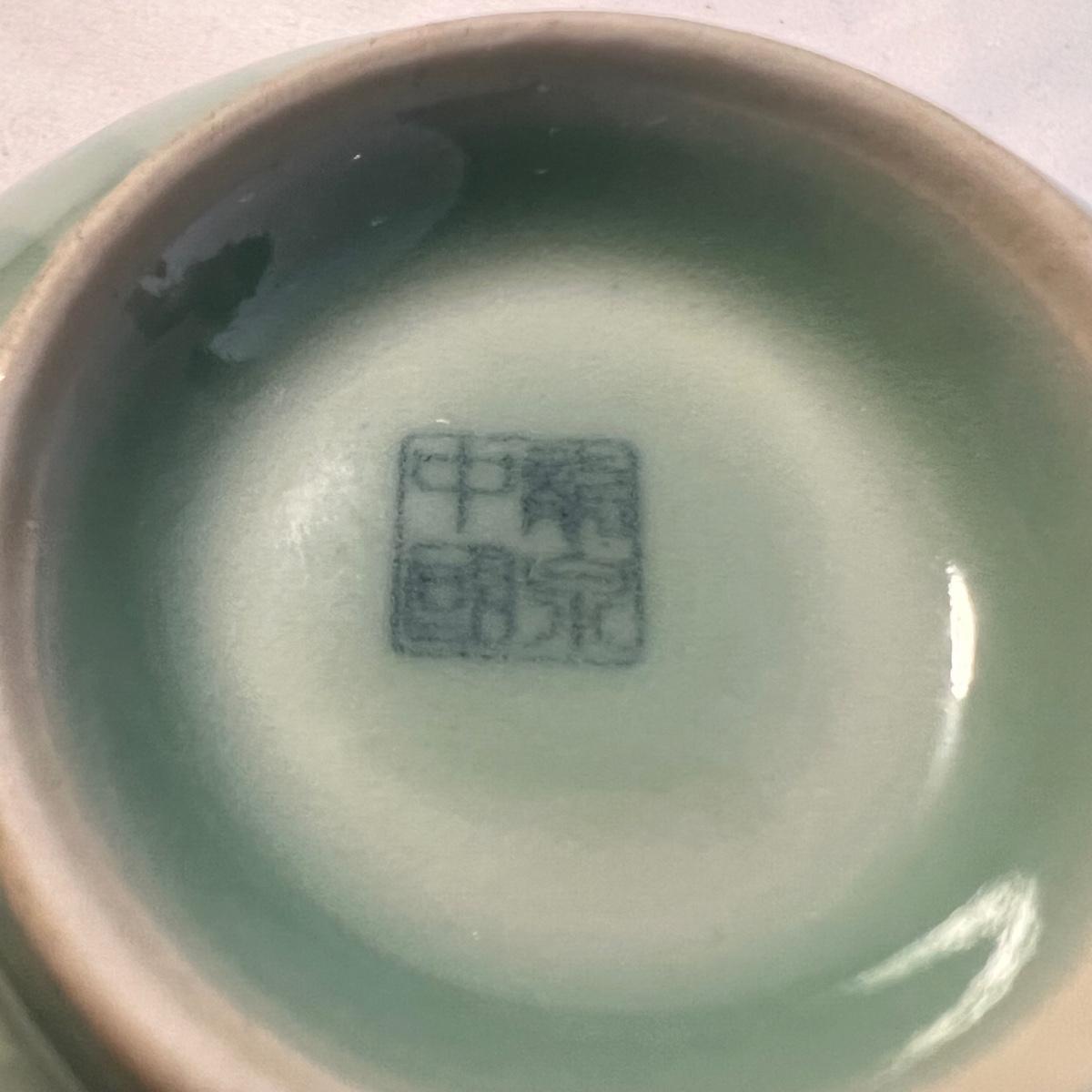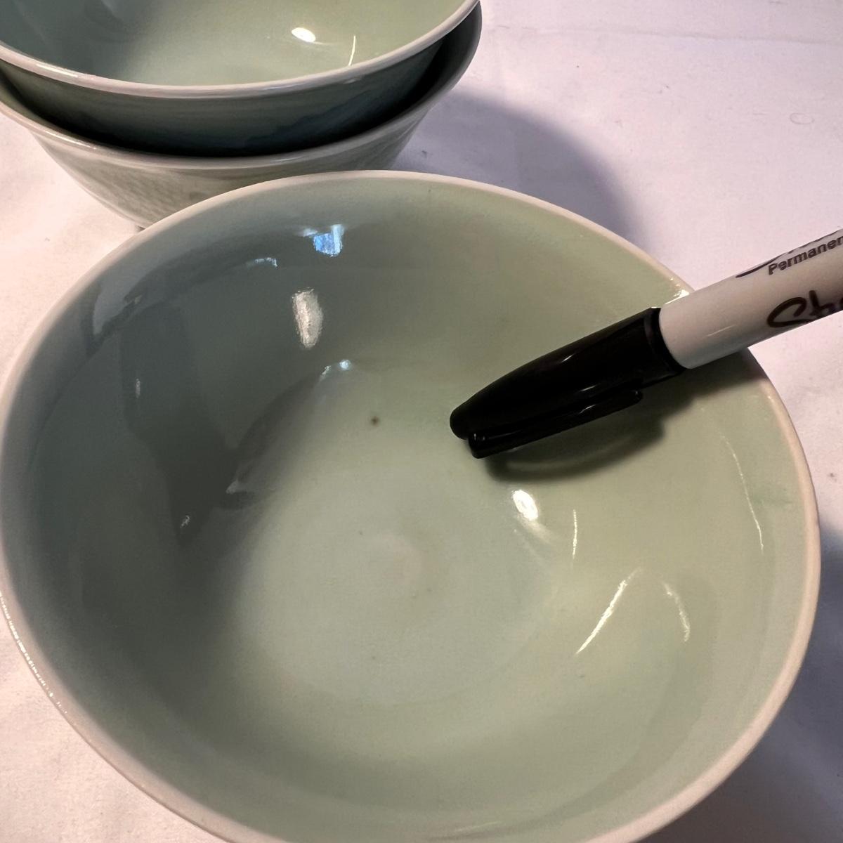 Six matching Celadon bowls have a Koi Fishbowl design; they measure 5”D x 2.5”H. All have the same makers mark on base, and one also has a sticker; note one bowl has a tiny mark which happened during production as it’s under the glaze We have paired them with six coasters made up of small pieces of rattan-like wood and held together by thread and black fabric edging.