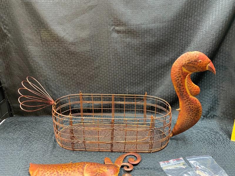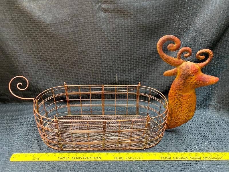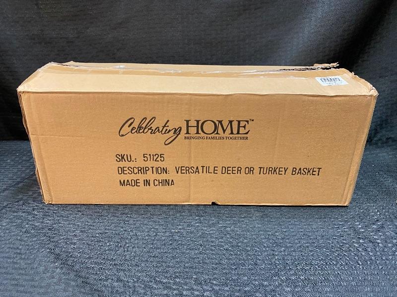 Versatile deer or turkey basket from Celebrating Home. Comes in original box. Metal oblong basket. Attachable deer or turkey heads and tails. Quite large, basket alone is 19" long.