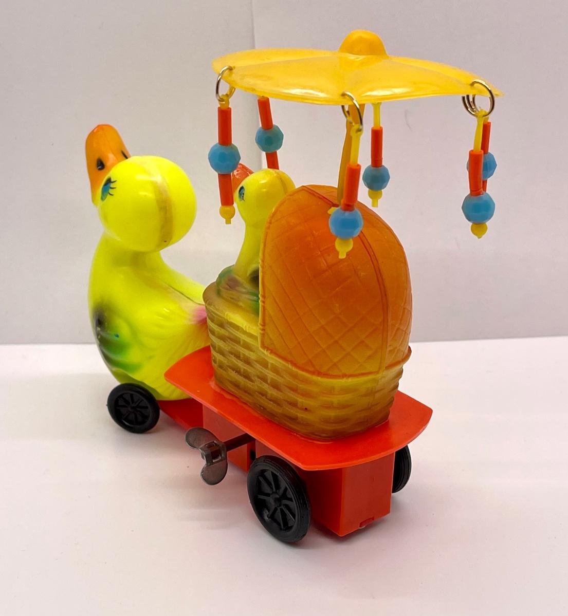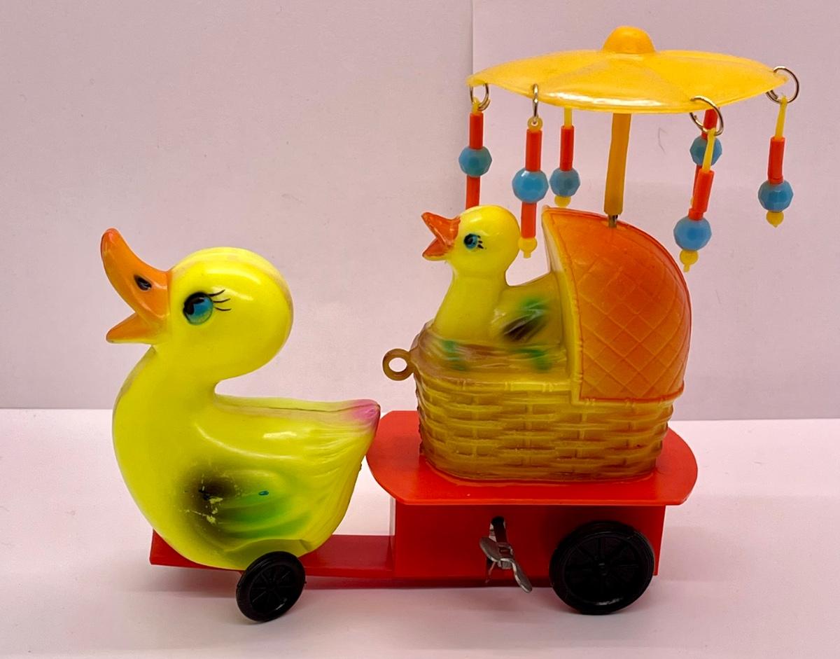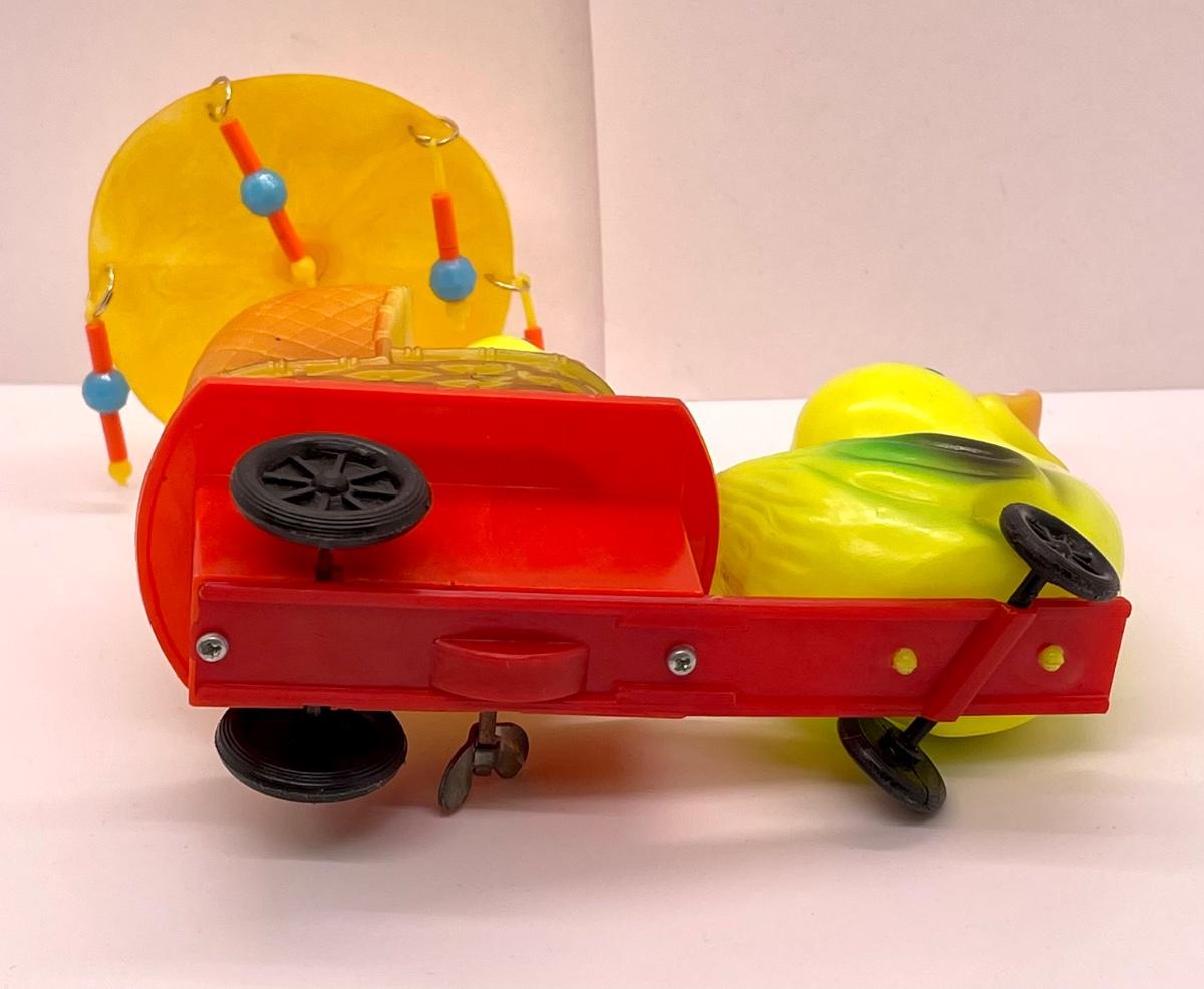 Celluloid plastic wind-up toy Mama pulling wagon of baby ducklings