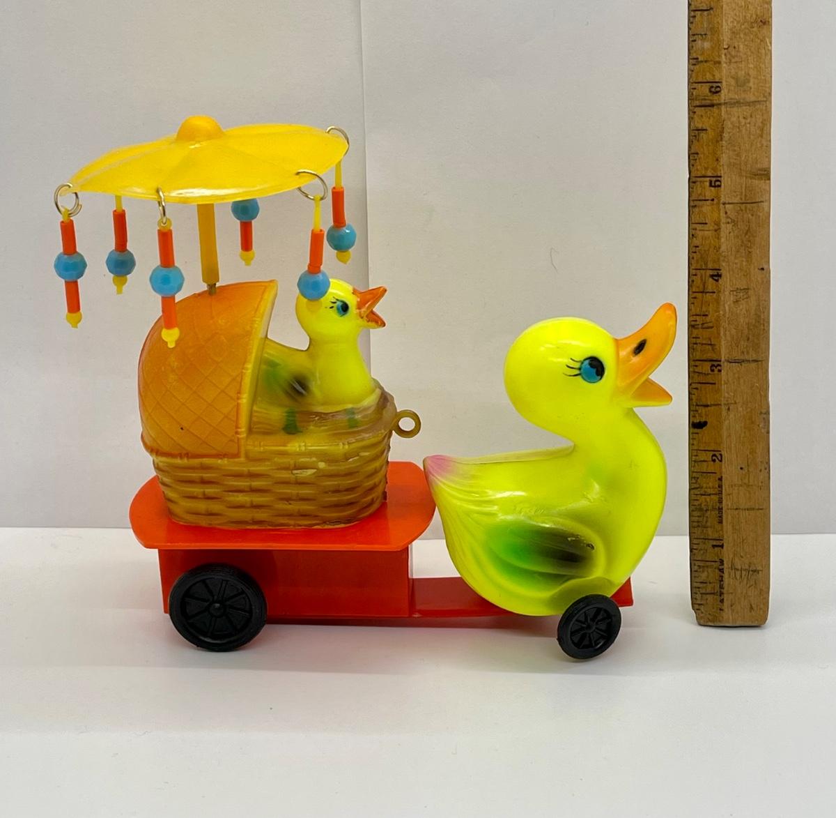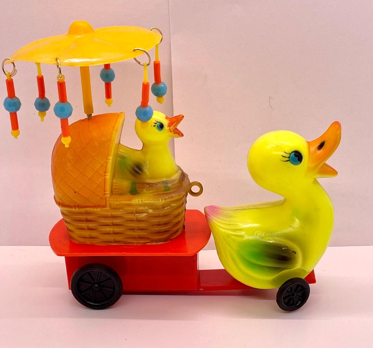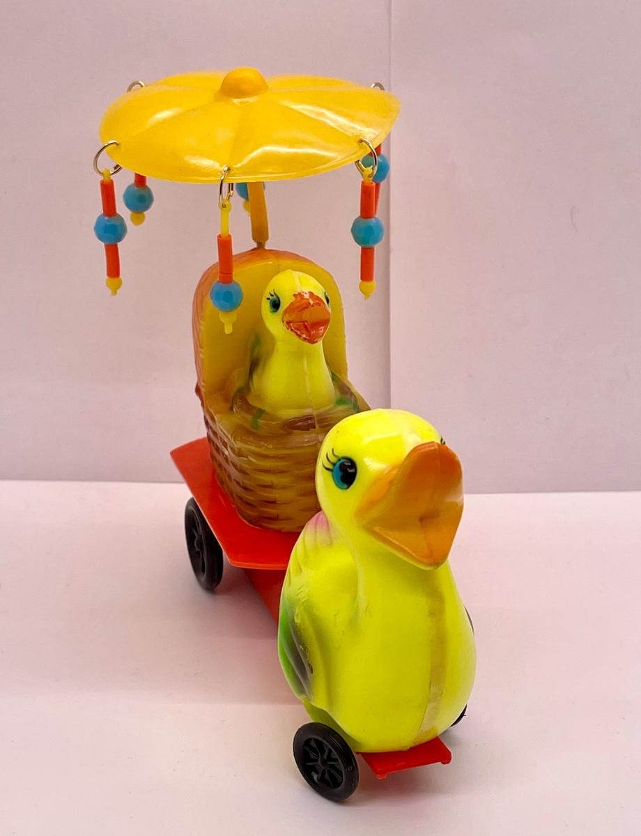 Celluloid plastic wind-up toy Mama pulling wagon of baby ducklings