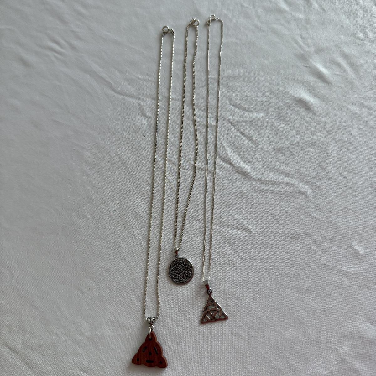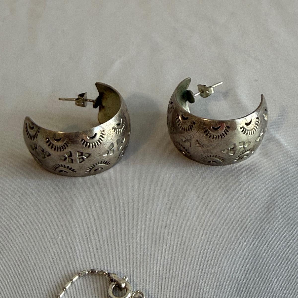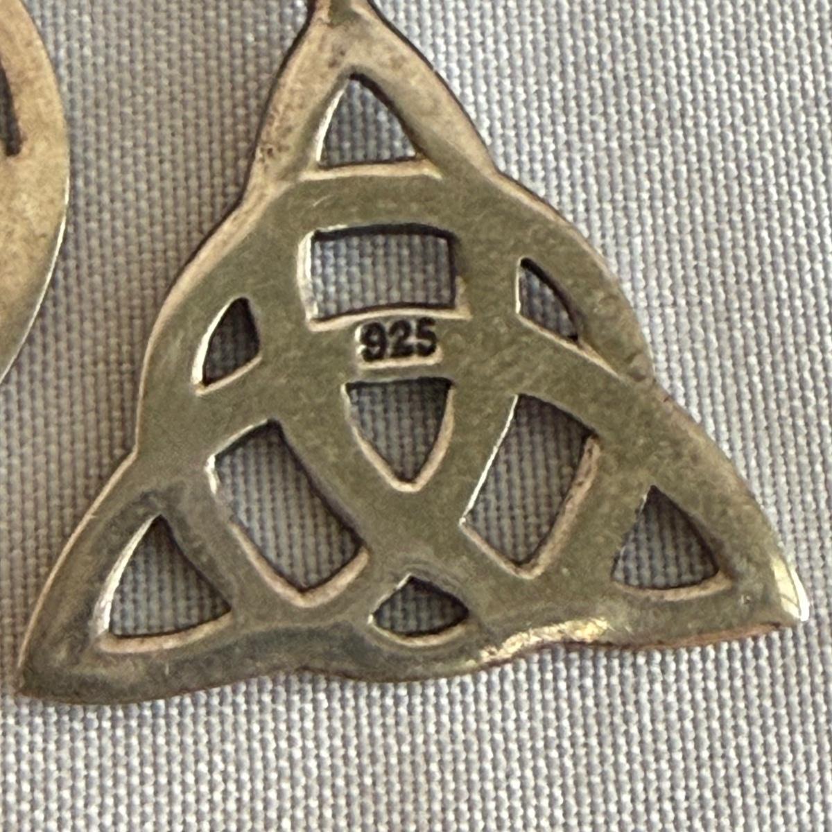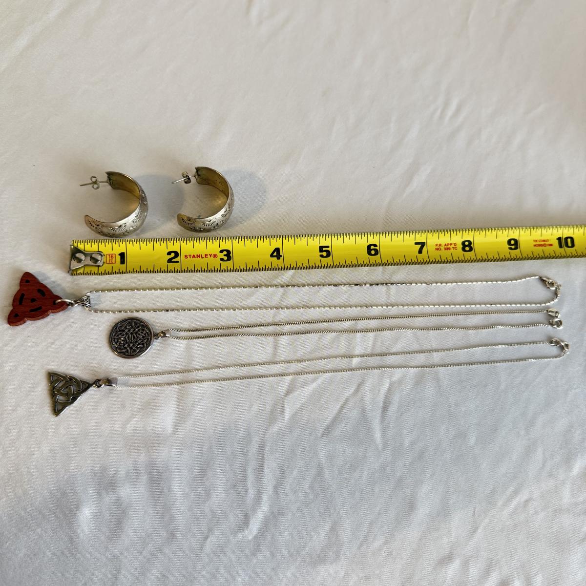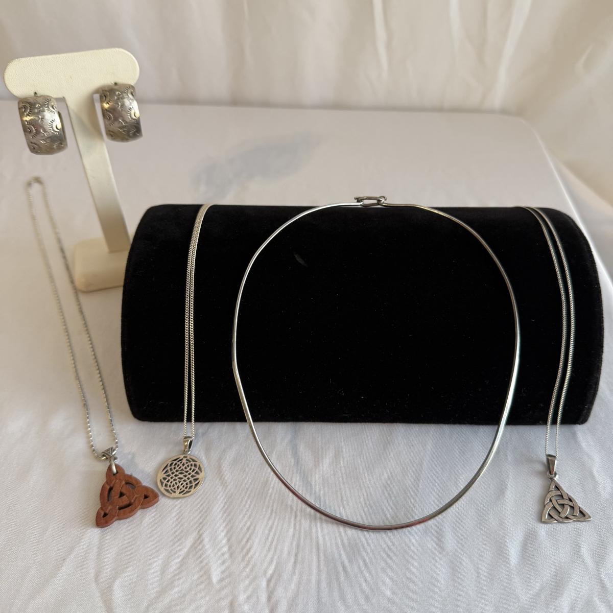Two trinity pendants and an infinity circle pendant on chains marked 925 plus large half-cuff earrings for pierced ears with Native American-like stamp design and a 925 choker. One pendant is carved wood and all other items are silver and marked 925 with other markings as well. See images. All sales are final. No returns or refunds. Please bid accordingly. Shipping available.