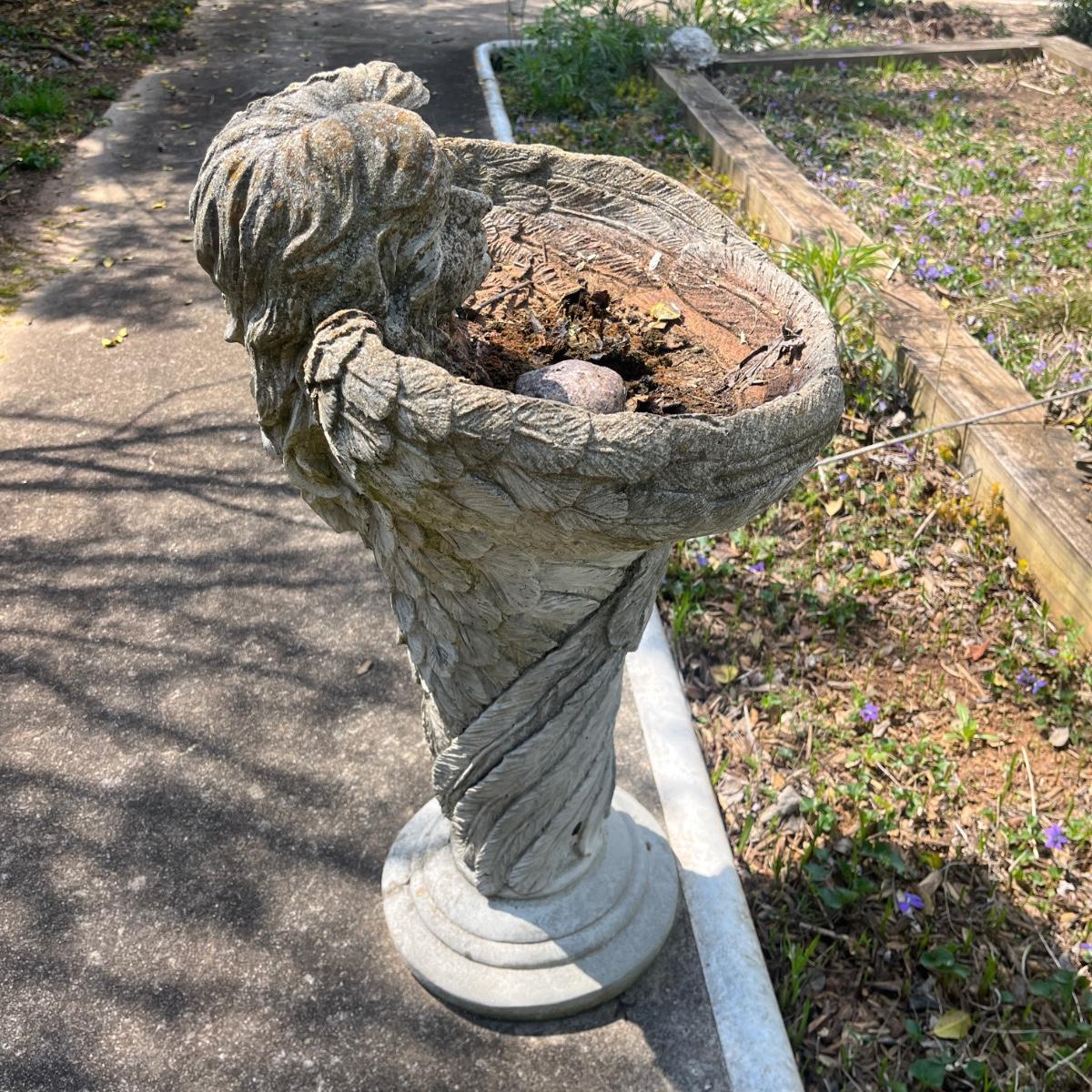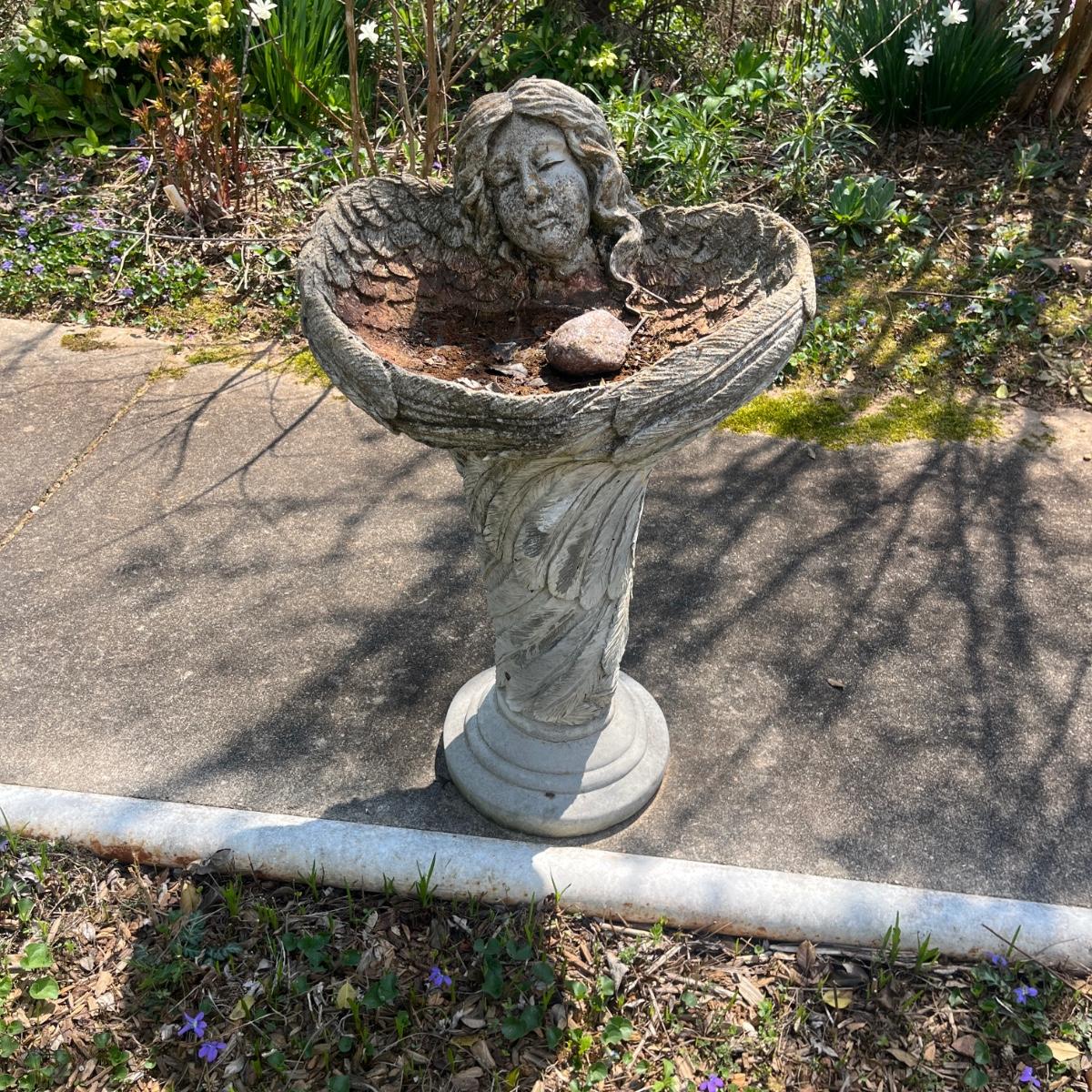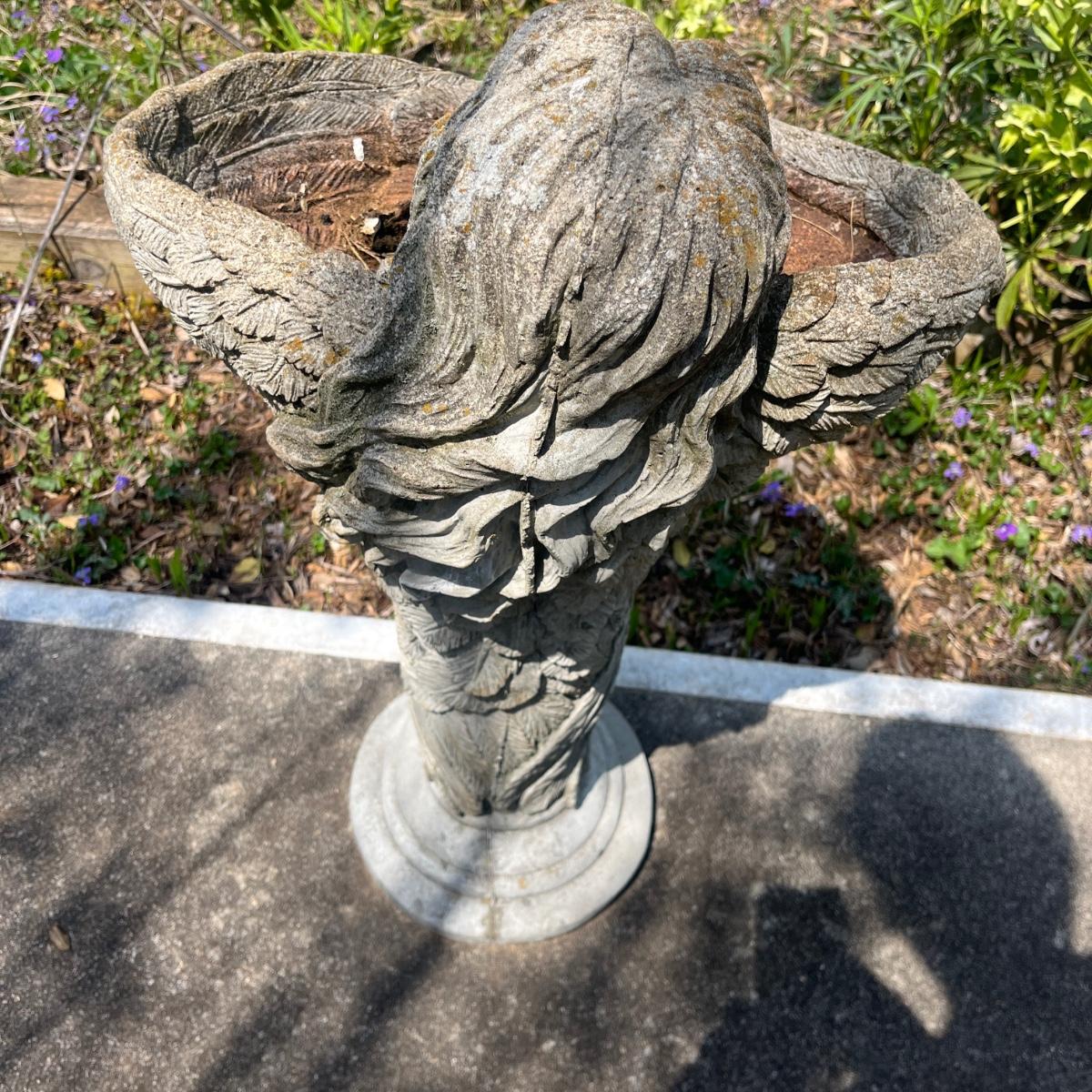 Lot includes a cement angel birdbath that measures 17” x 15” x 30”H. This is one solid piece.