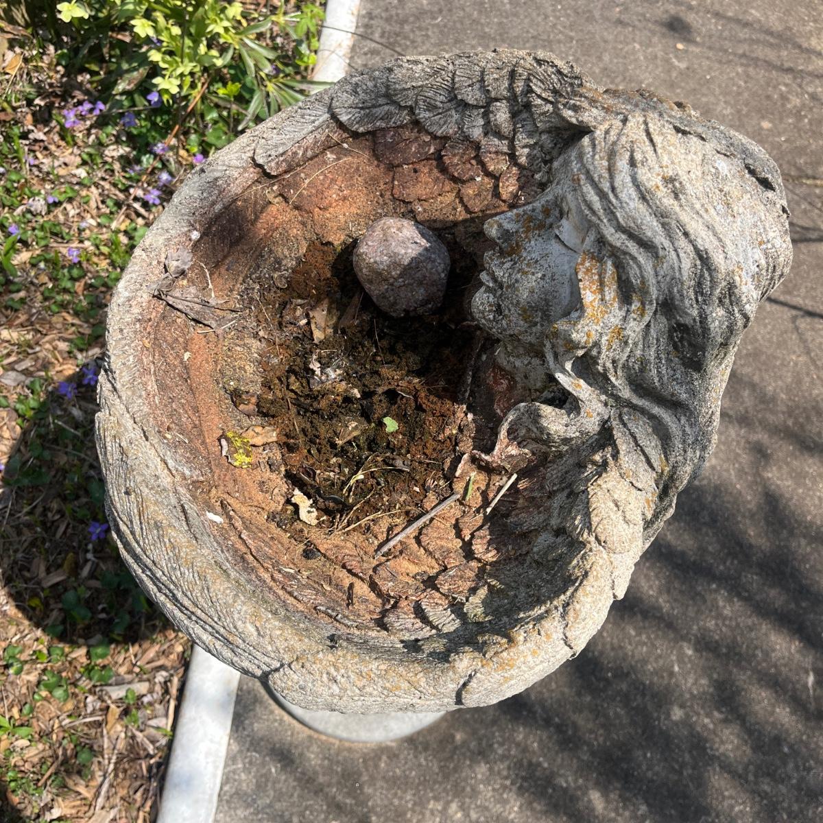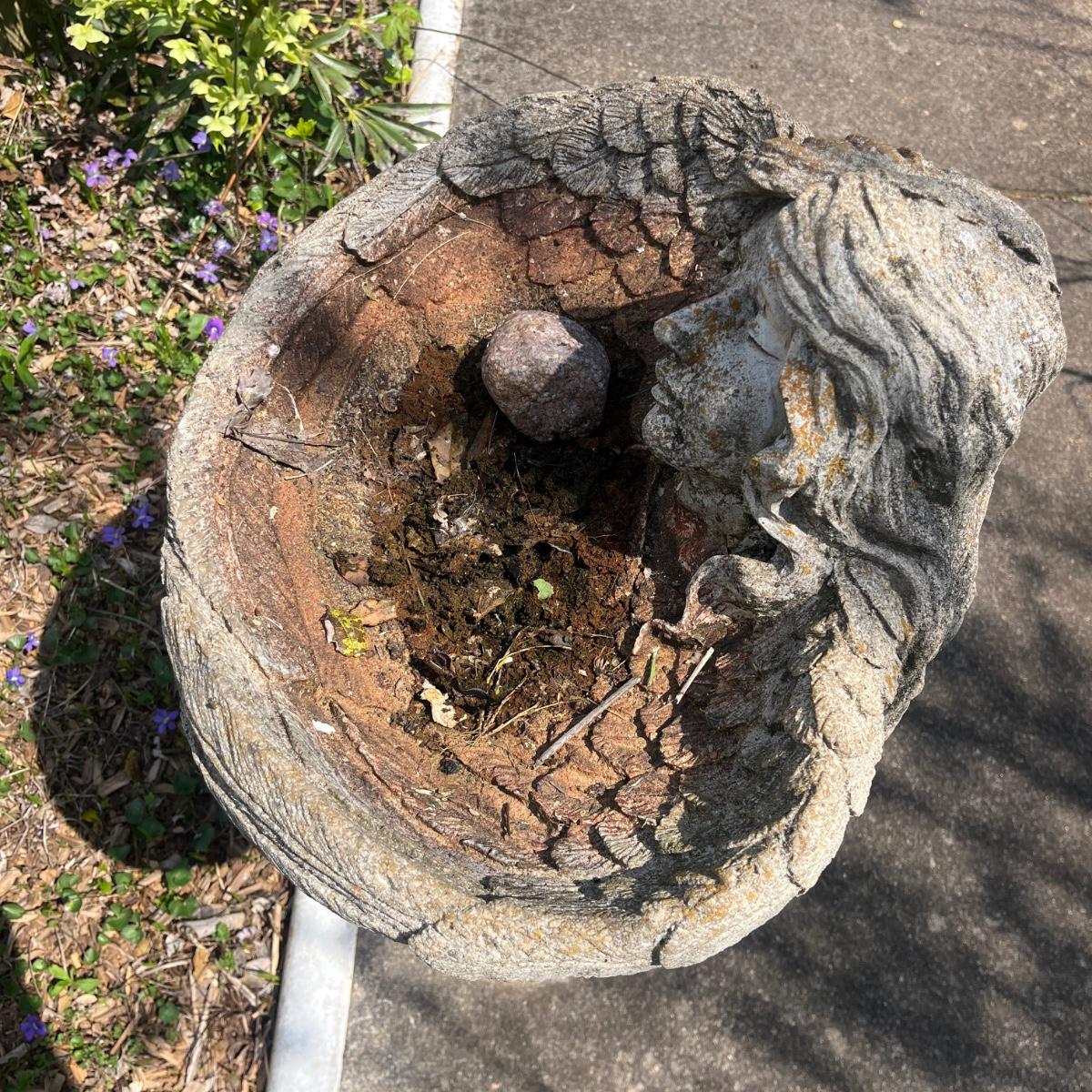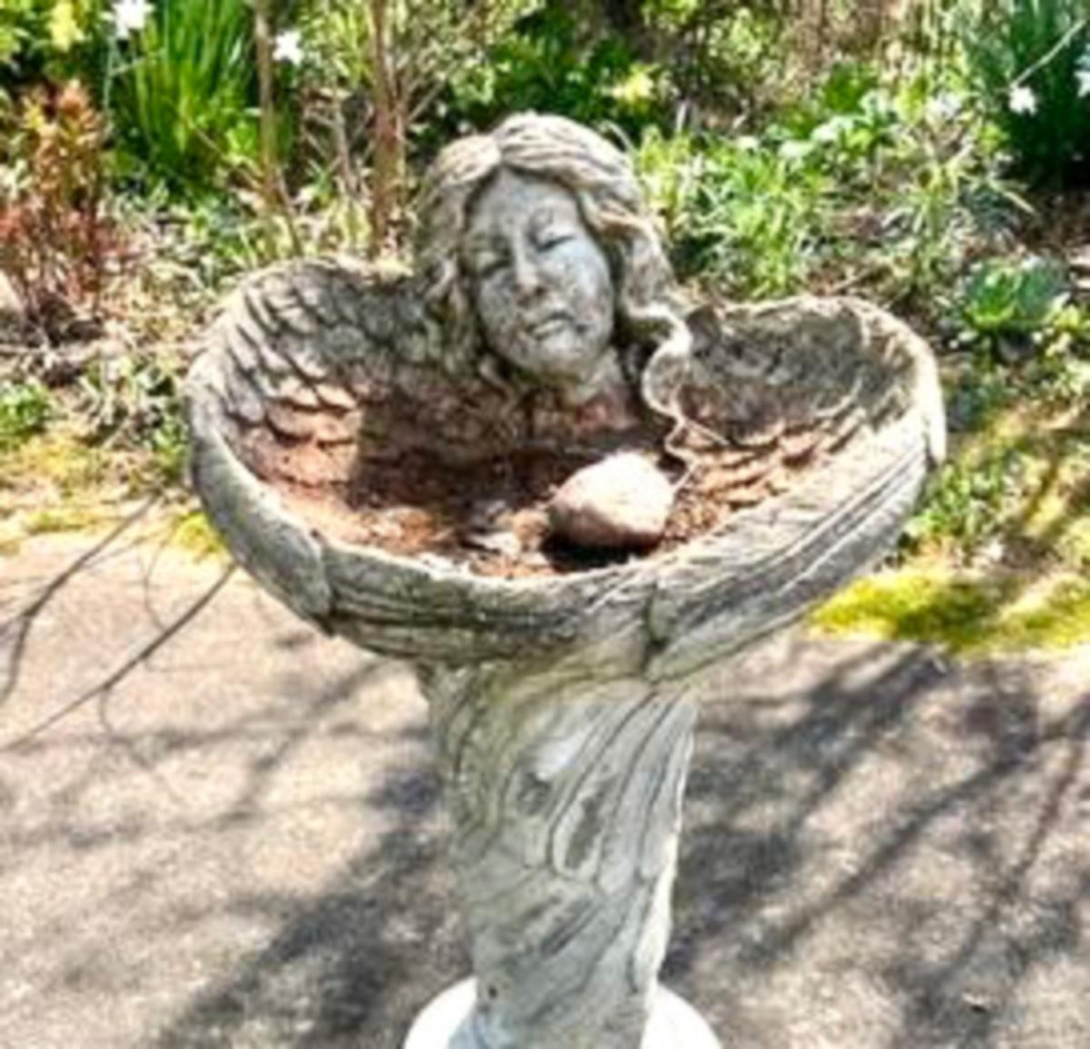 Lot includes a cement angel birdbath that measures 17” x 15” x 30”H. This is one solid piece.
