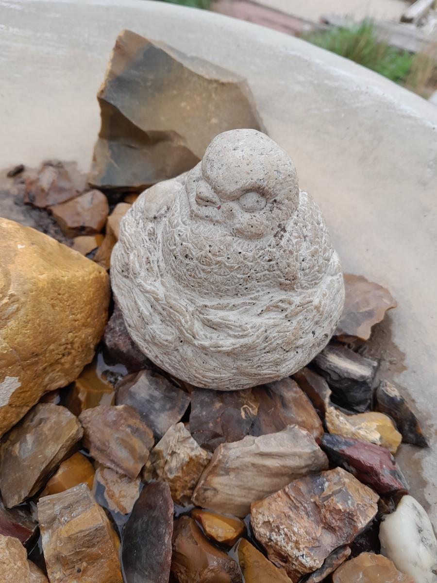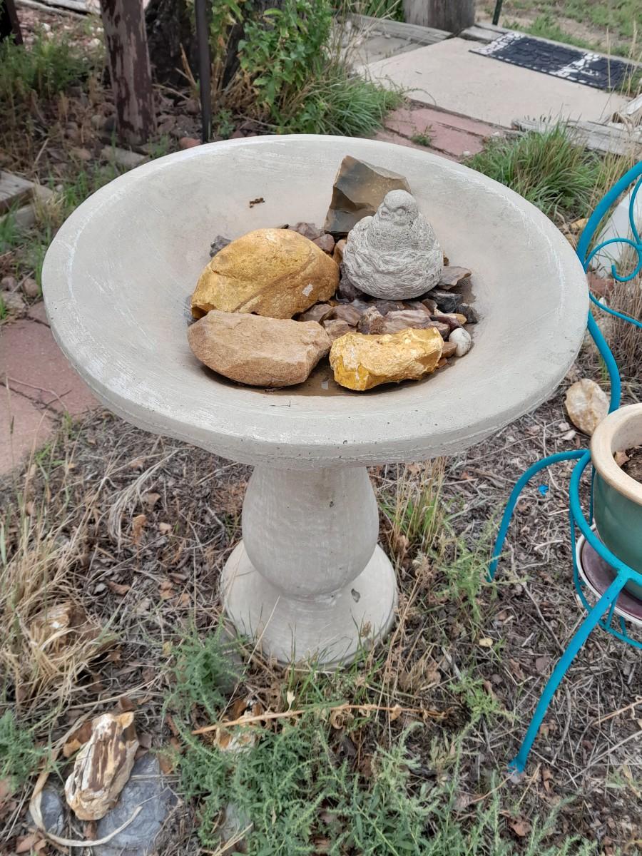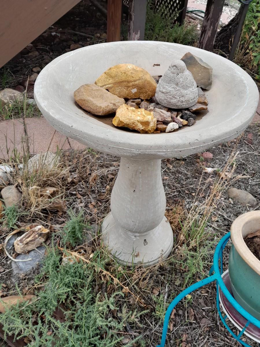 19" STAND X 23" BOWL CEMENT BIRD BATH, BIRD FIGURE, BIRD FEEDER AND GARDEN HOOK