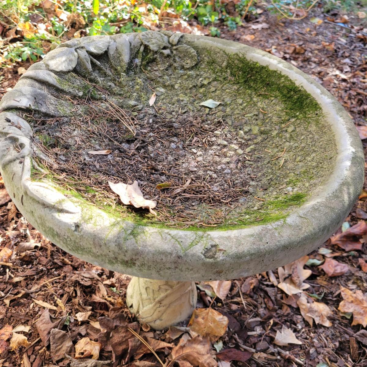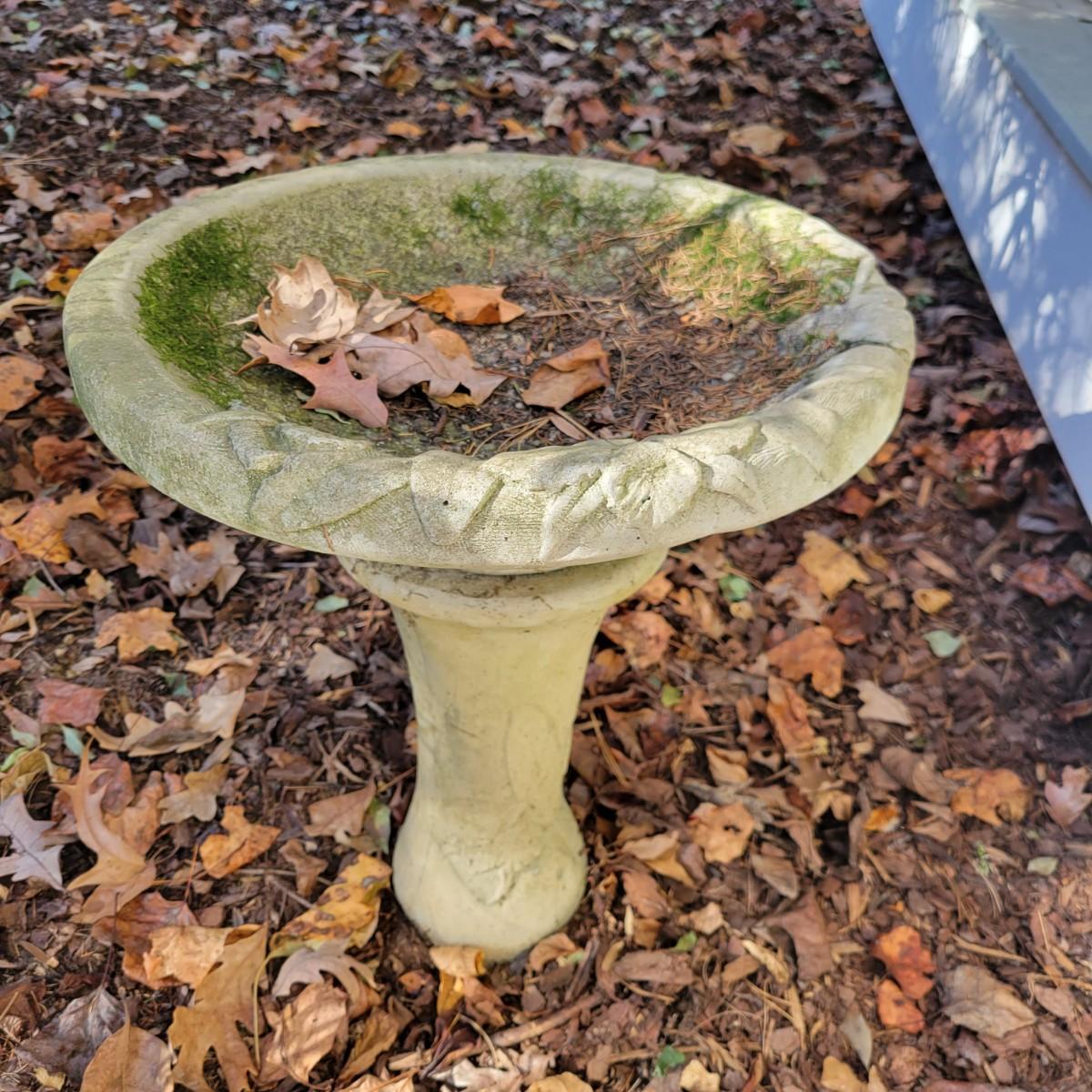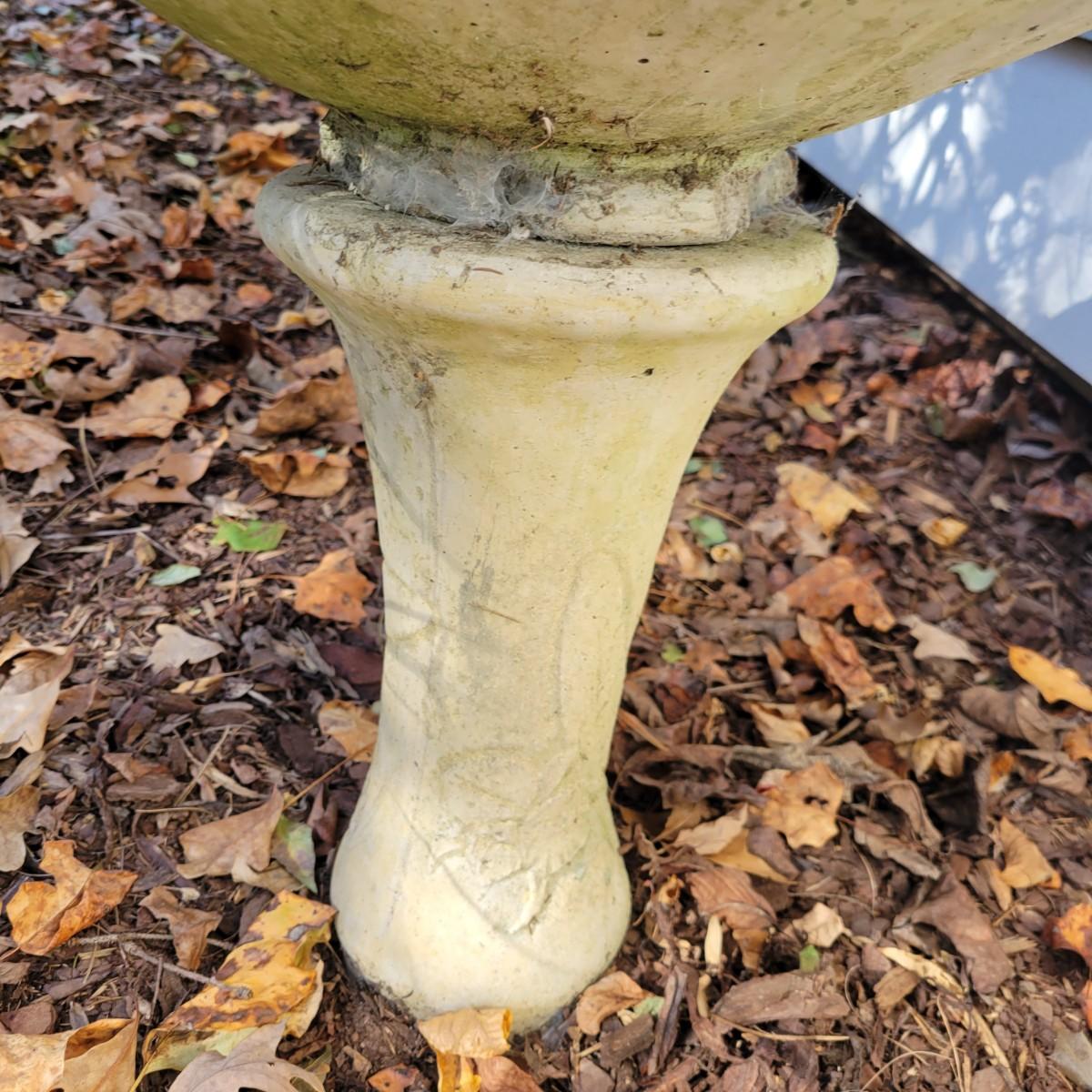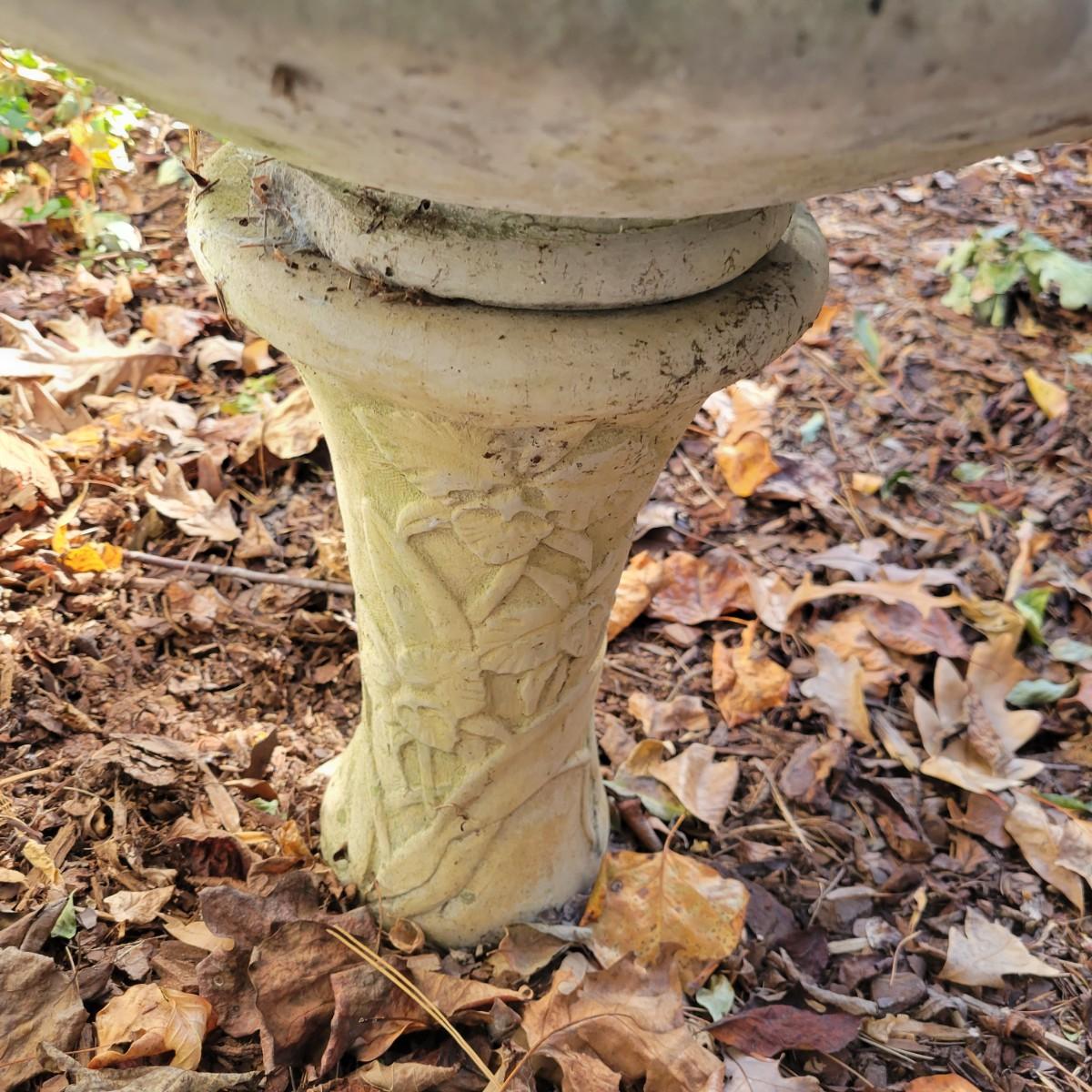 A cement bird bath that has a floral motif. It measures approximately 17"D x 23.5"H. Bath comes apart for transport. Local pickup only