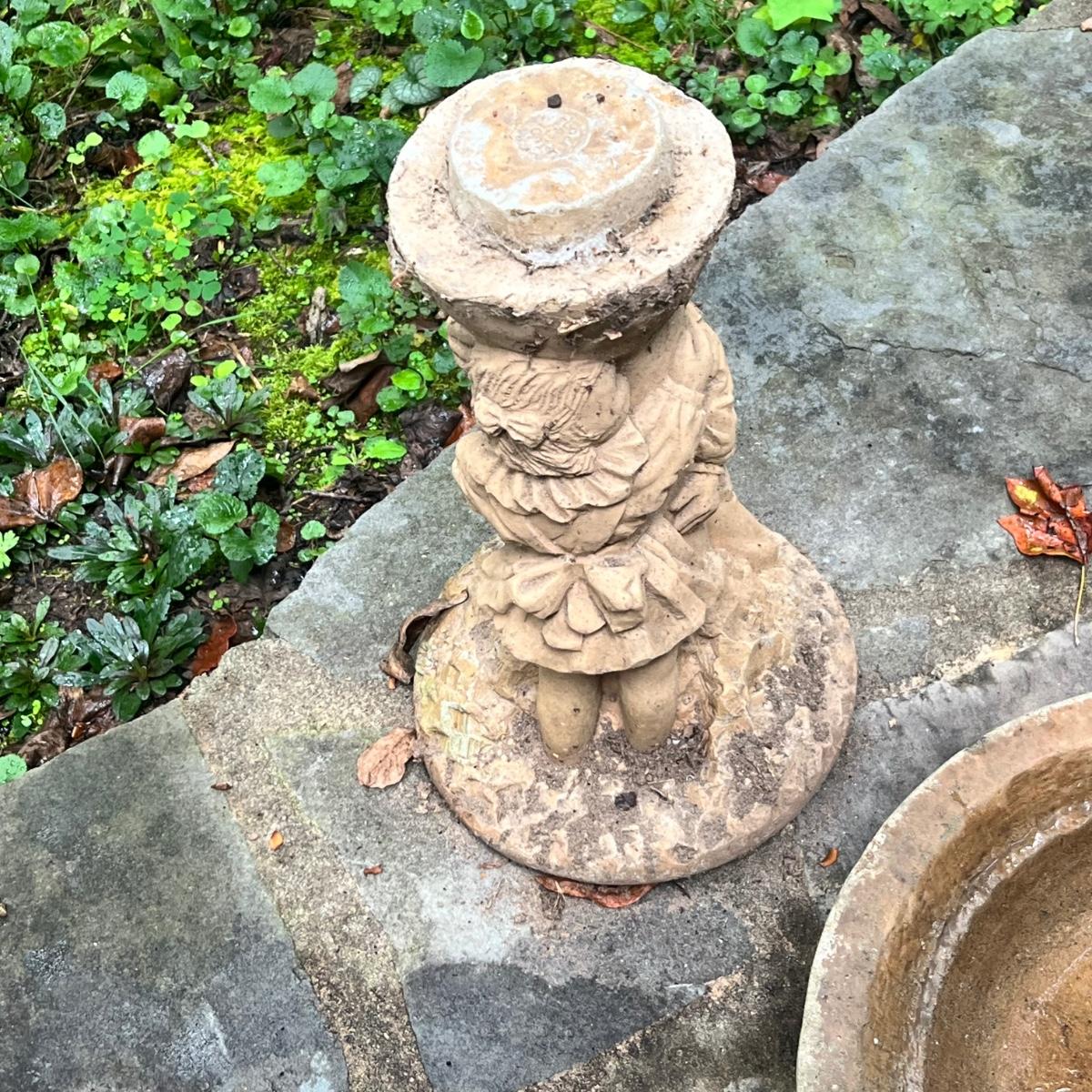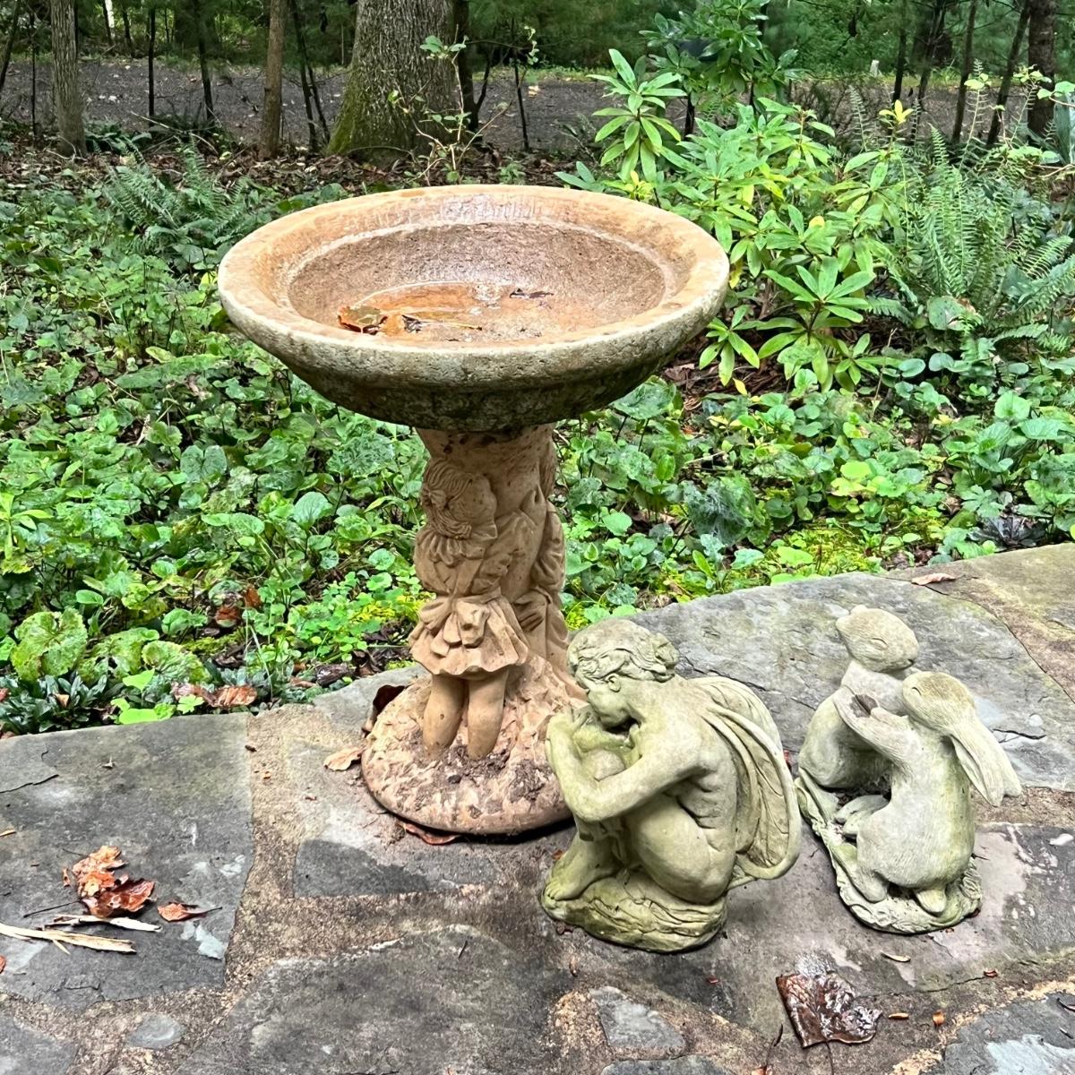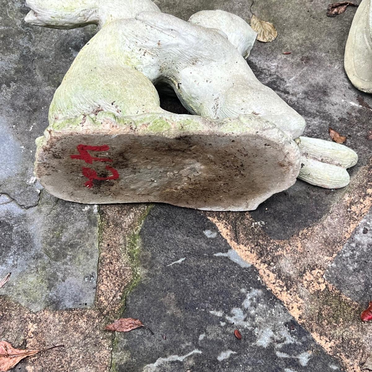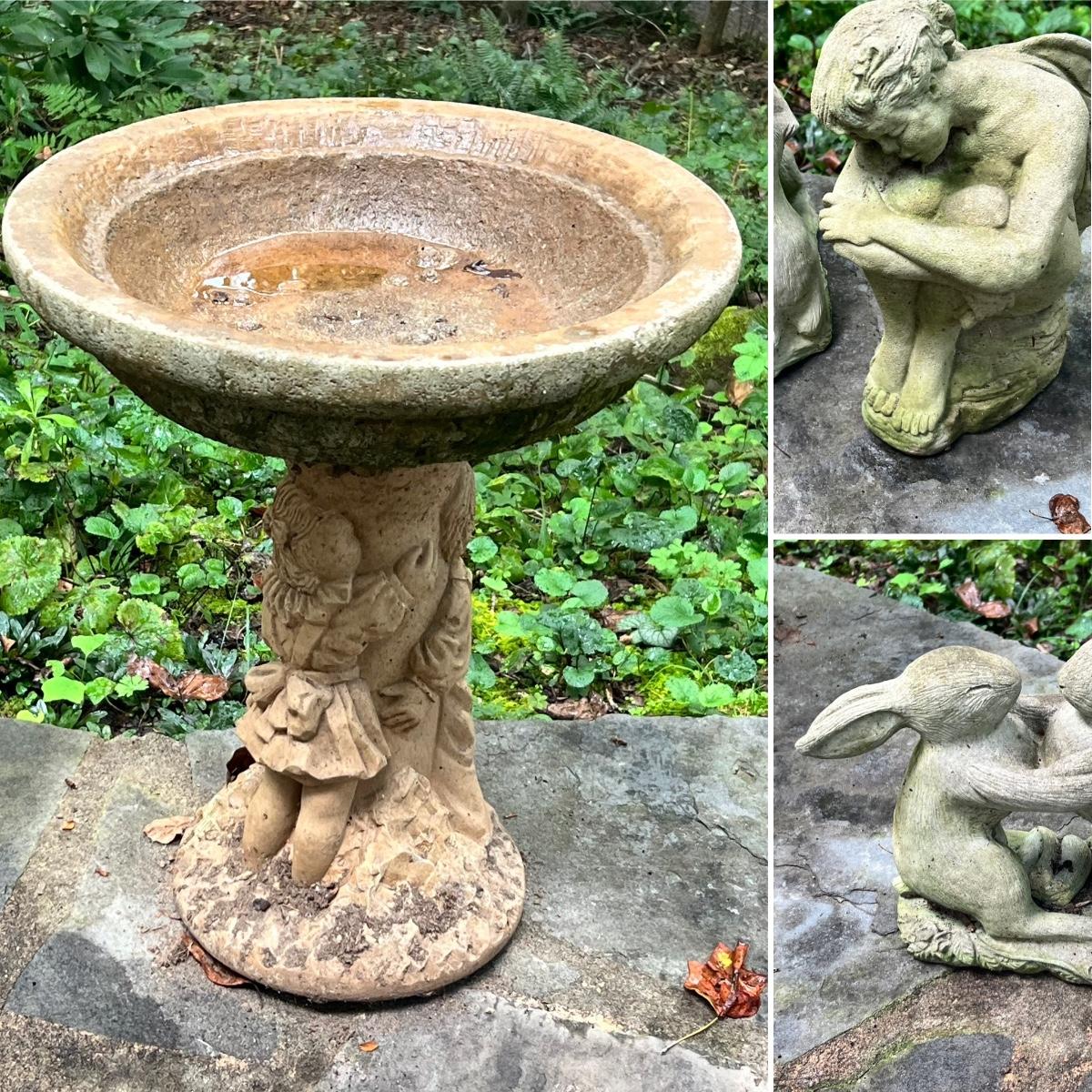 Three cement yard art items in this trio. The birdbath is very sturdy and the top comes off. Two sculptures include a fairy or angel and a pair of rabbits. Note the ears have broken off one of the bunnies but it is a clean break and ears are included.
