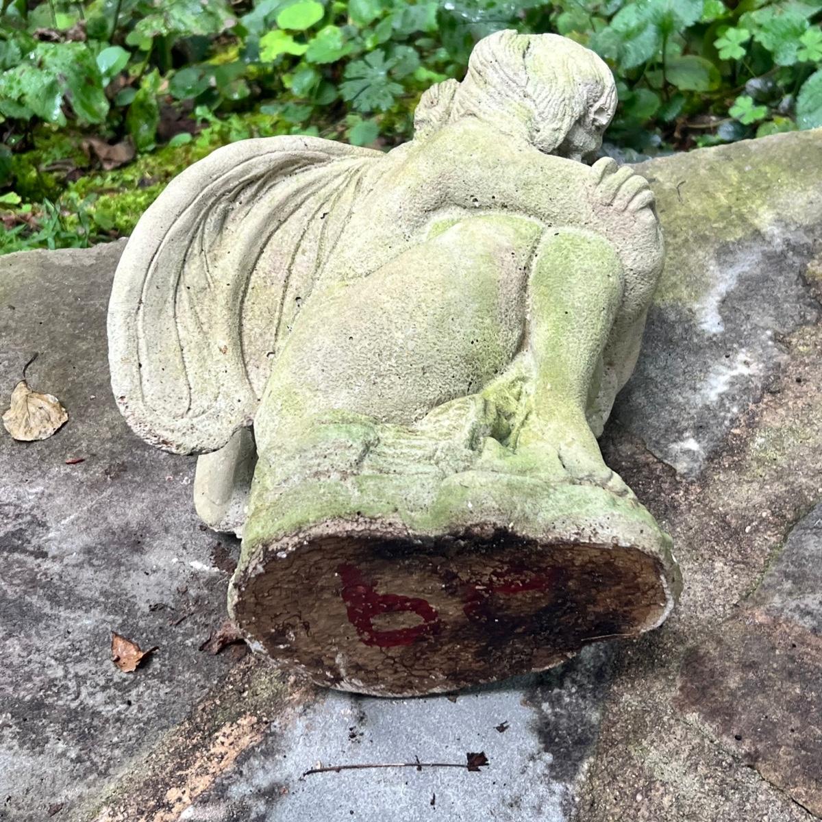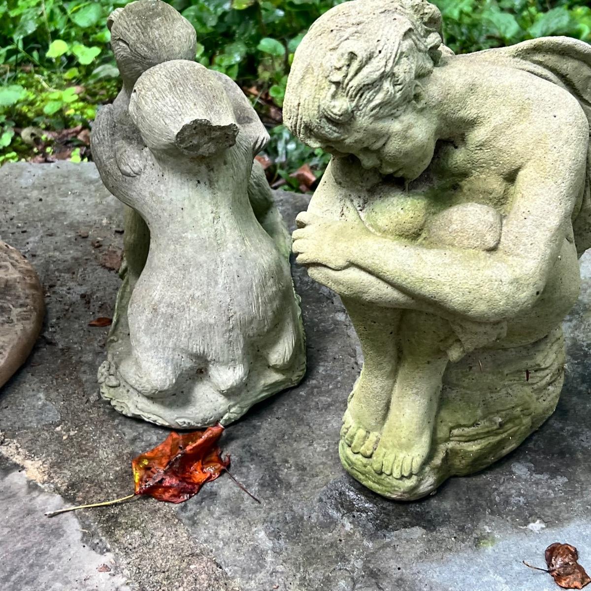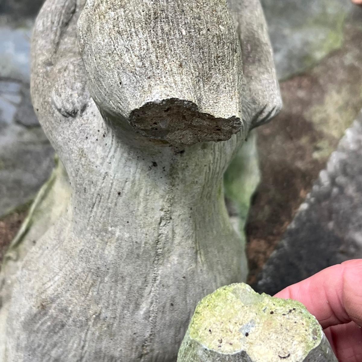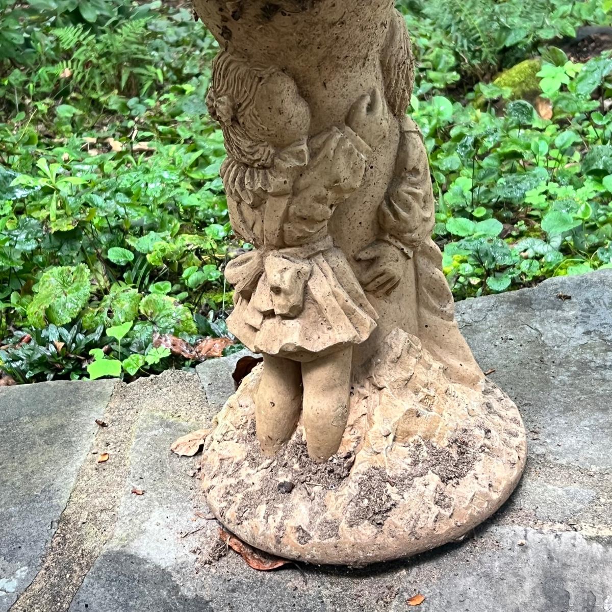 Three cement yard art items in this trio. The birdbath is very sturdy and the top comes off. Two sculptures include a fairy or angel and a pair of rabbits. Note the ears have broken off one of the bunnies but it is a clean break and ears are included.