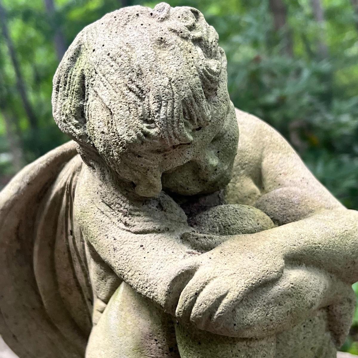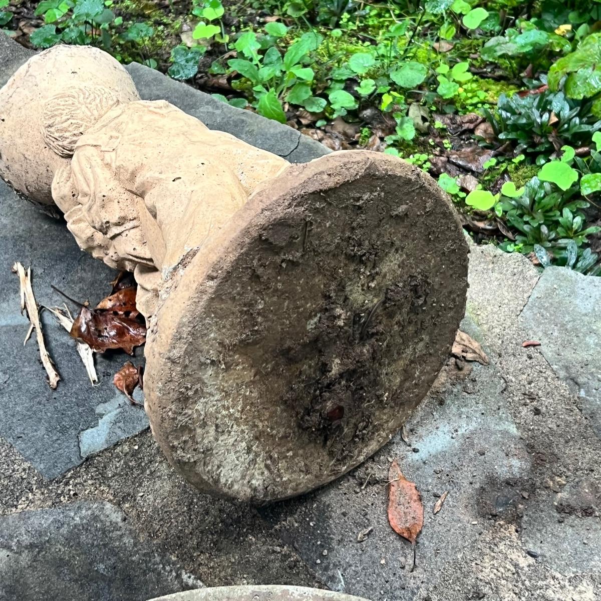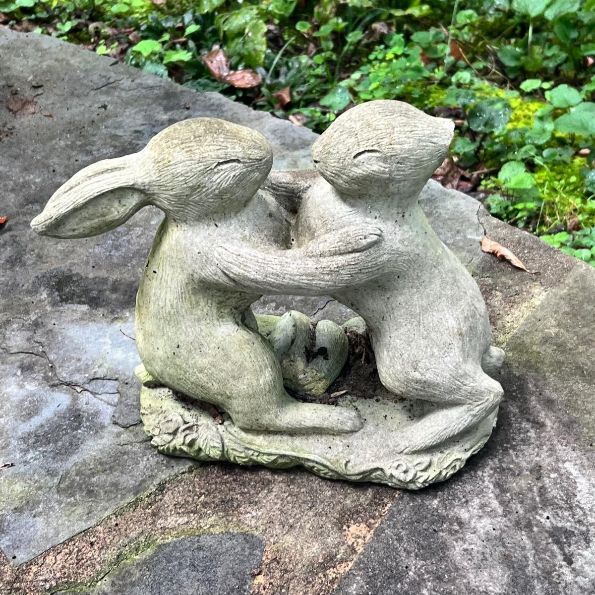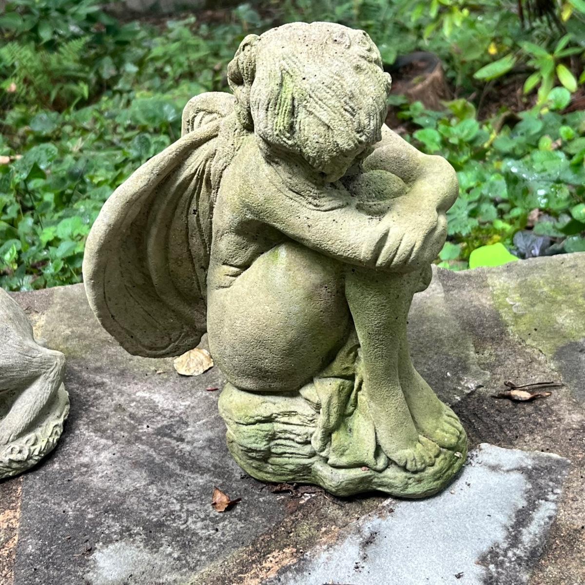 Three cement yard art items in this trio. The birdbath is very sturdy and the top comes off. Two sculptures include a fairy or angel and a pair of rabbits. Note the ears have broken off one of the bunnies but it is a clean break and ears are included.