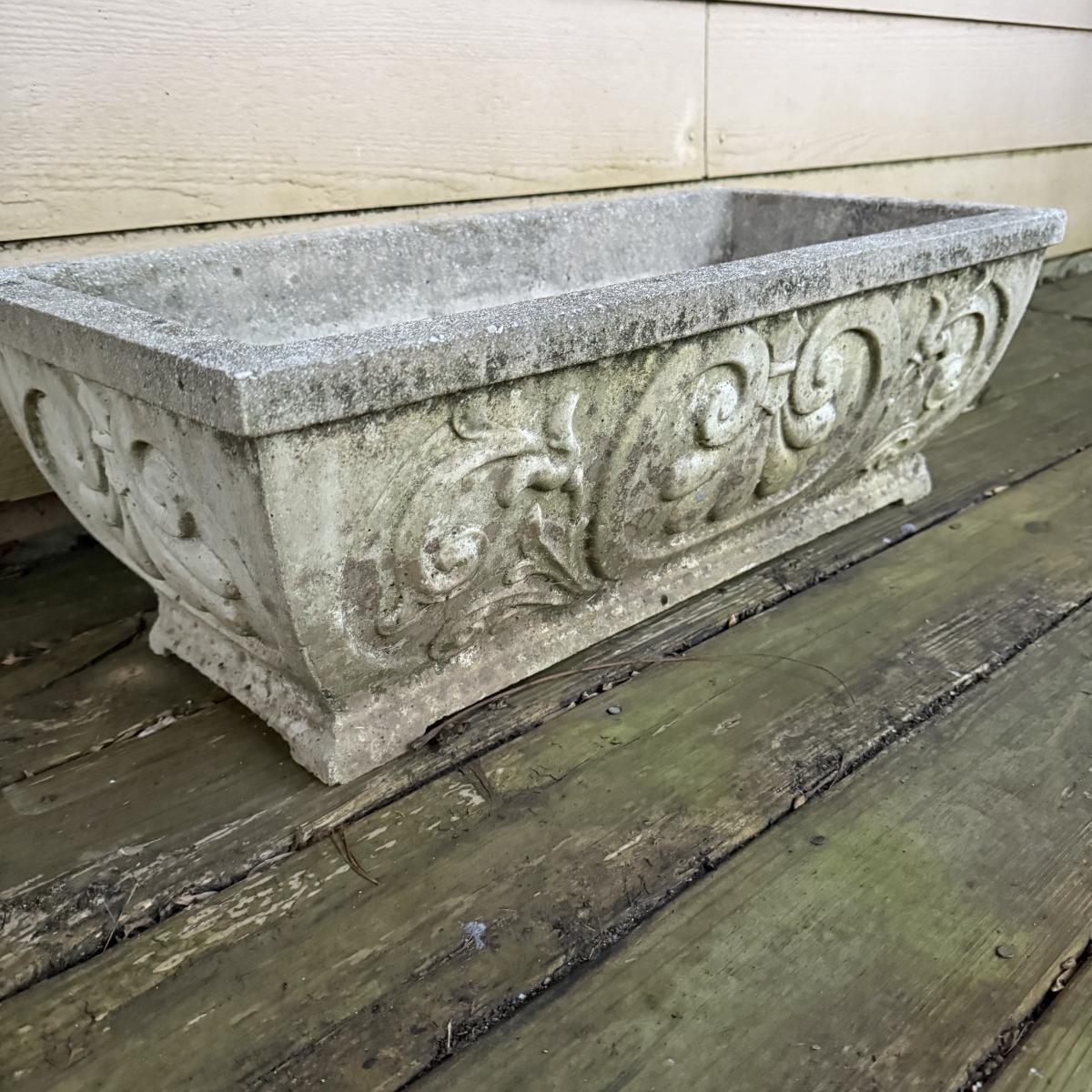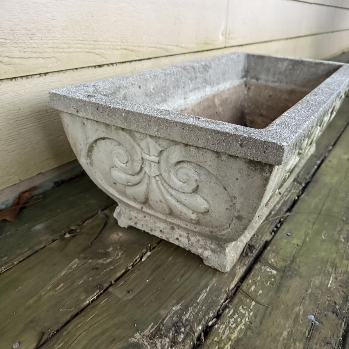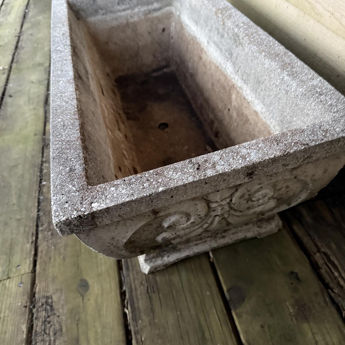 This cement fleur-de-lis designed planter is 29” x 14” x 10”H. It is dirty from outdoor use, but otherwise intact.