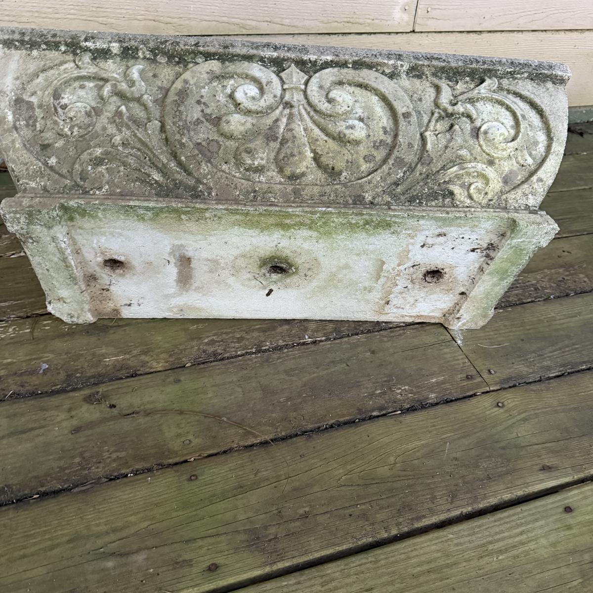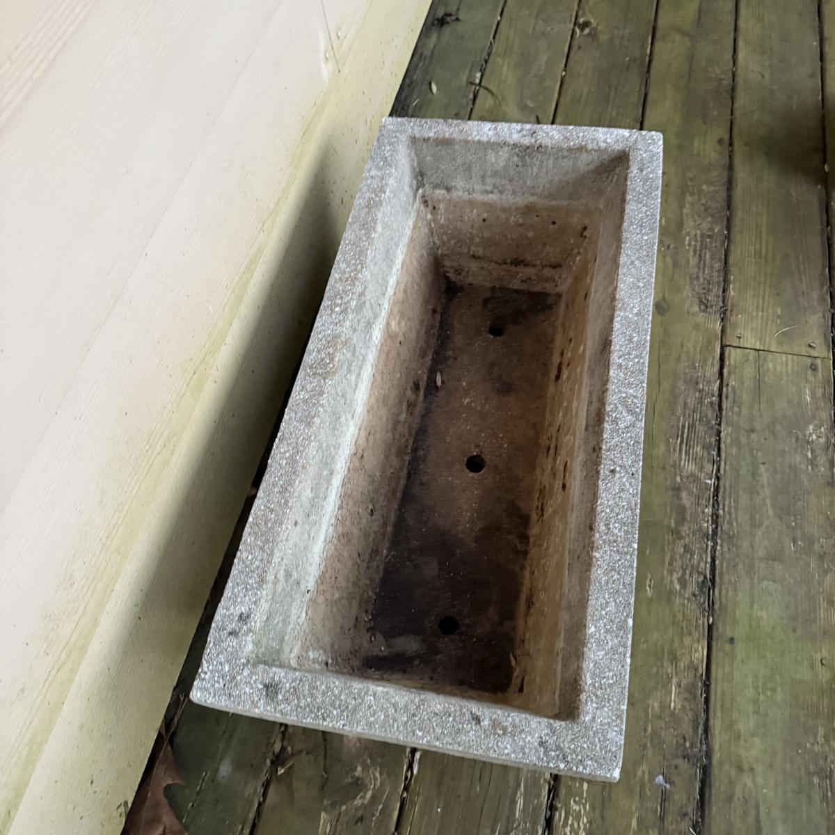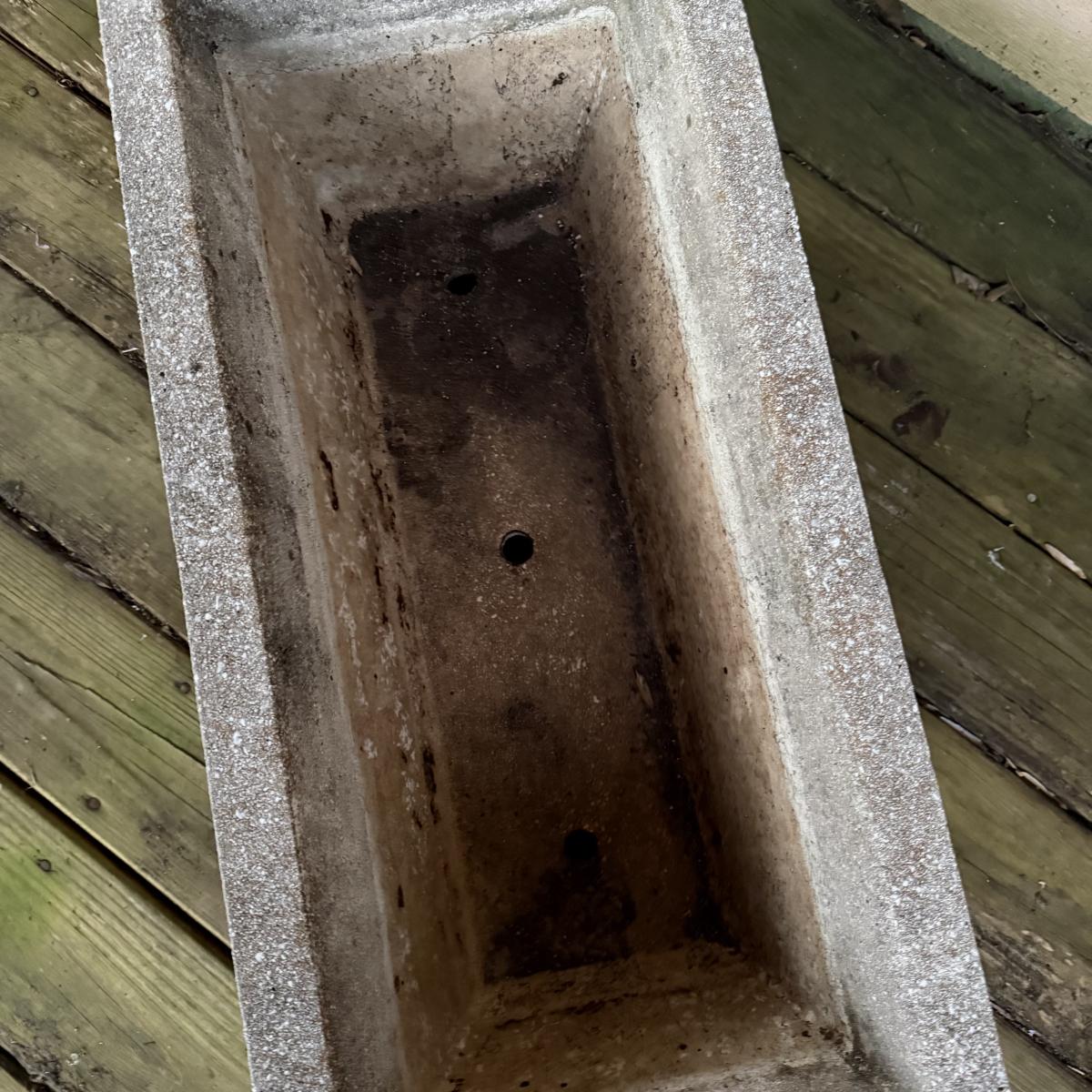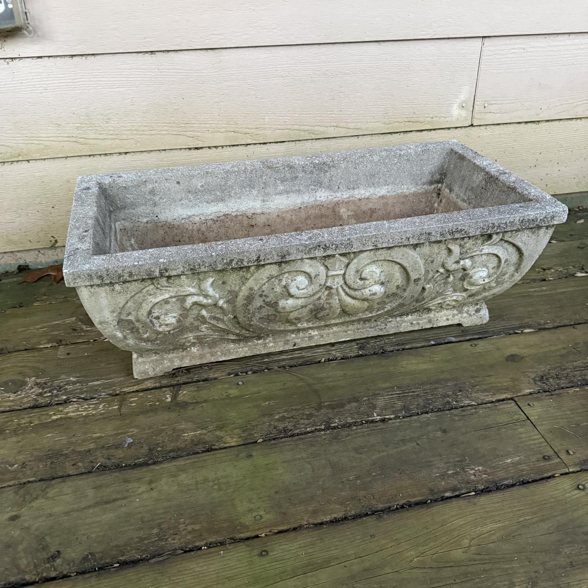 This cement fleur-de-lis designed planter is 29” x 14” x 10”H. It is dirty from outdoor use, but otherwise intact.