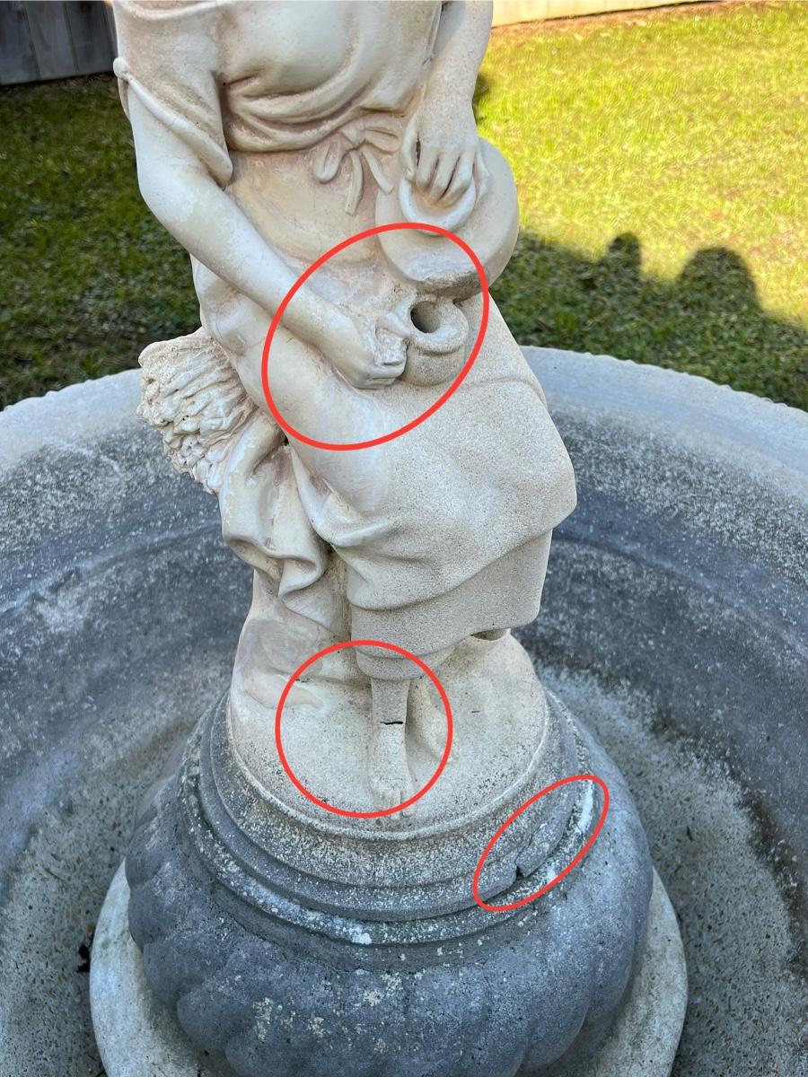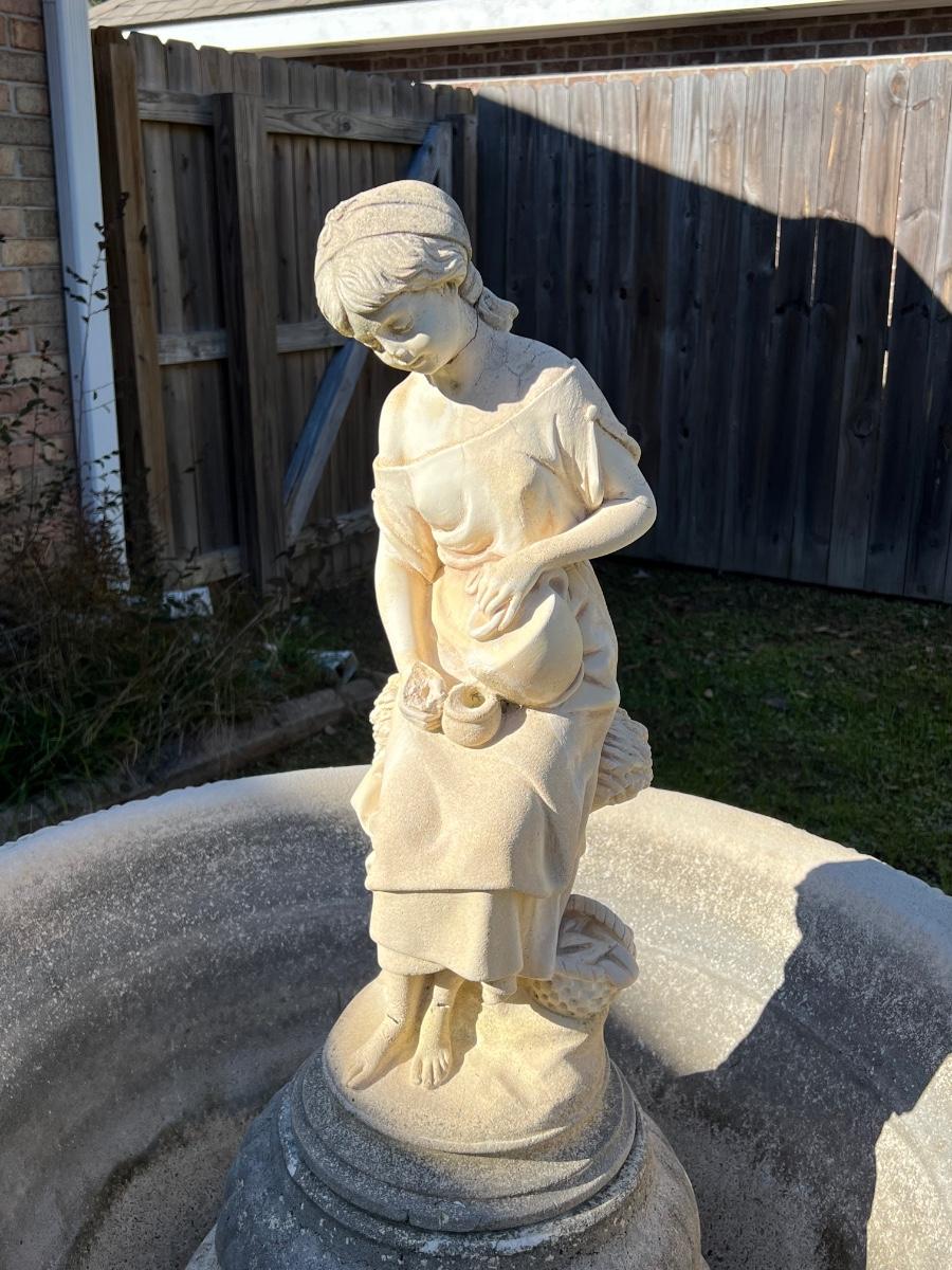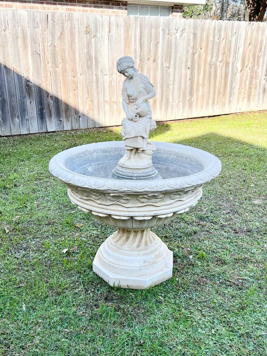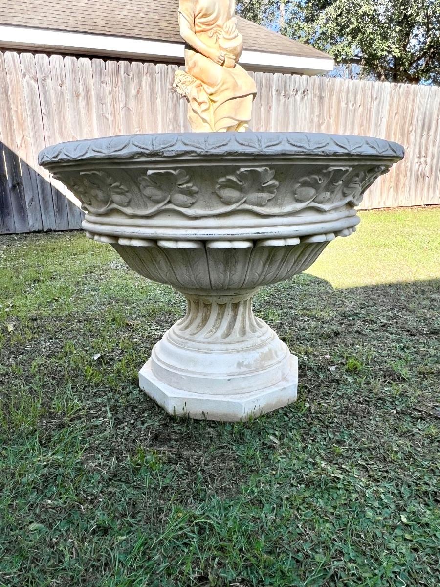 HEAVY!! ~ 4 pieces ~ It currently is not being used as a fountain ~ You will need a water pump ~ The entire bowl with pedestal is 1 piece, super heavy ~ Lady on the fountain has been repaired & has some minor cracks, see photos ~ Entire fountain = 51” H x 40” Round ~ Bottom = 30” H