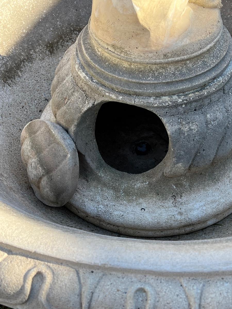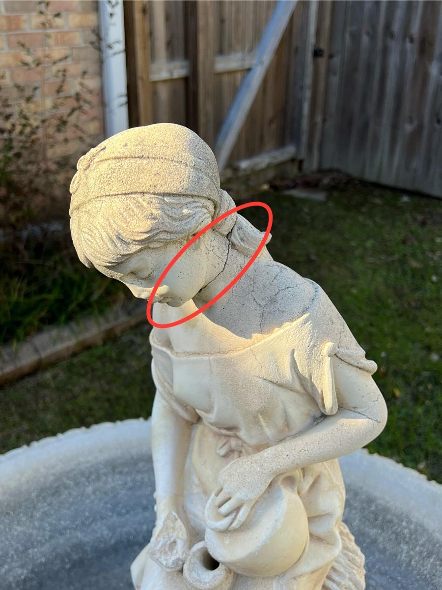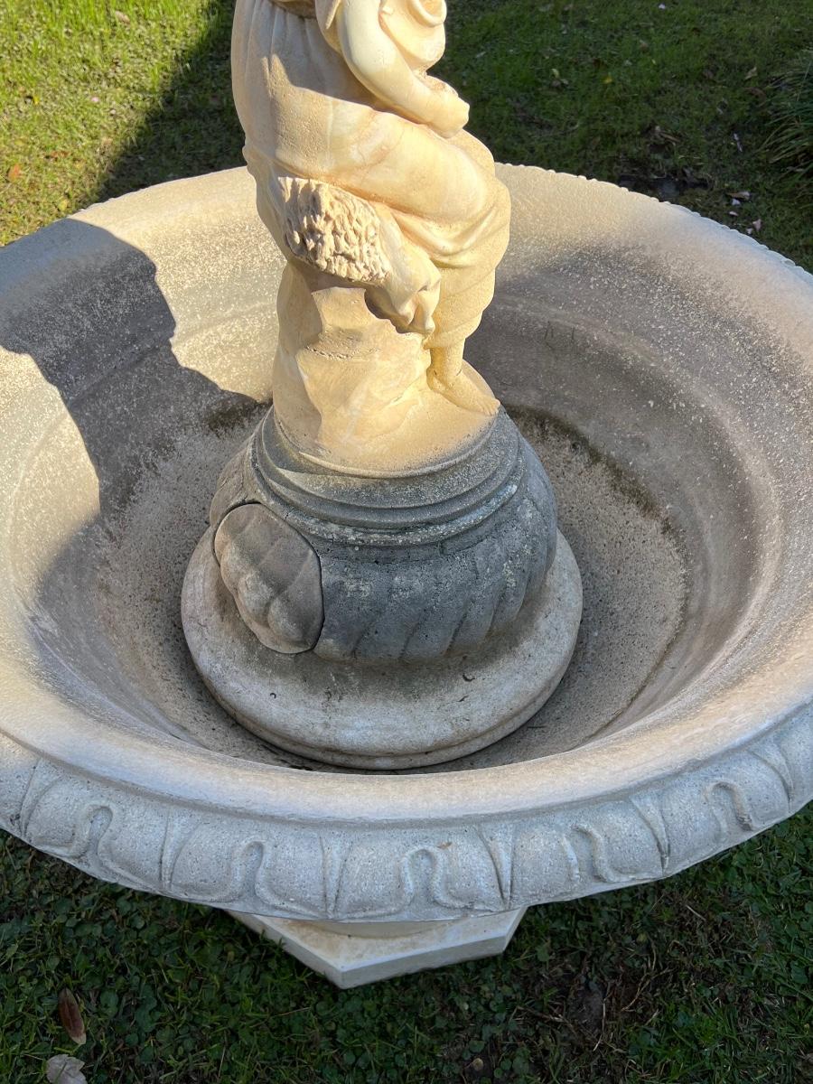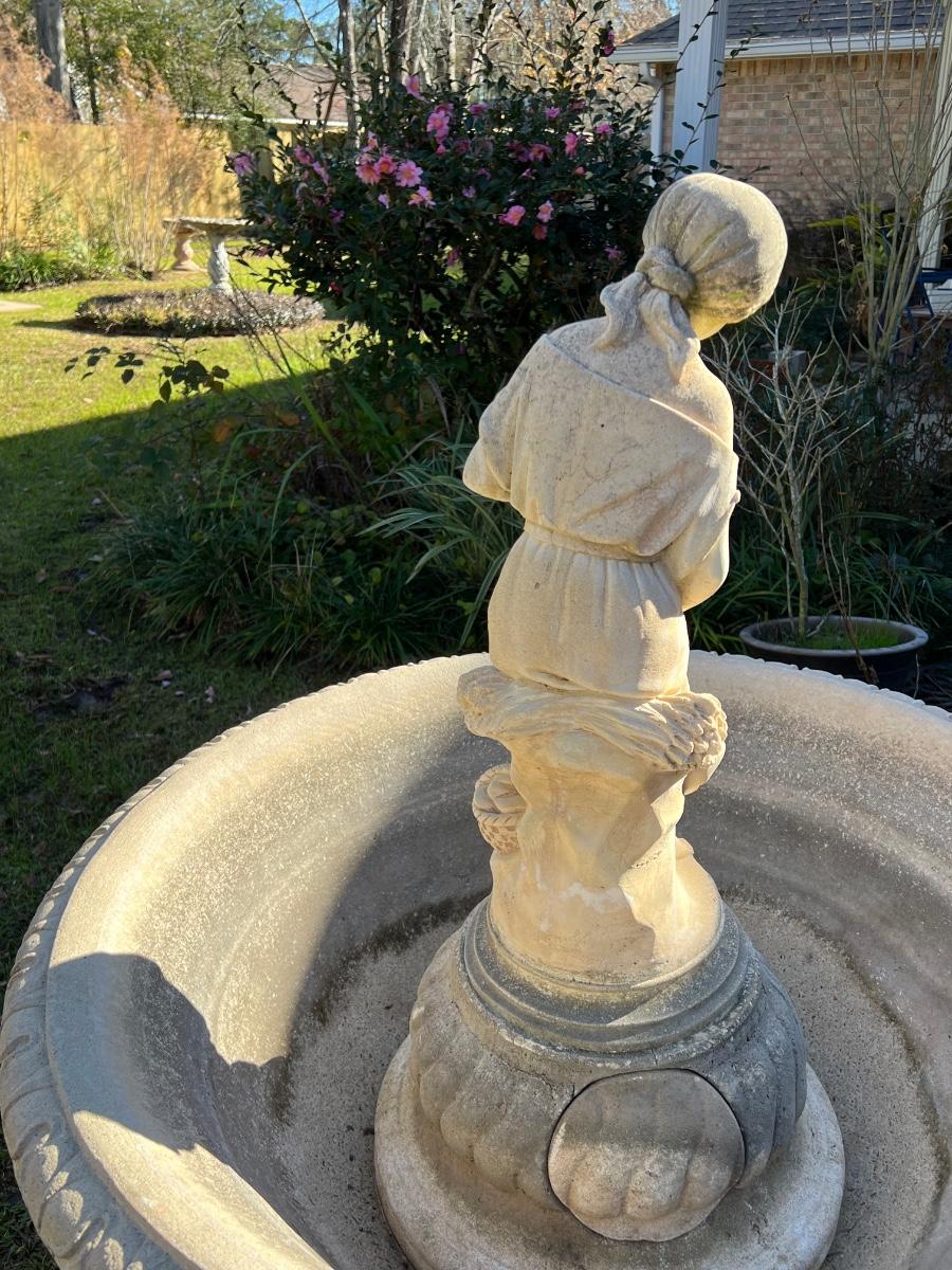HEAVY!! ~ 4 pieces ~ It currently is not being used as a fountain ~ You will need a water pump ~ The entire bowl with pedestal is 1 piece, super heavy ~ Lady on the fountain has been repaired & has some minor cracks, see photos ~ Entire fountain = 51” H x 40” Round ~ Bottom = 30” H