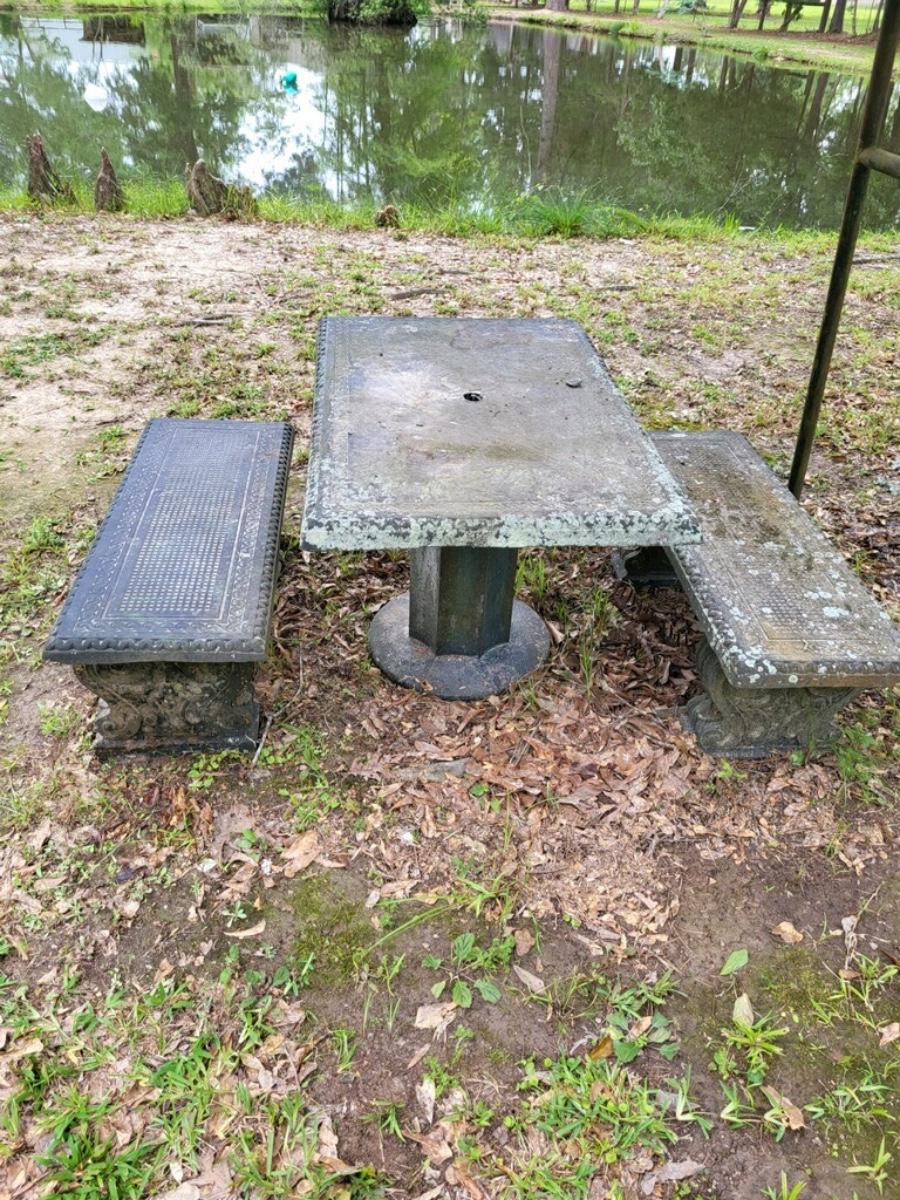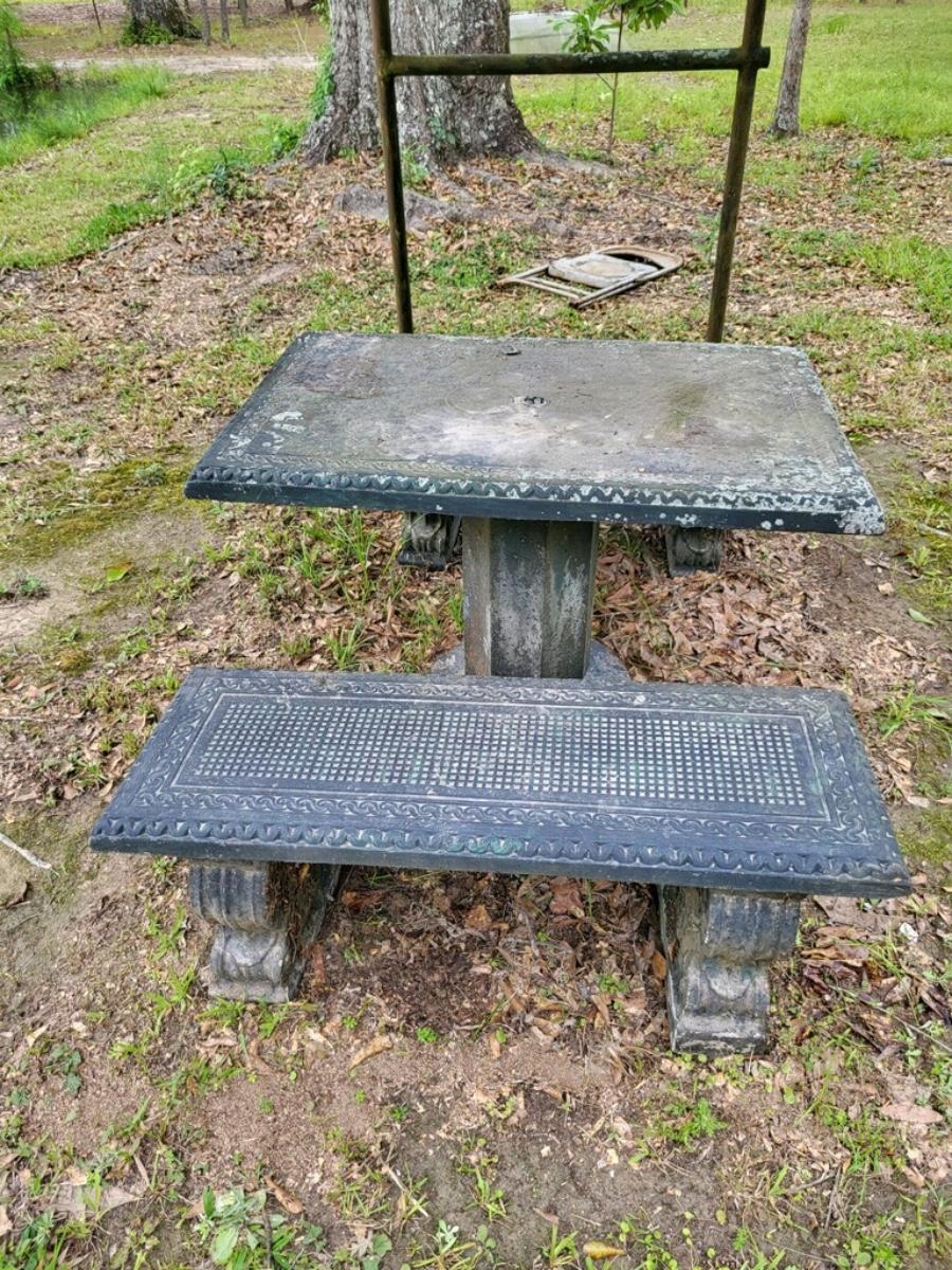 Cement garden table and benches, table: 27 1/2" W x 42 1/2" L, benhes: 15 1/2" W x 42" L