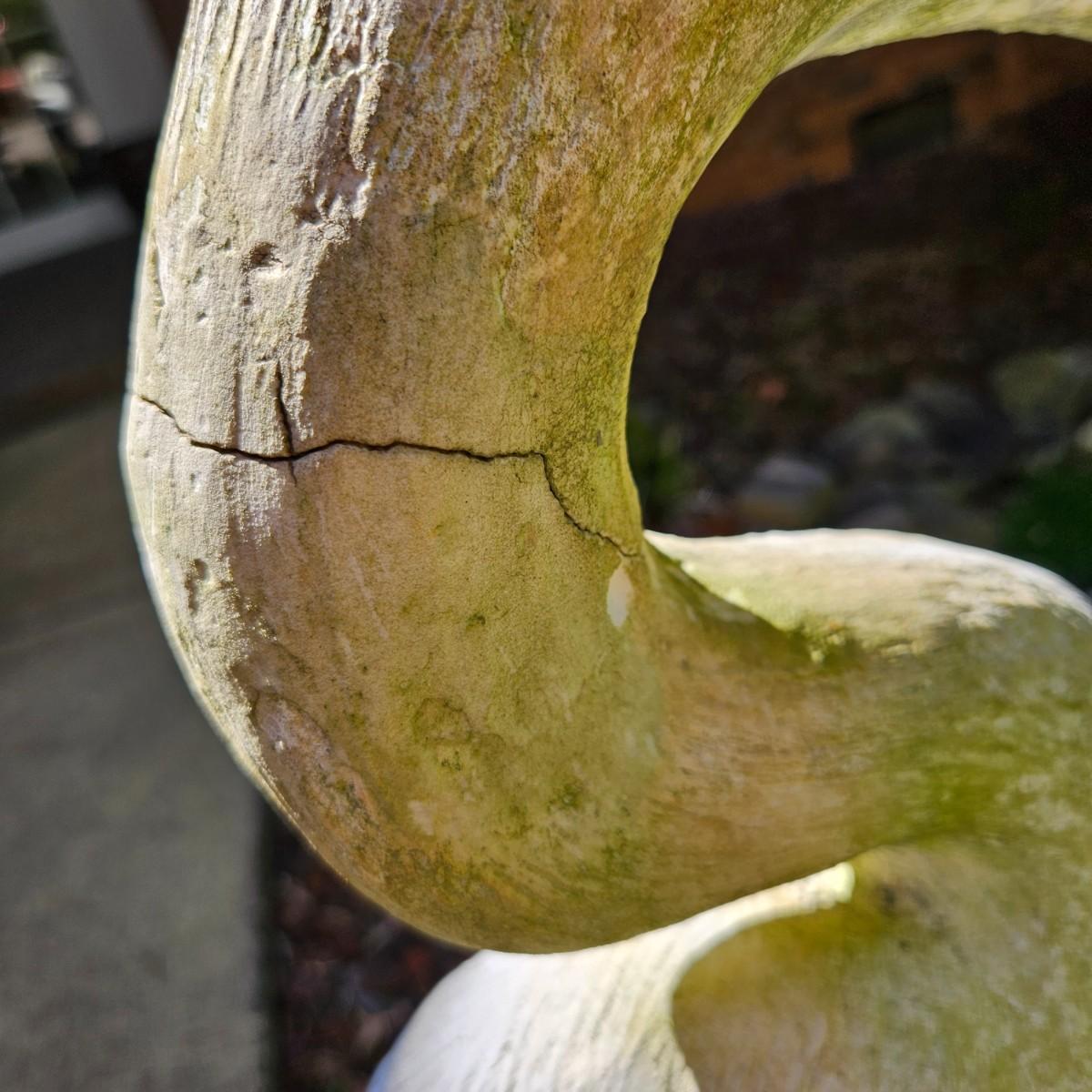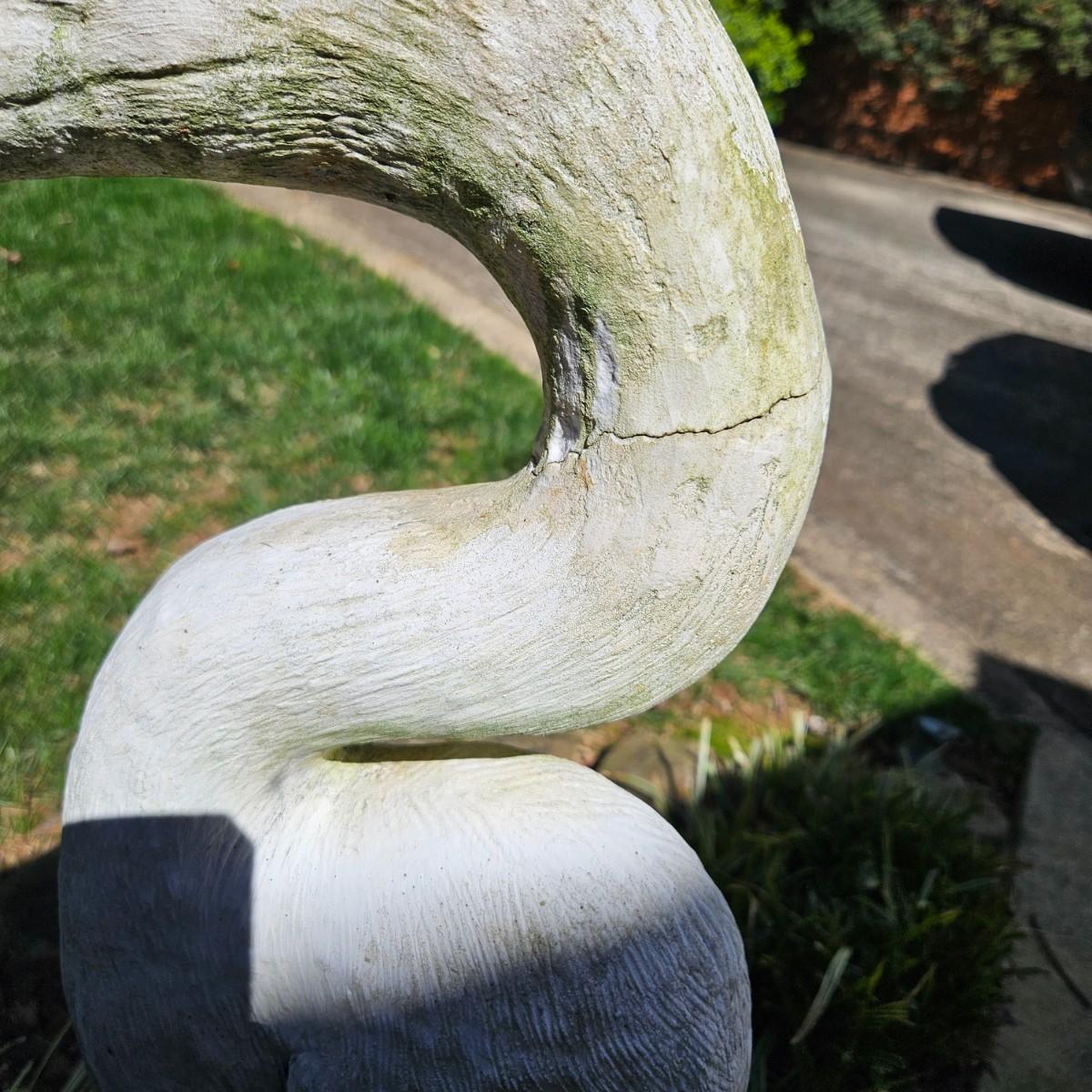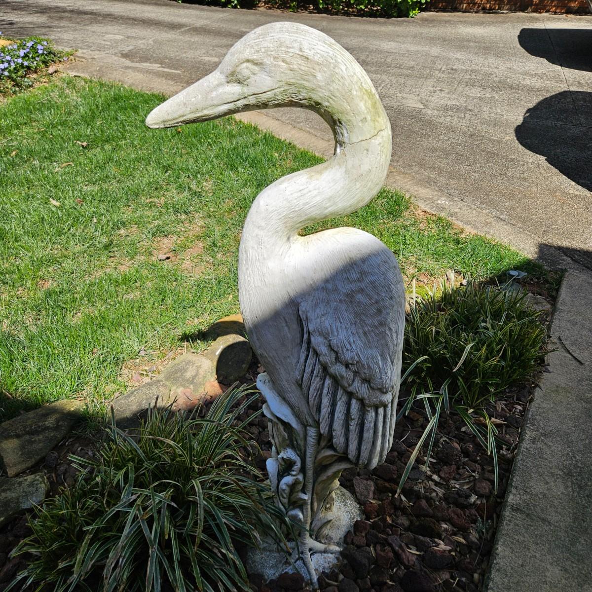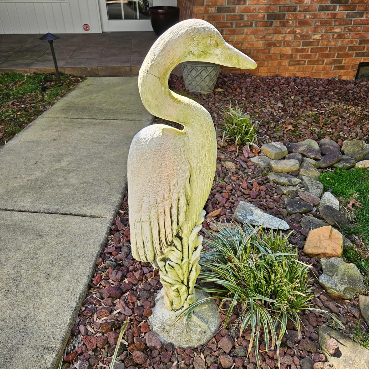 A large cement heron yard statue that measures approximately 12" x 15" x 39"H. There is a notable crack in the neck, but the piece appears to have internal reinforcement. Local pickup only. Winning bidder must bring assistance to help move and load this item due to its weight and/or size.