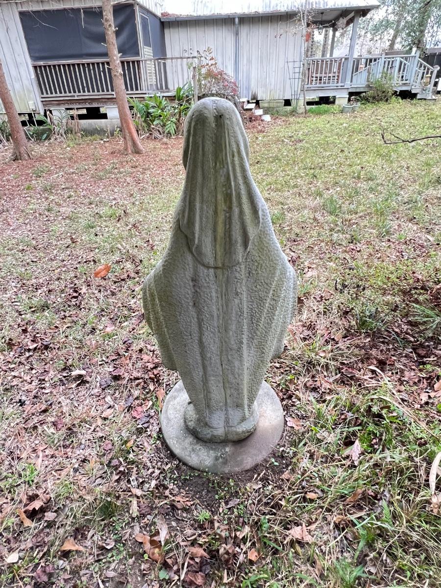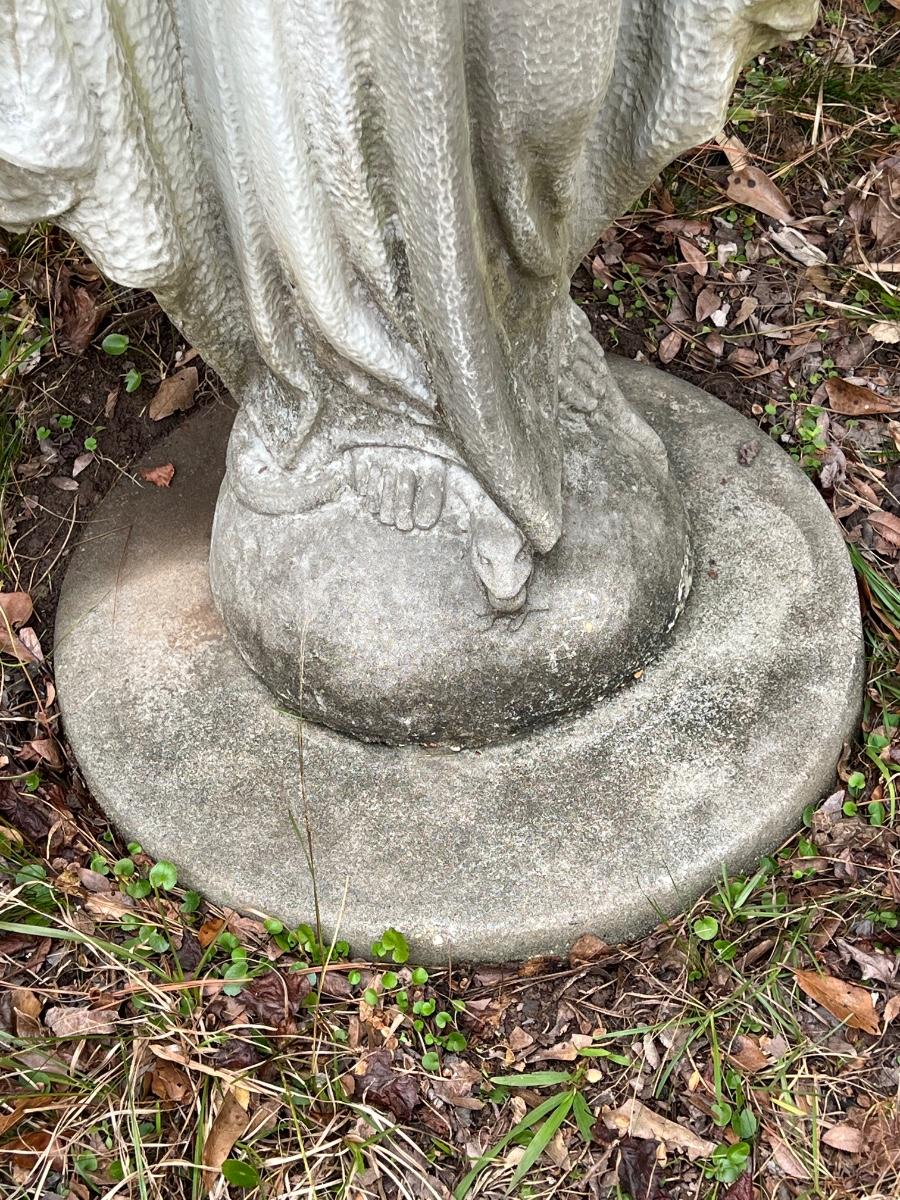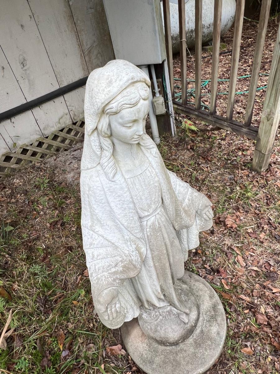 Very heavy, bring help. She is in one piece on the pedestal. 50” H x 21 “ W x 21” Round