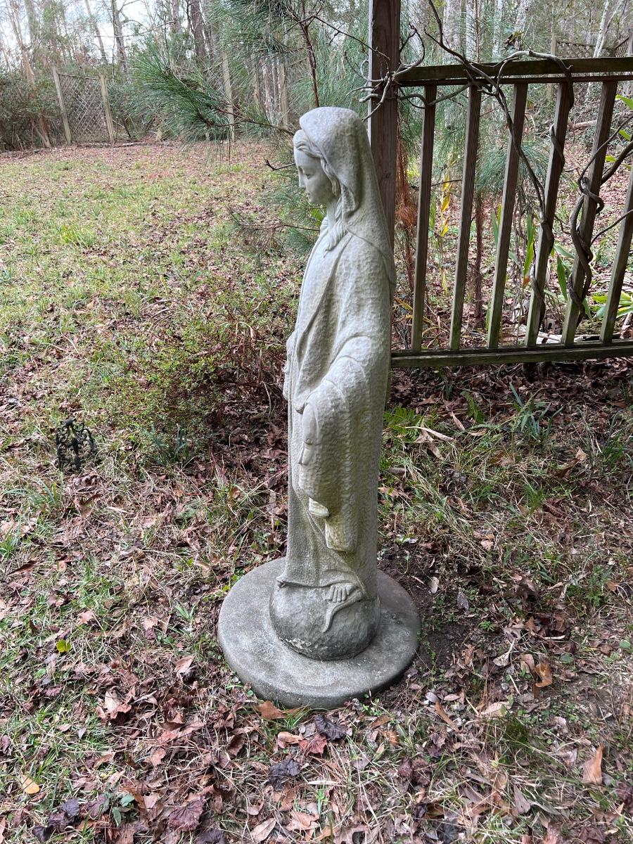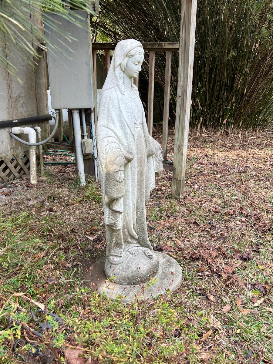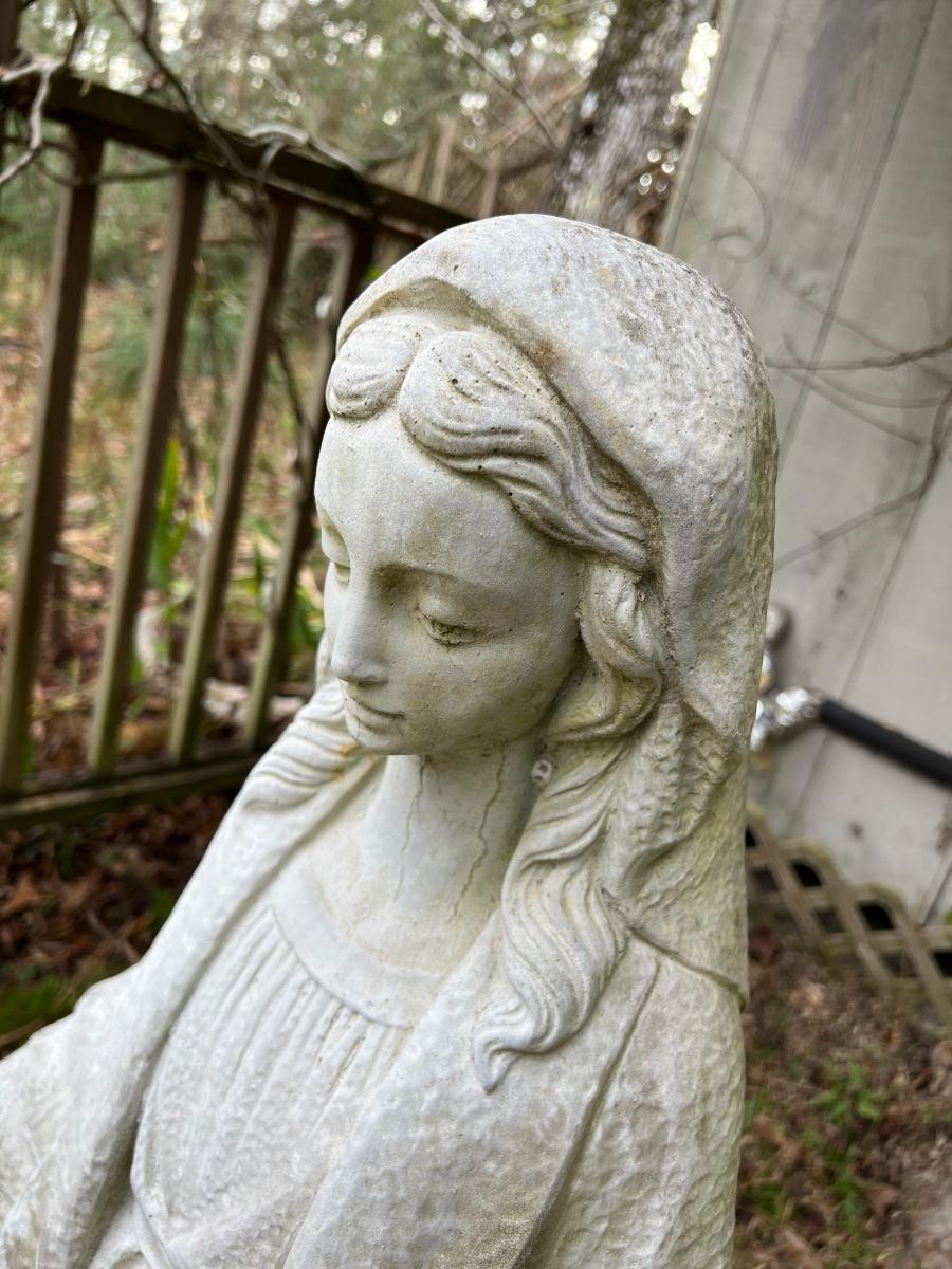 Very heavy, bring help. She is in one piece on the pedestal. 50” H x 21 “ W x 21” Round