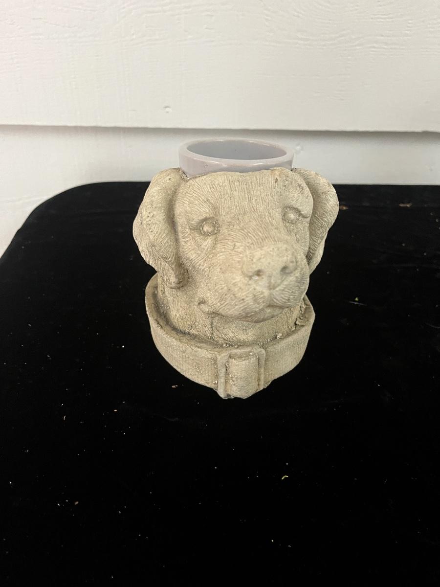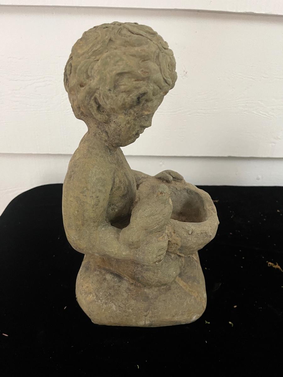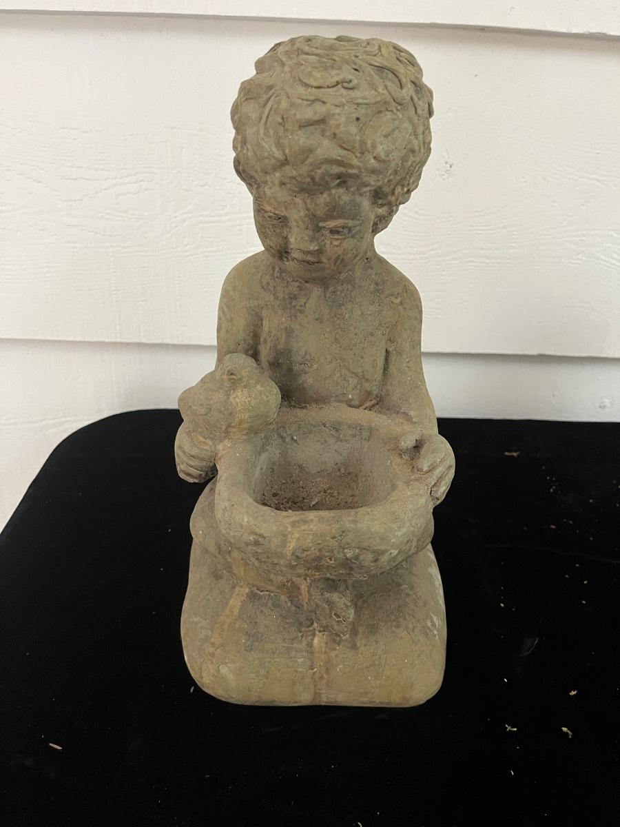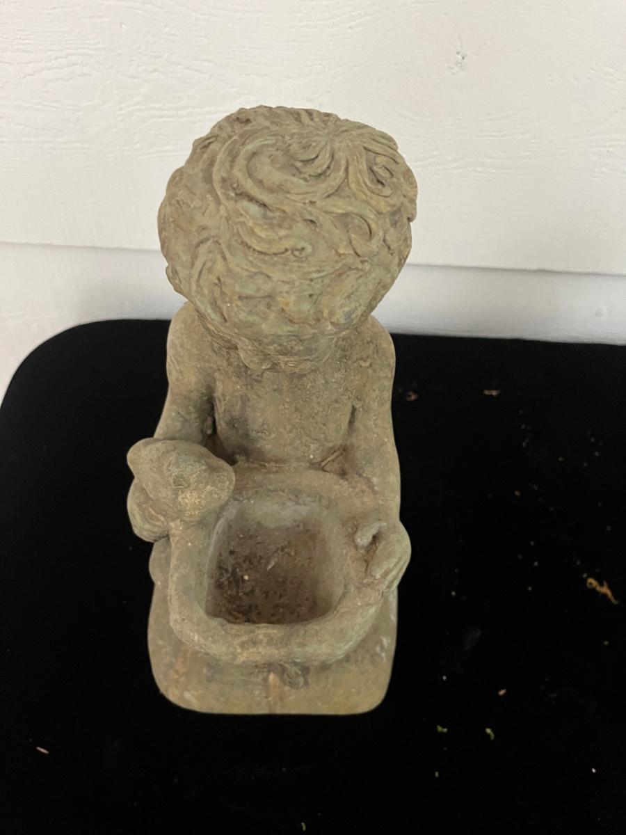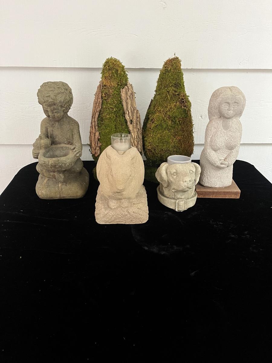 Lot includes cement dog statuette, rabbit statuette, boy Statuette and girl statuette. Also includes two topiaries. Tallest statuette measures 4” x 5” x 12”H.