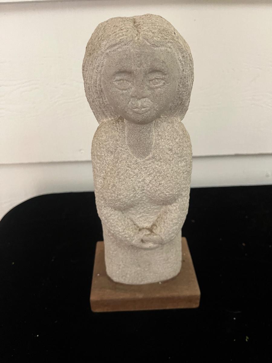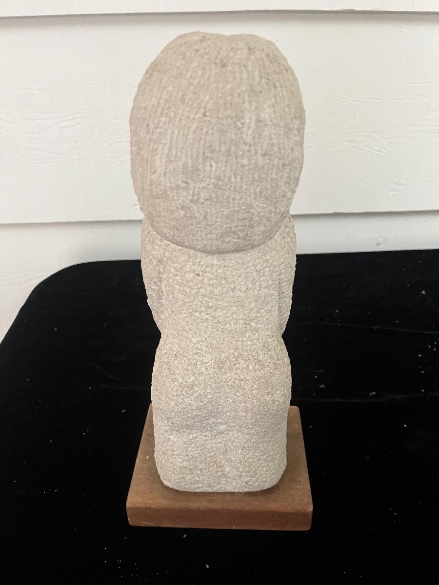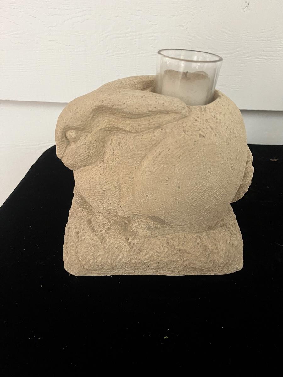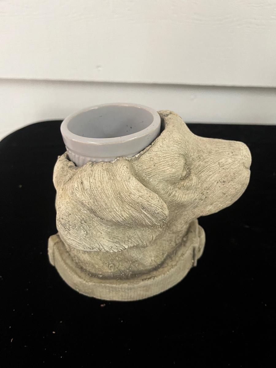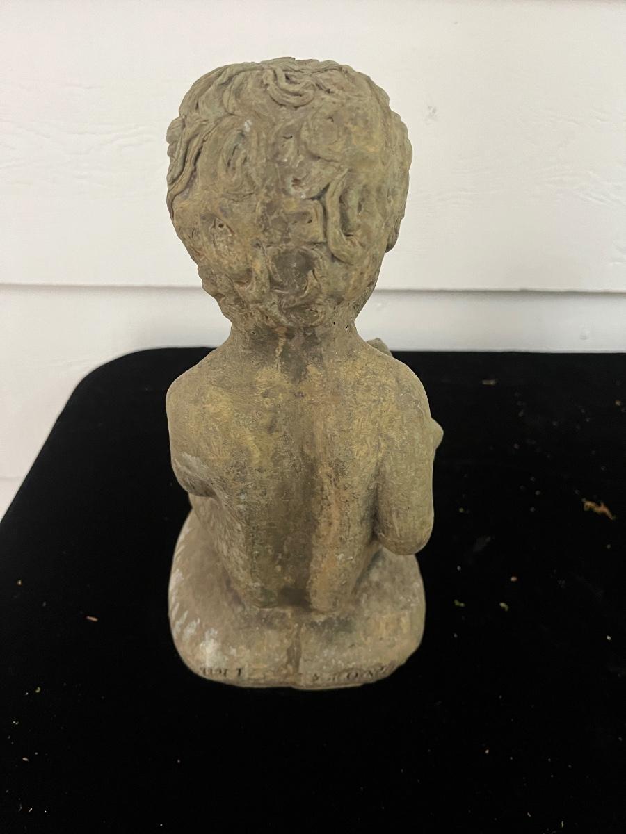 Lot includes cement dog statuette, rabbit statuette, boy Statuette and girl statuette. Also includes two topiaries. Tallest statuette measures 4” x 5” x 12”H.