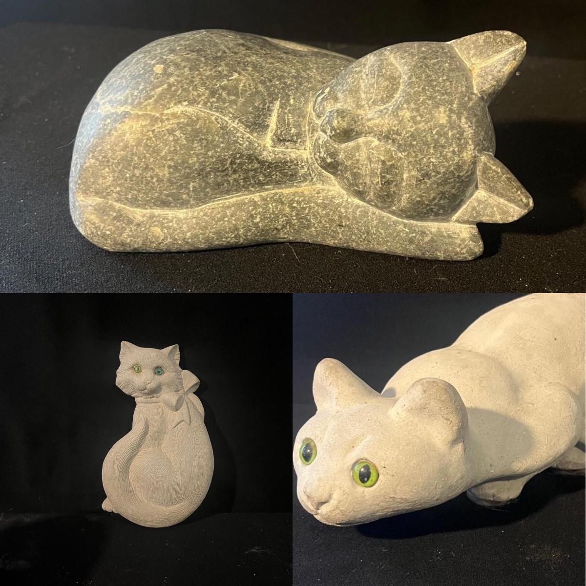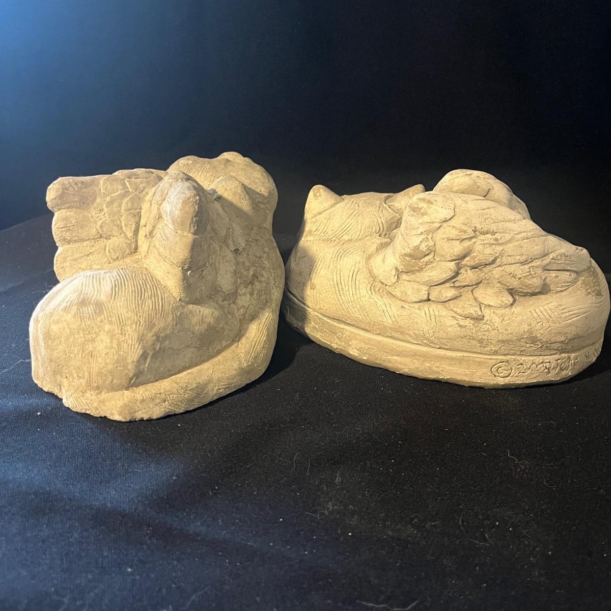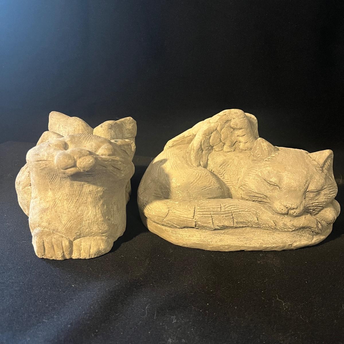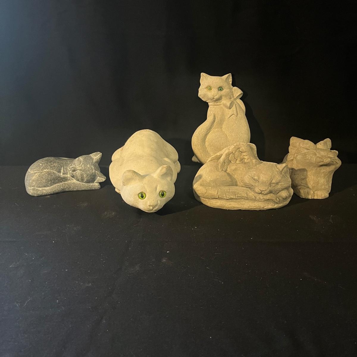 Lot includes a stone cat, two cement cats with wings, cement cat wall hanging and a cement cat that measures 11.5” x 6” x 5”.