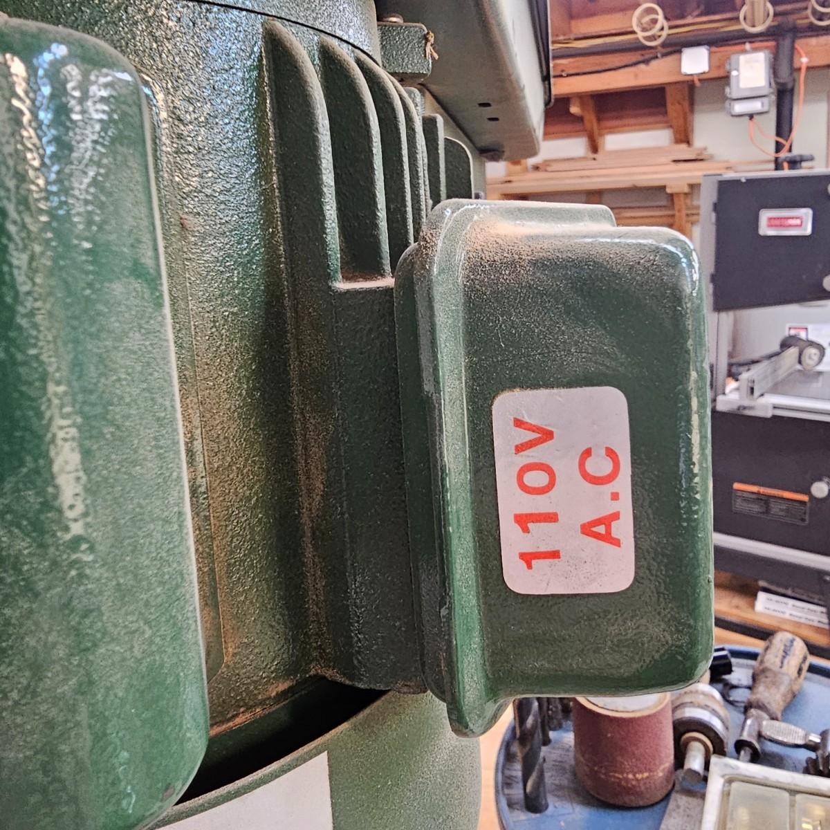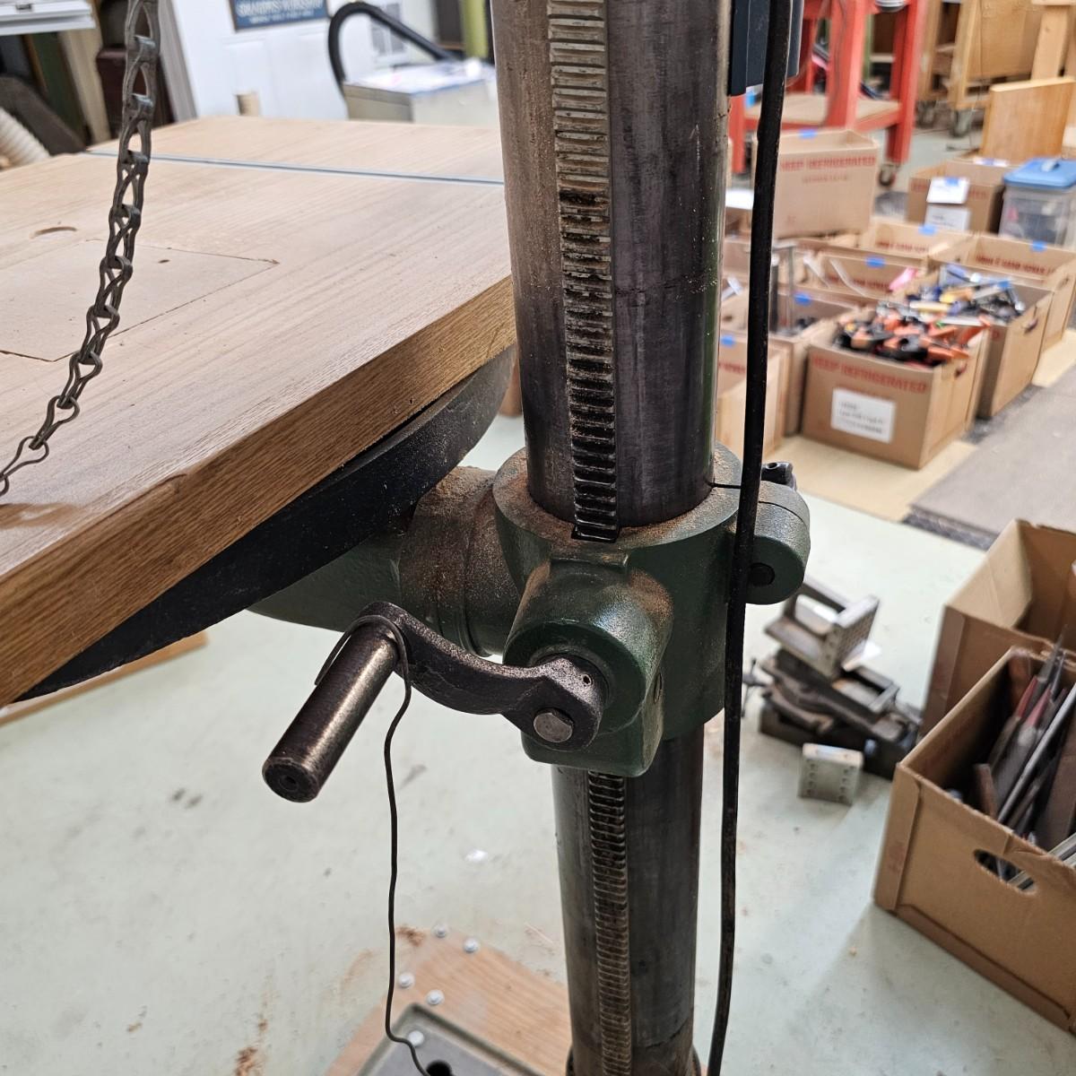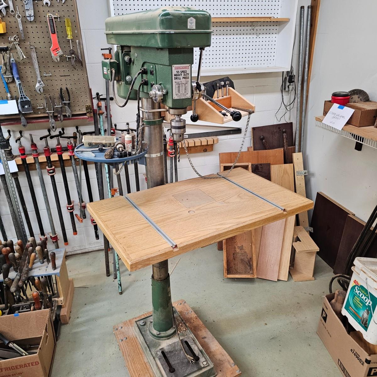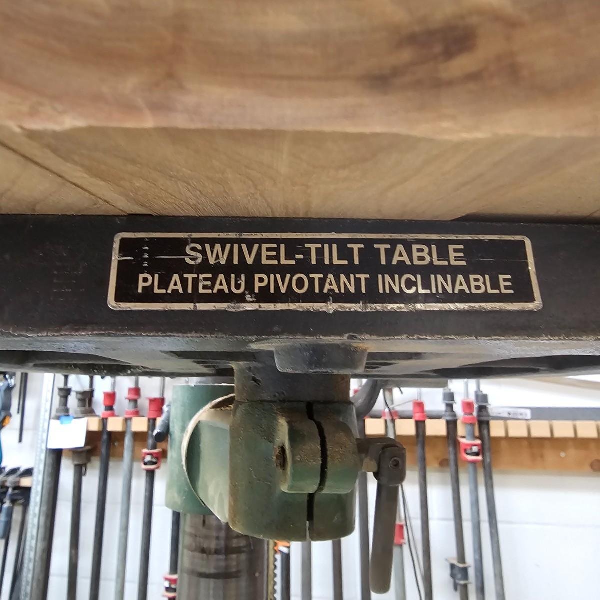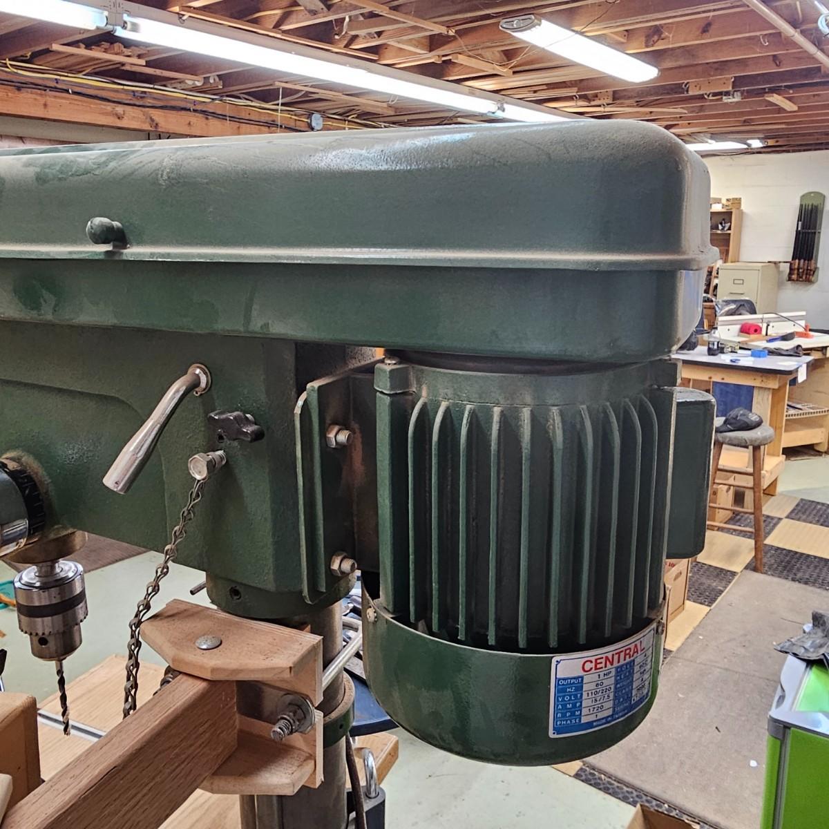 Floor standing heavy duty drill press by Central Machinery. 16 speed adjustable by different belt configurations. Item has had a custom work table added, as well as two specialty tool holders. Unit is wired for and tested on 120V power. Drill powered on when plugged in. Drill is bolted to rolling base for ease of movement, and measures 30" x 31" x 67"H on rolling base, 63"H on its own. Includes chuck key and all items seen on tool holders. See photos for details. Local pickup only. Winning bidder must bring assistance to help move and load this item due to its weight and/or size.