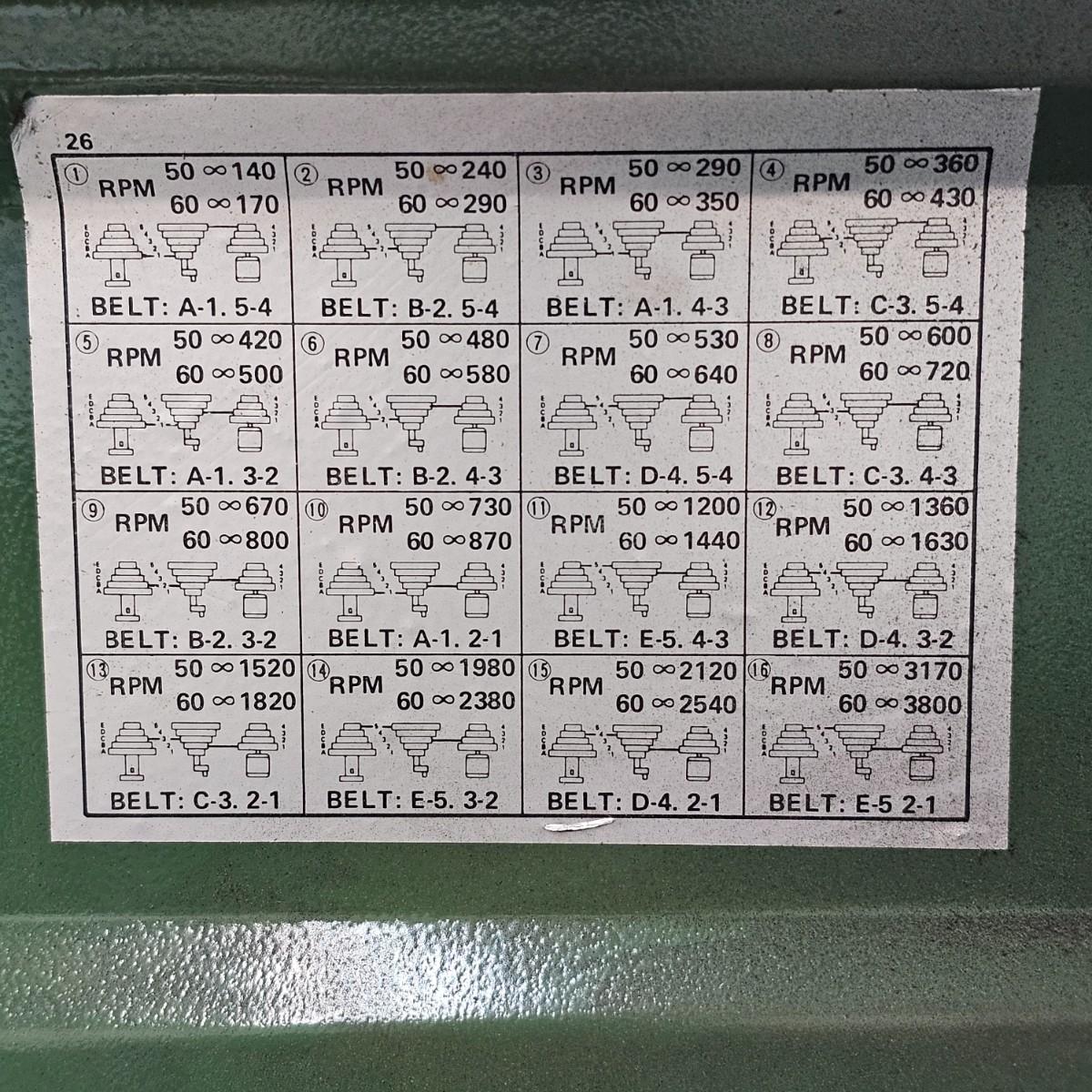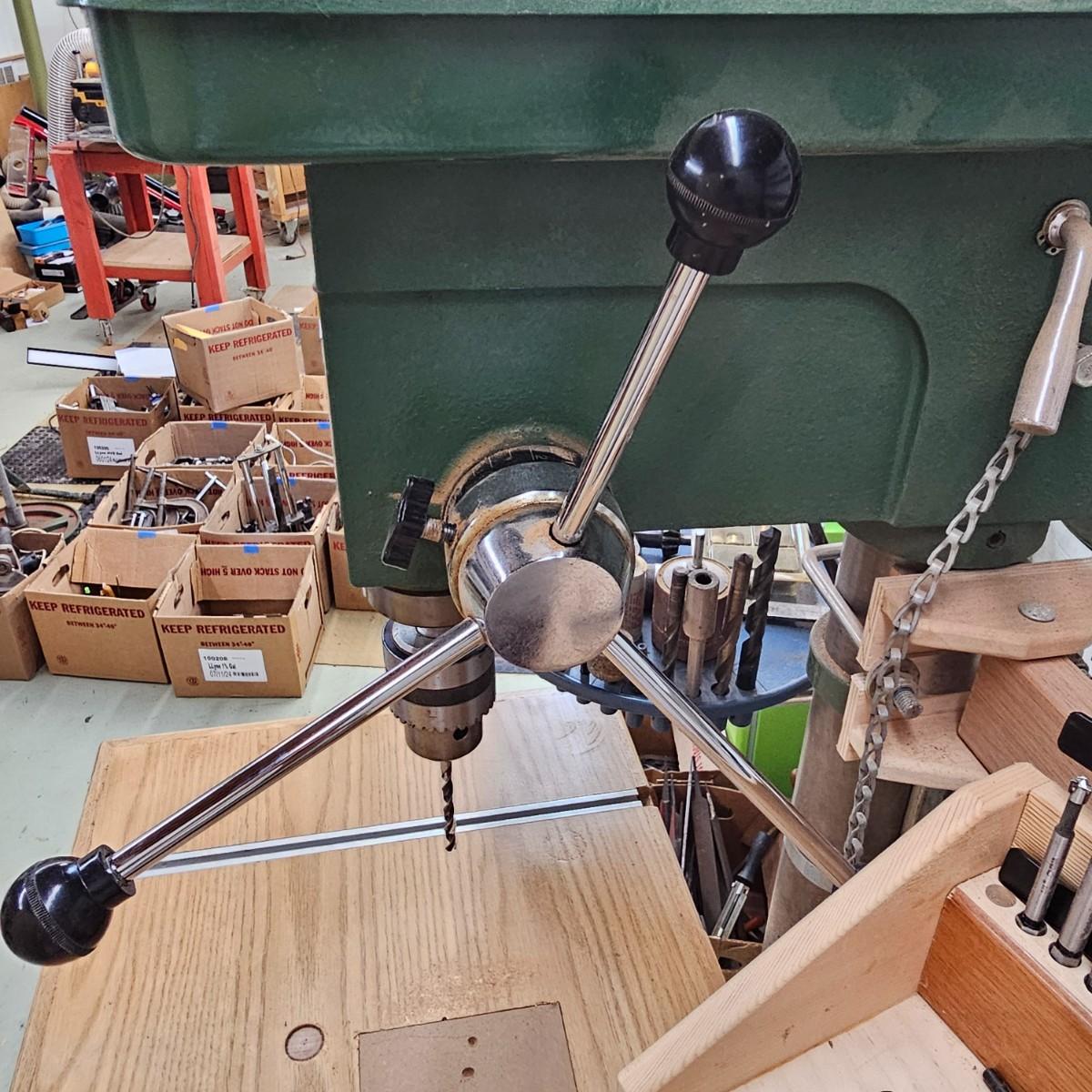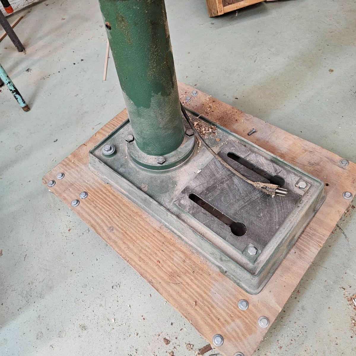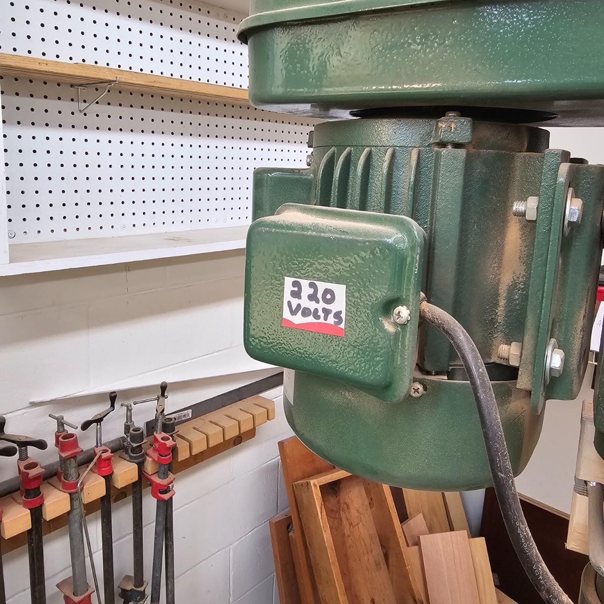 Floor standing heavy duty drill press by Central Machinery. 16 speed adjustable by different belt configurations. Item has had a custom work table added, as well as two specialty tool holders. Unit is wired for and tested on 120V power. Drill powered on when plugged in. Drill is bolted to rolling base for ease of movement, and measures 30" x 31" x 67"H on rolling base, 63"H on its own. Includes chuck key and all items seen on tool holders. See photos for details. Local pickup only. Winning bidder must bring assistance to help move and load this item due to its weight and/or size.