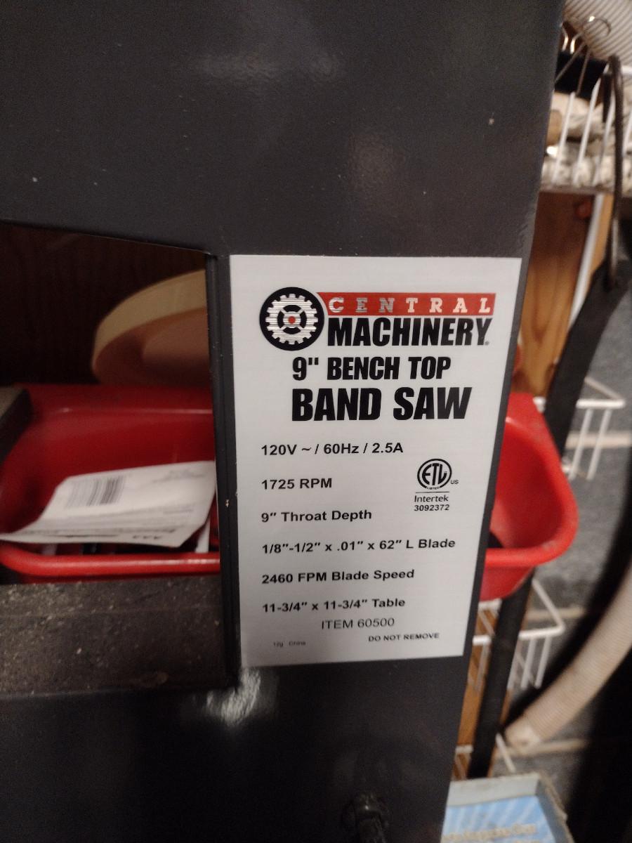 Central Machinery 9" Bench Top Band Saw. Item is untested.