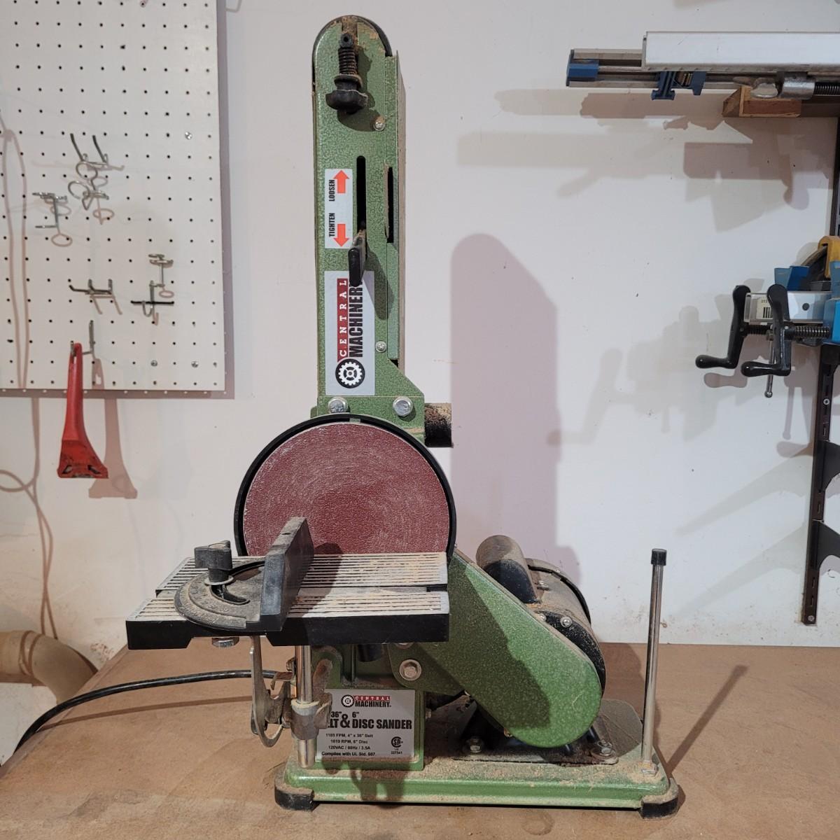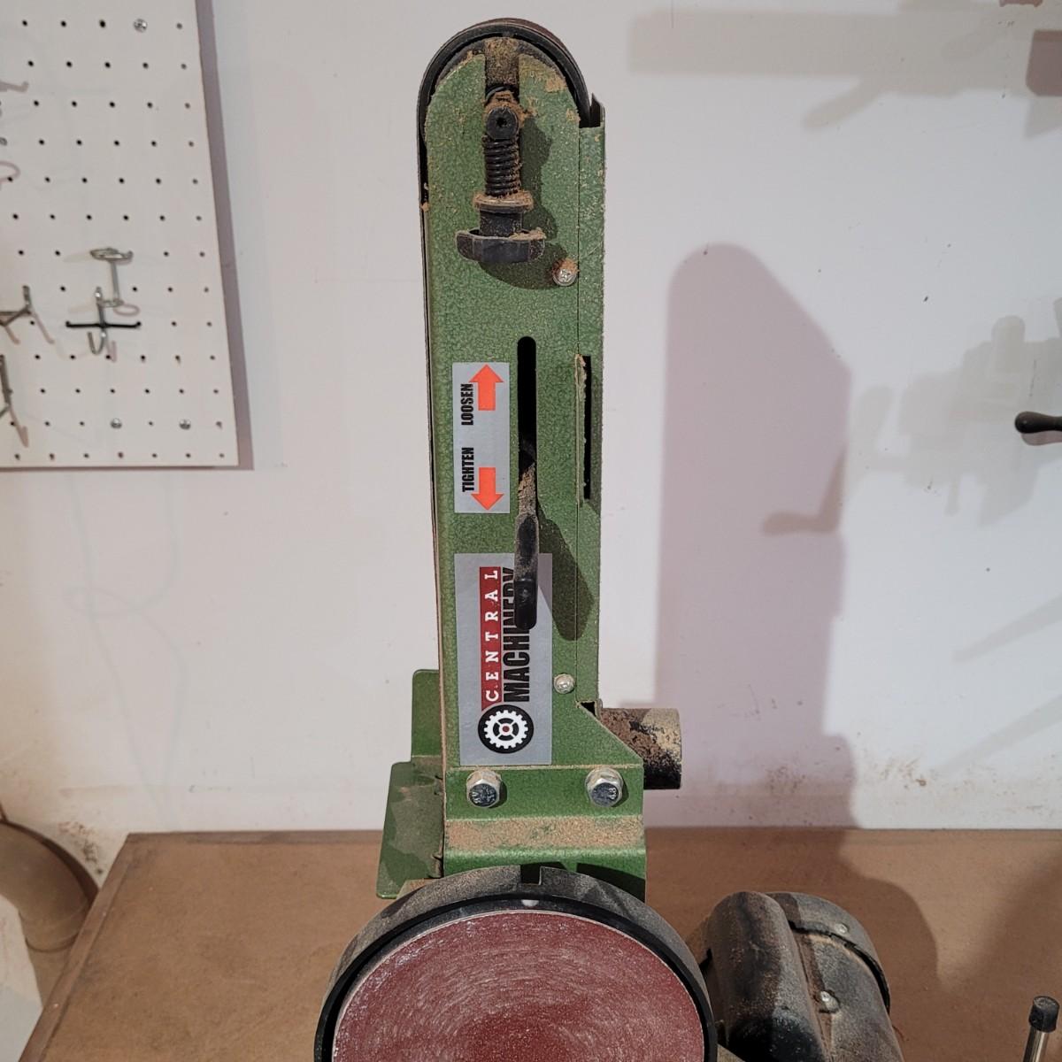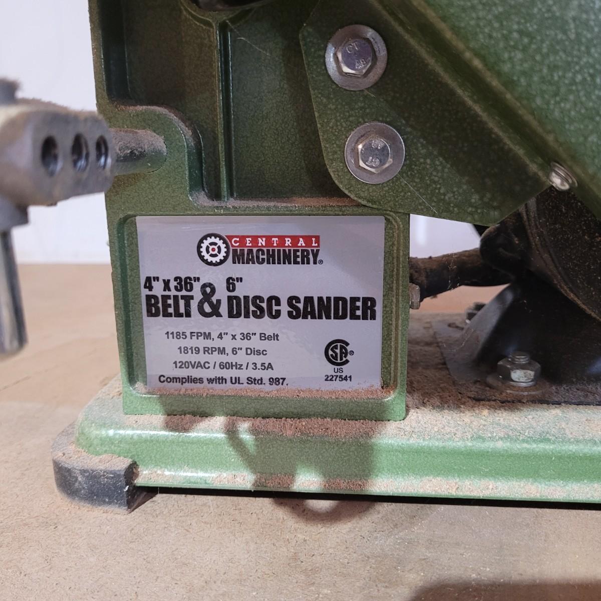Central machinery brand belt and disk sander. Featuring a 4" x 36" belt sander and 6" disk sander. Powers on and appears to be in working order. Item measures approximately 15" x 16" x 25.5" H.
