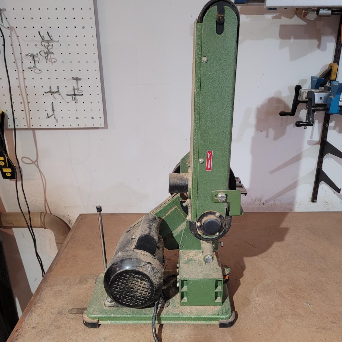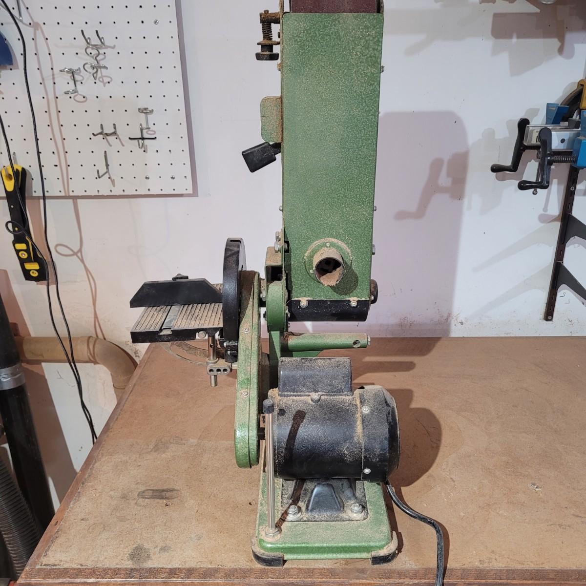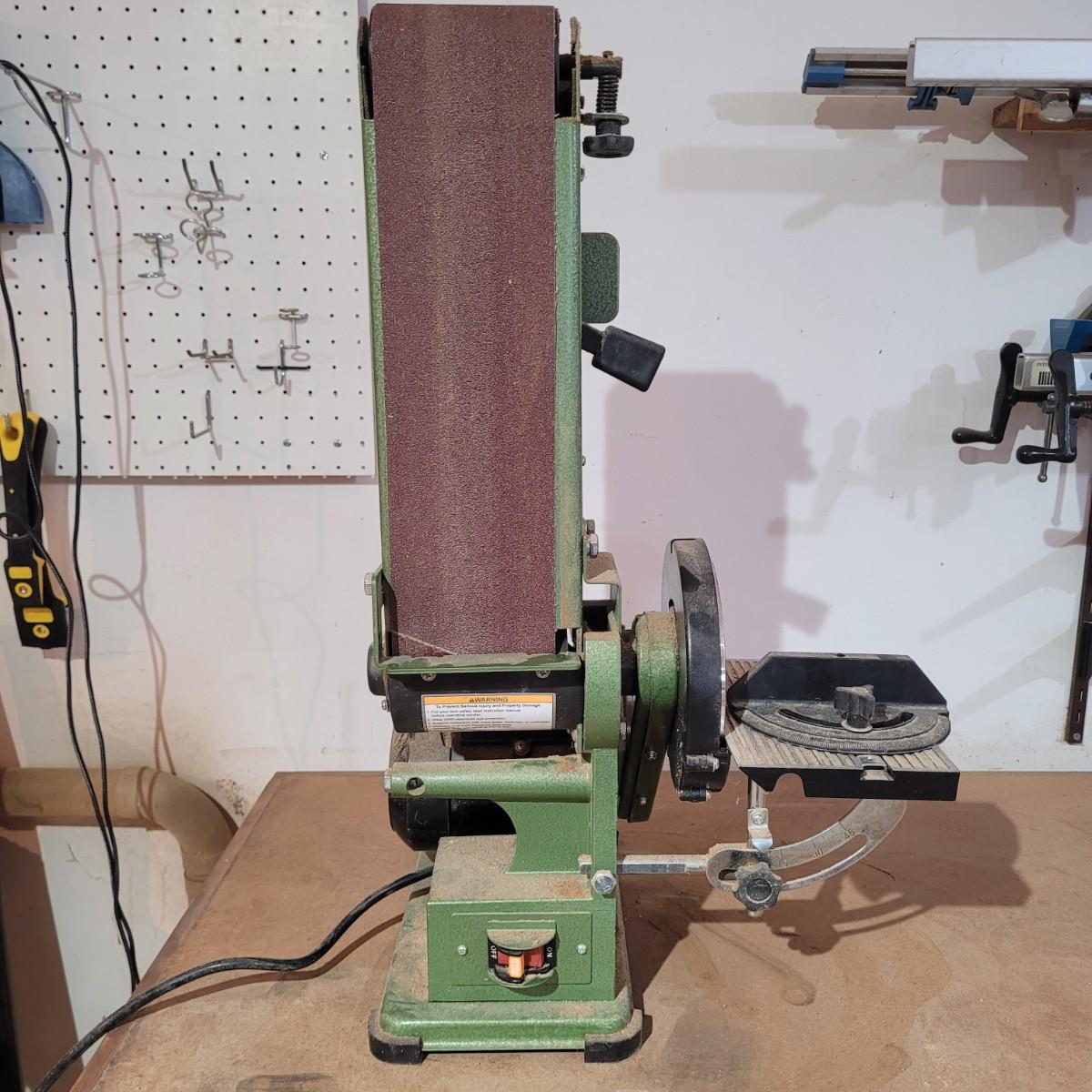 Central machinery brand belt and disk sander. Featuring a 4" x 36" belt sander and 6" disk sander. Powers on and appears to be in working order. Item measures approximately 15" x 16" x 25.5" H.