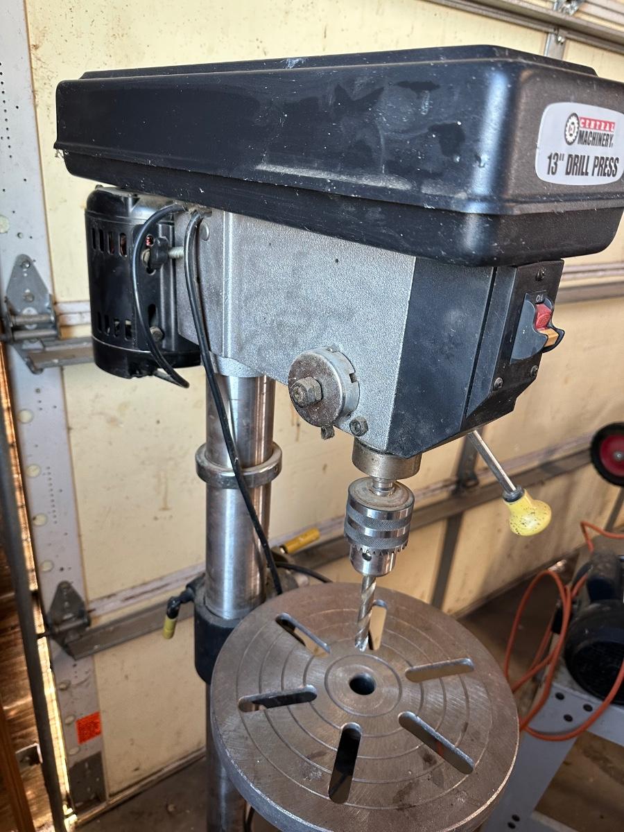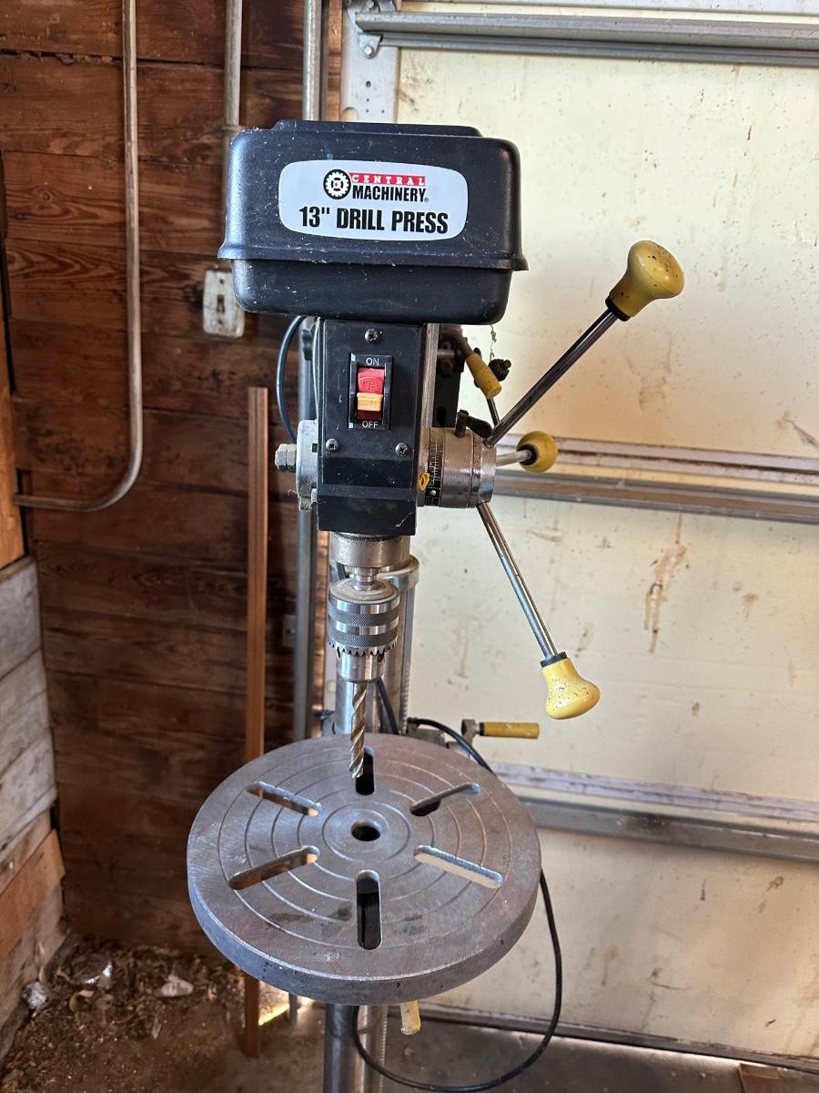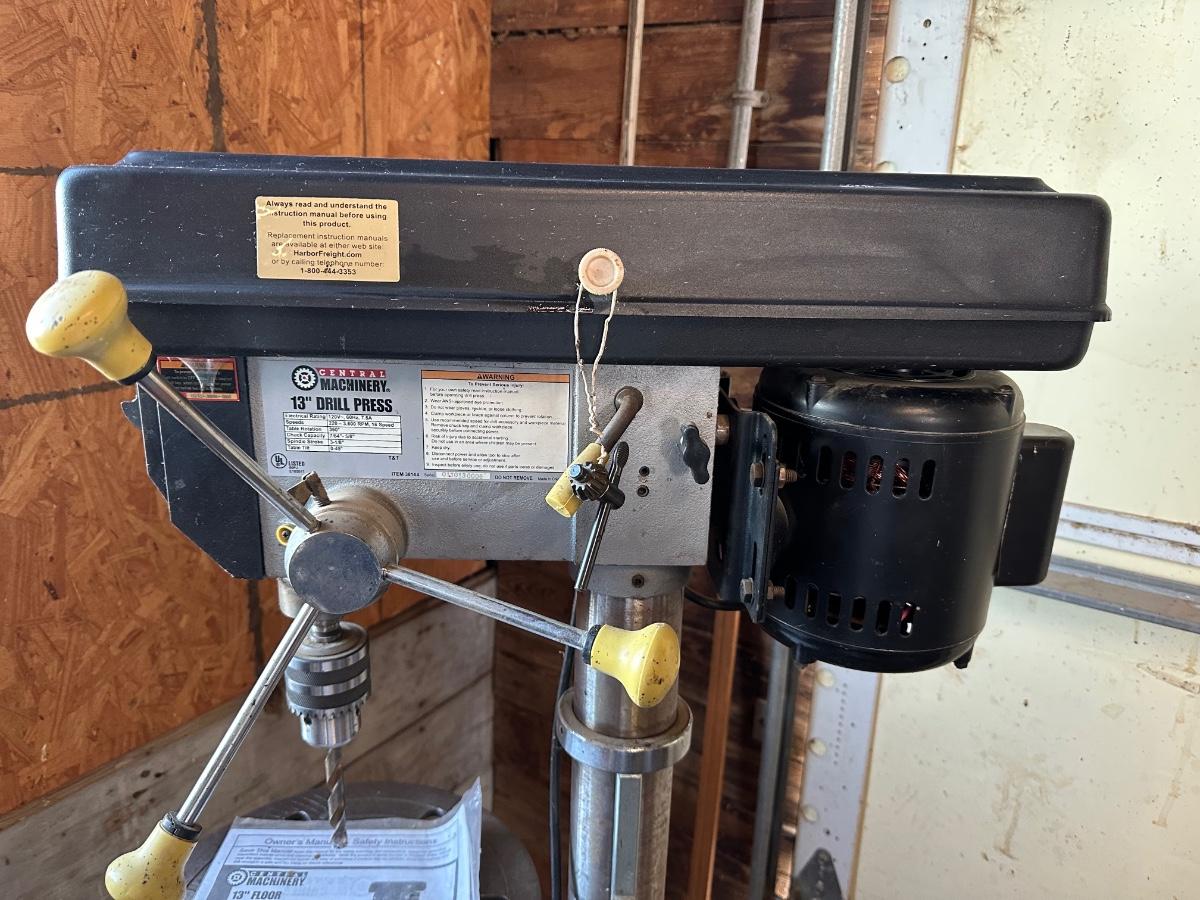 13” Central Machinery Floor drill press - item number 38144. It is in good condition and does have original manual with it. See pictures for specifications for this item.