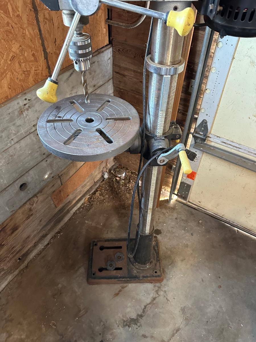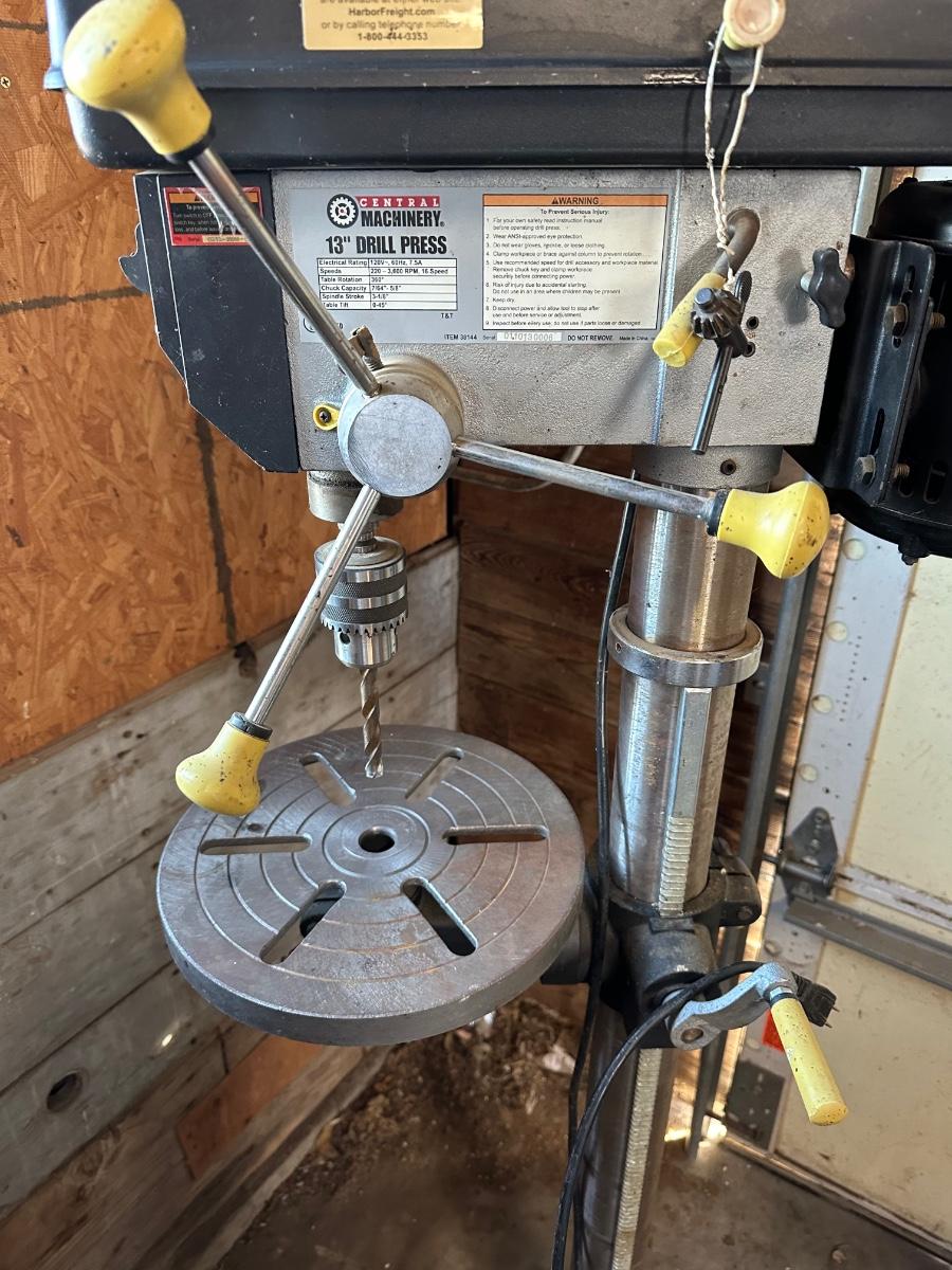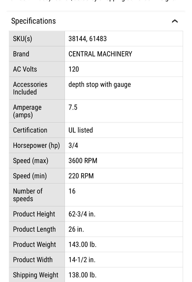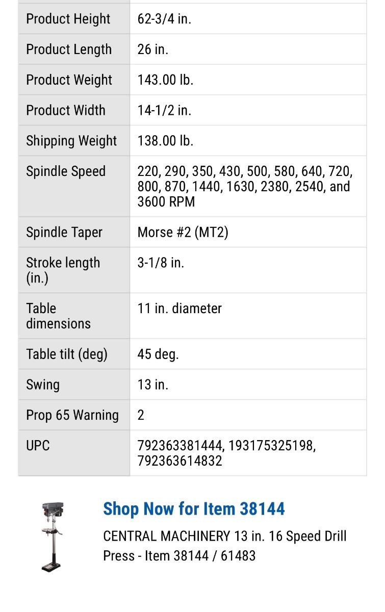 13” Central Machinery Floor drill press - item number 38144. It is in good condition and does have original manual with it. See pictures for specifications for this item.