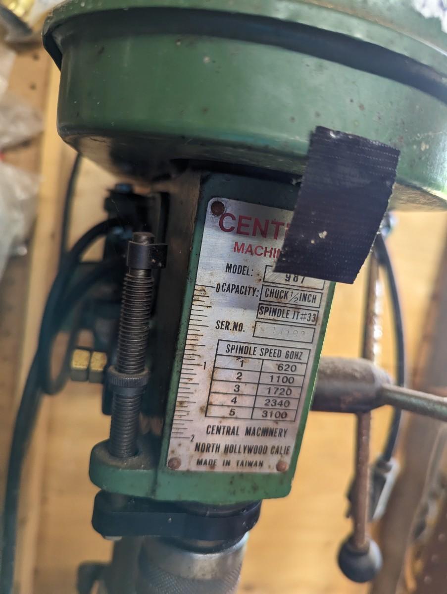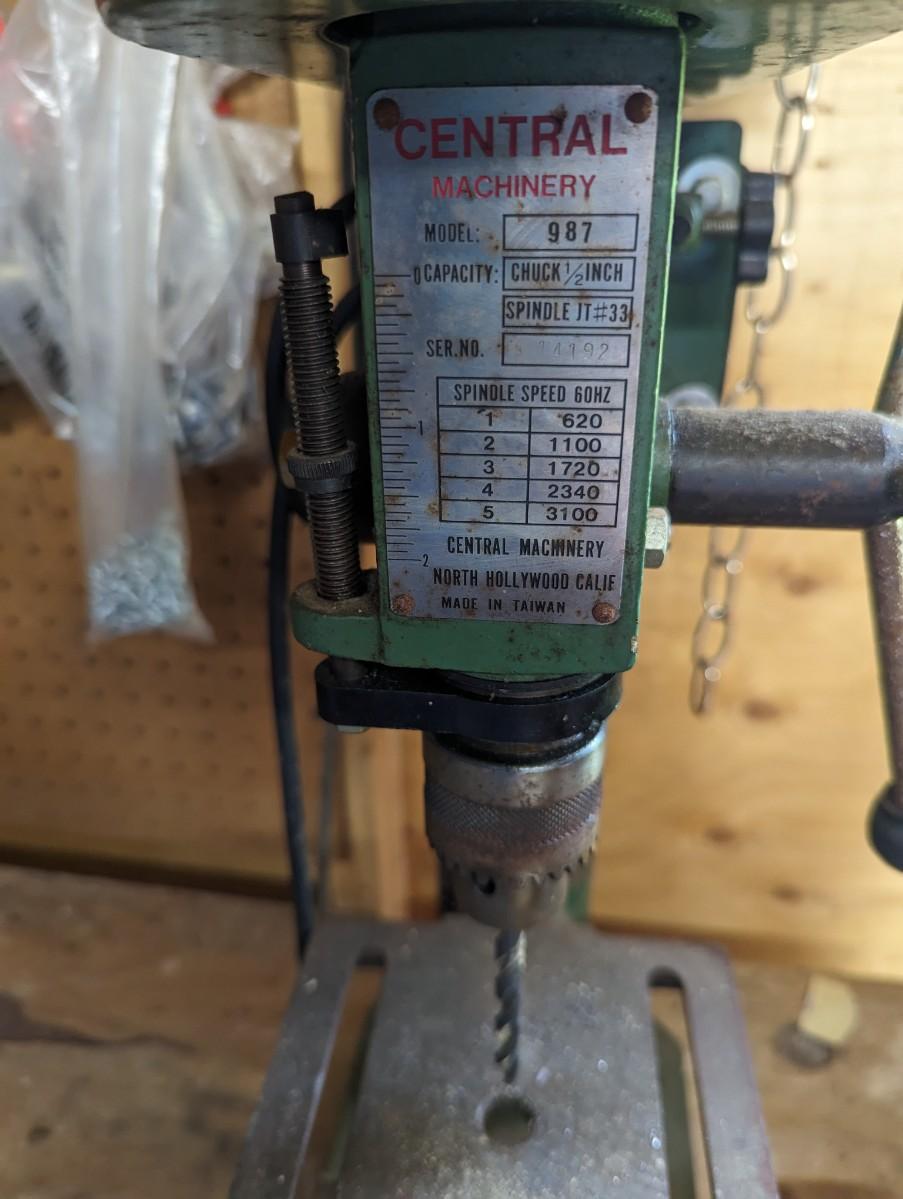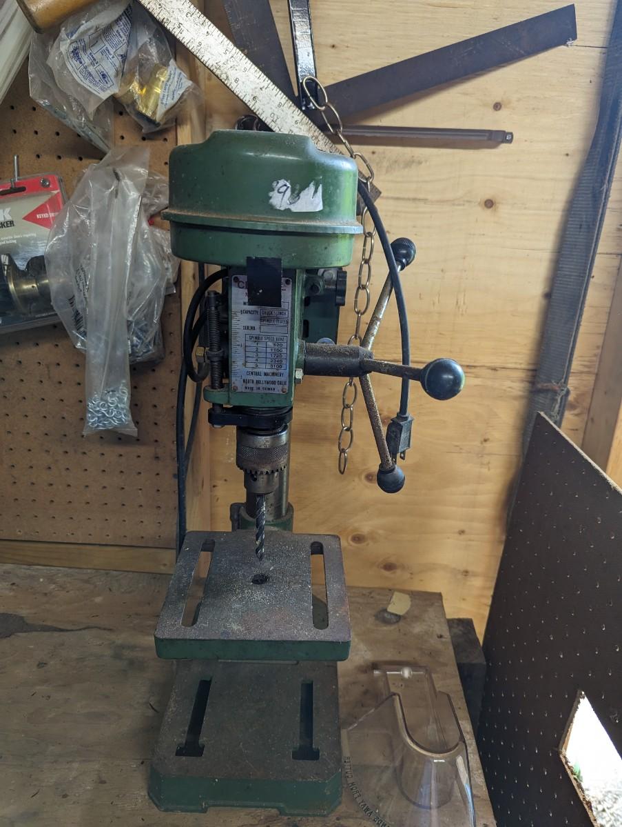 Central Machinery Model 897 Table Drill. Will have to bring hand truck. Items are about a hundred yards from the driveway.
