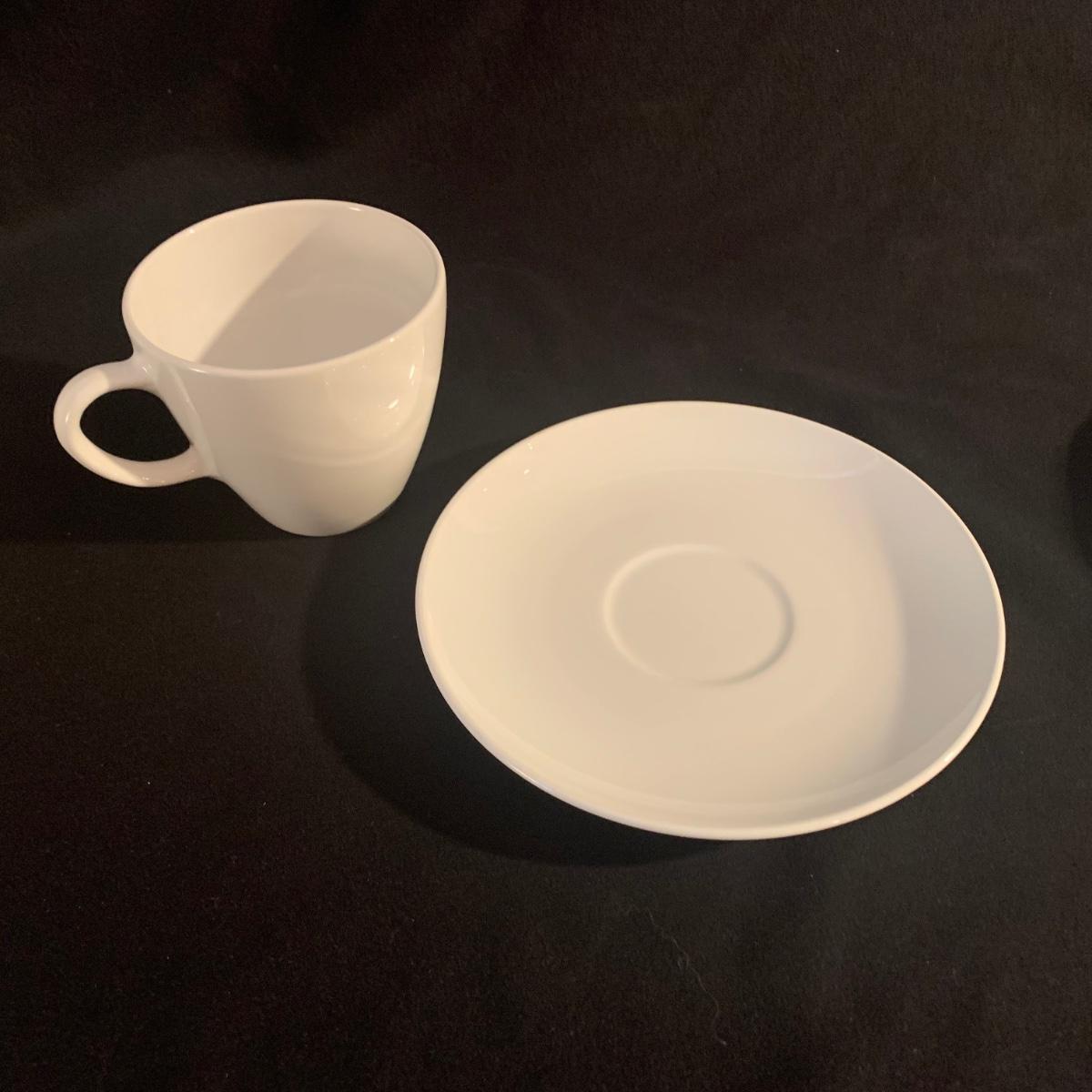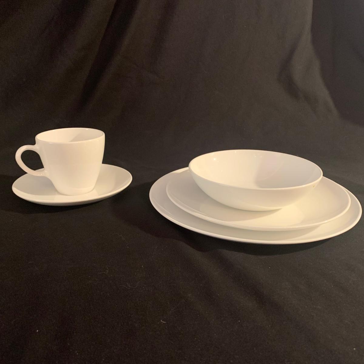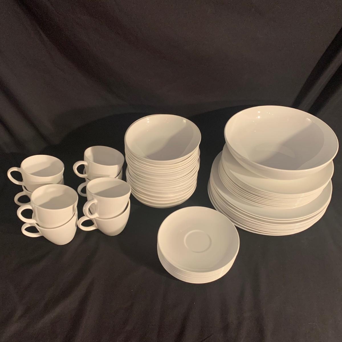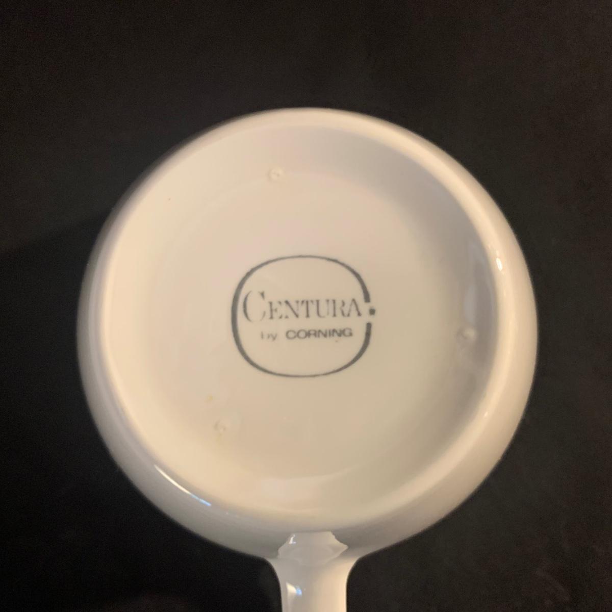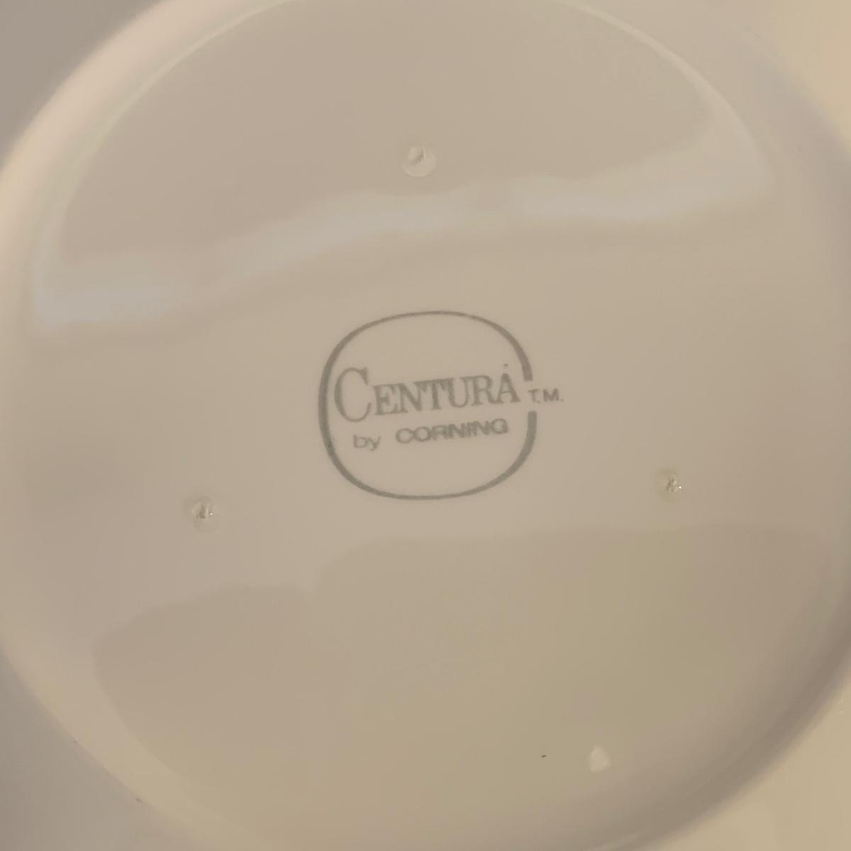 Centura by Corning dinnerware set. Nice dinnerware set with nine saucers, eight handled cups, sixteen bowls, eleven 8.5”D plates, ten large 10”D dinner plates, and one 8.5”D x 3”H large salad bowl. This dinnerware set makes eight complete place settings. This lot appears to be in good condition.