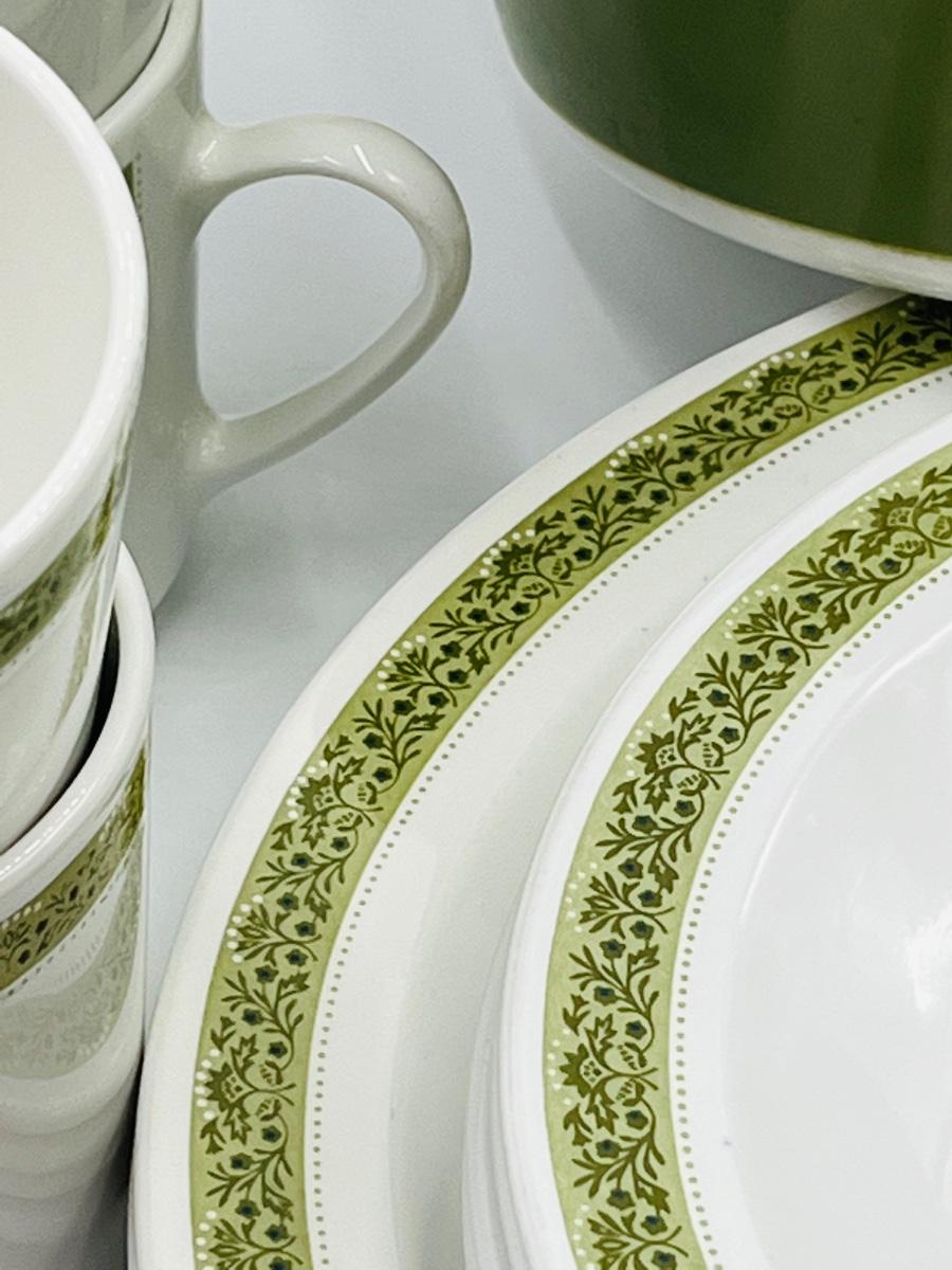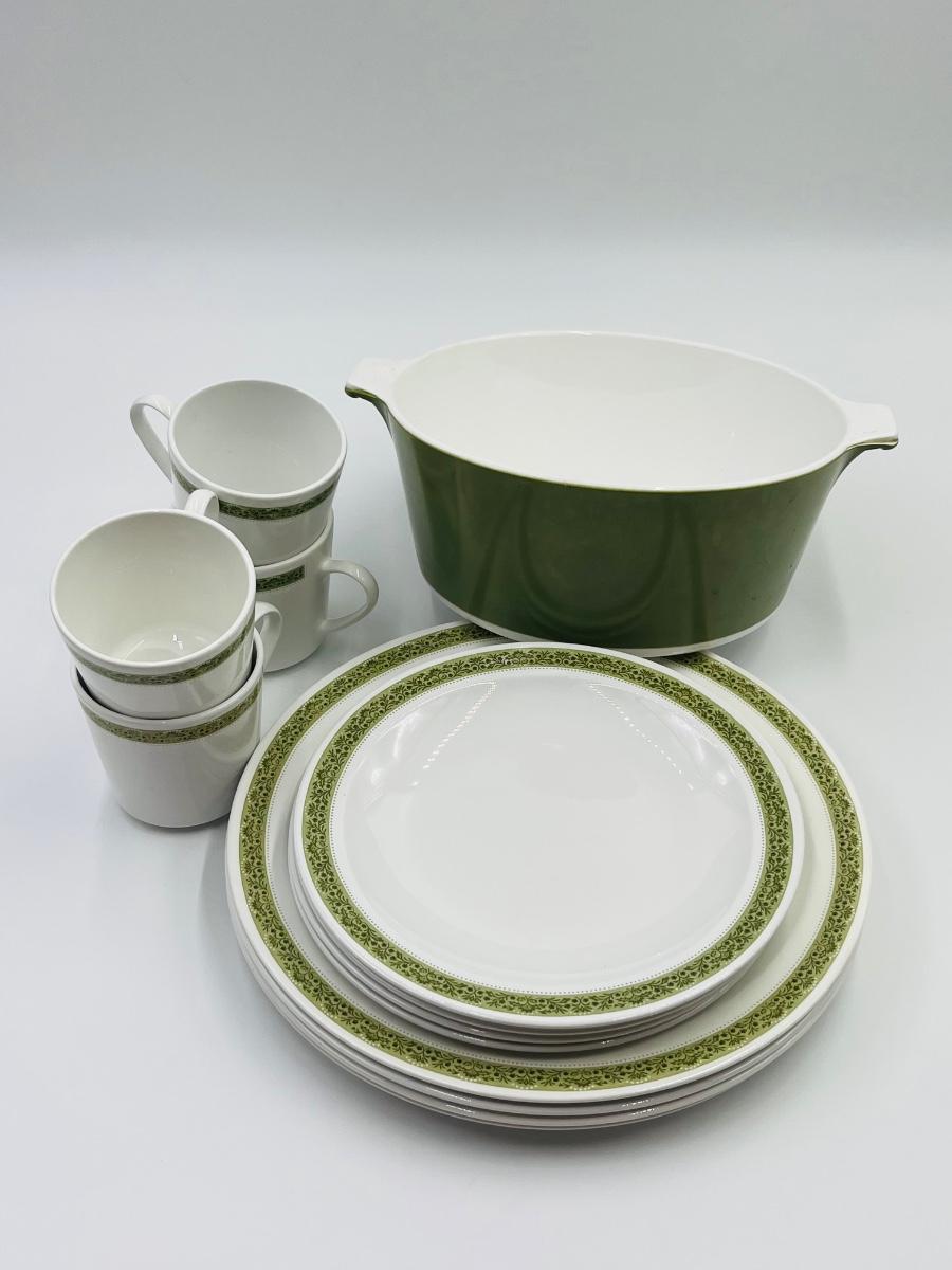 4 of each: 10" dinner plates ~8" salad plates ~ Coffee Mugs ~ One casserole dish = 4” H x 9” Round