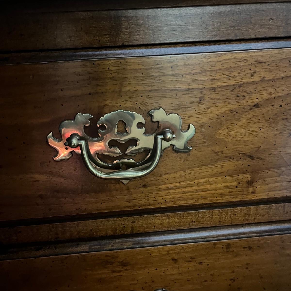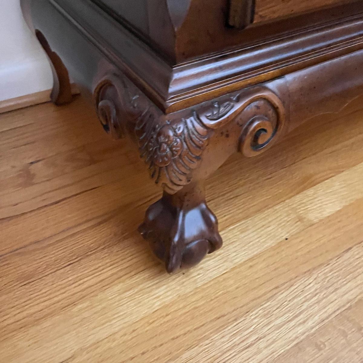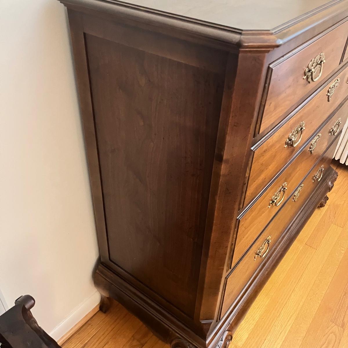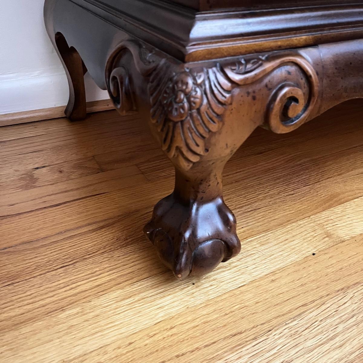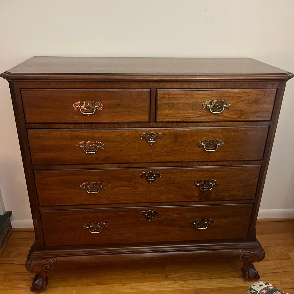 Lot includes a Century ball and claw footed chest of drawers with carved corners and feet. Chest has brass hardware on all five dovetailed drawers. Chest measures 19” x 48” x 46”.