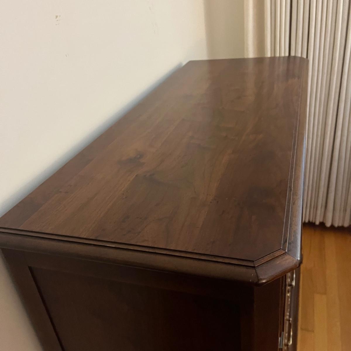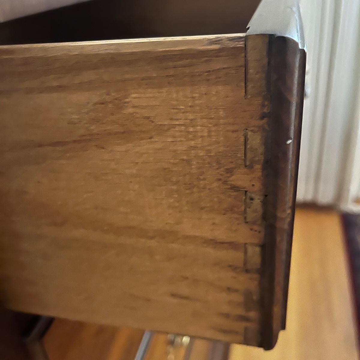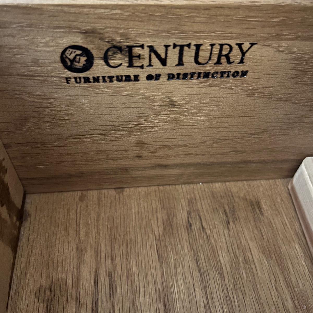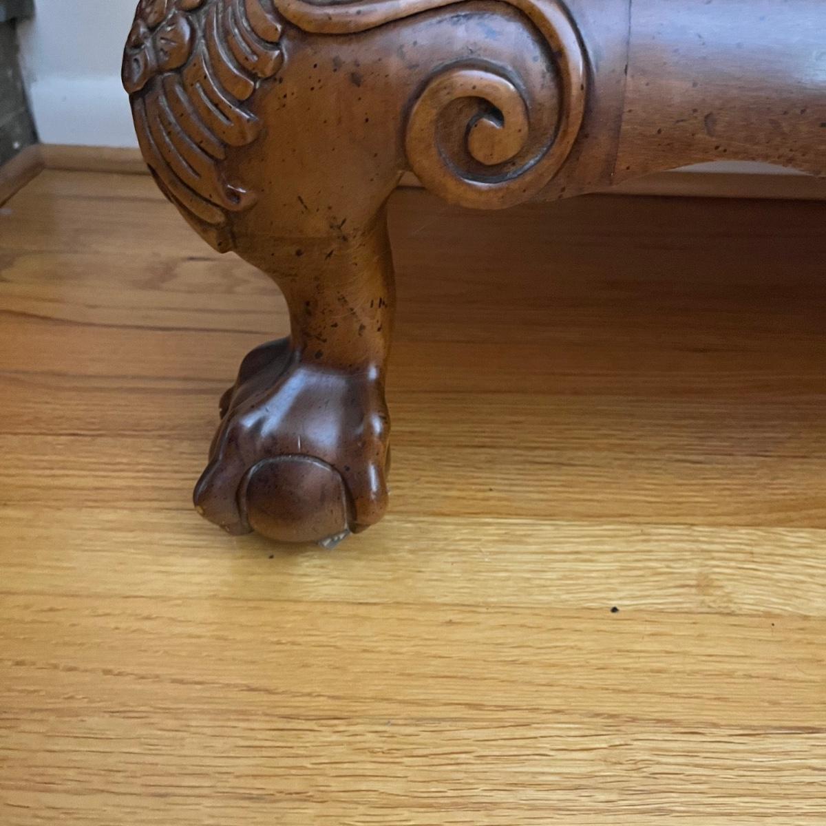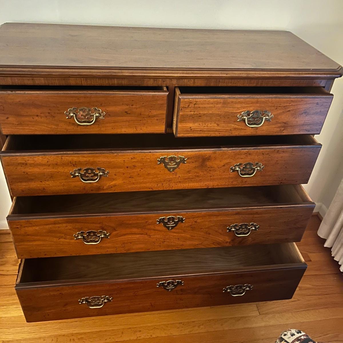 Lot includes a Century ball and claw footed chest of drawers with carved corners and feet. Chest has brass hardware on all five dovetailed drawers. Chest measures 19” x 48” x 46”.