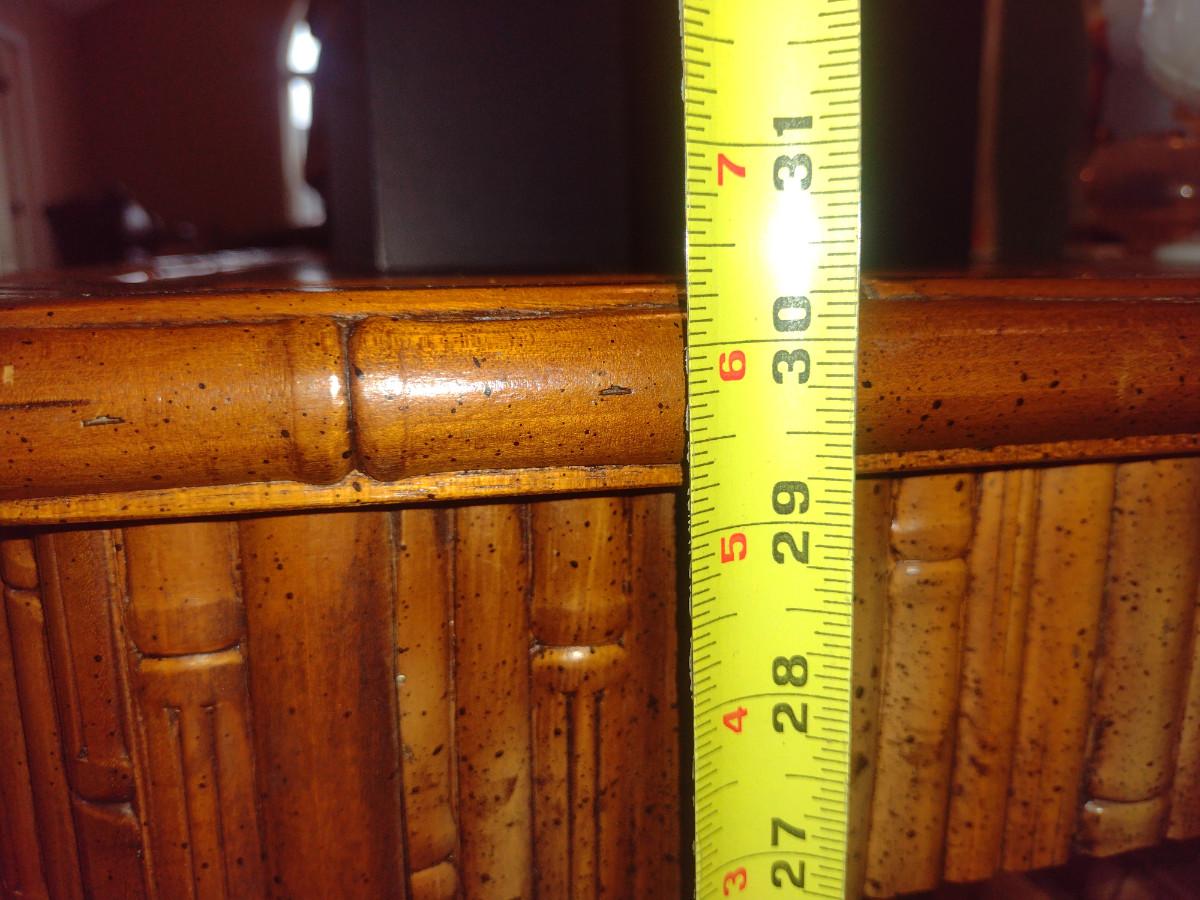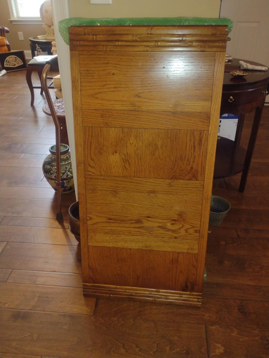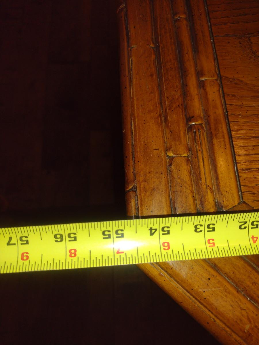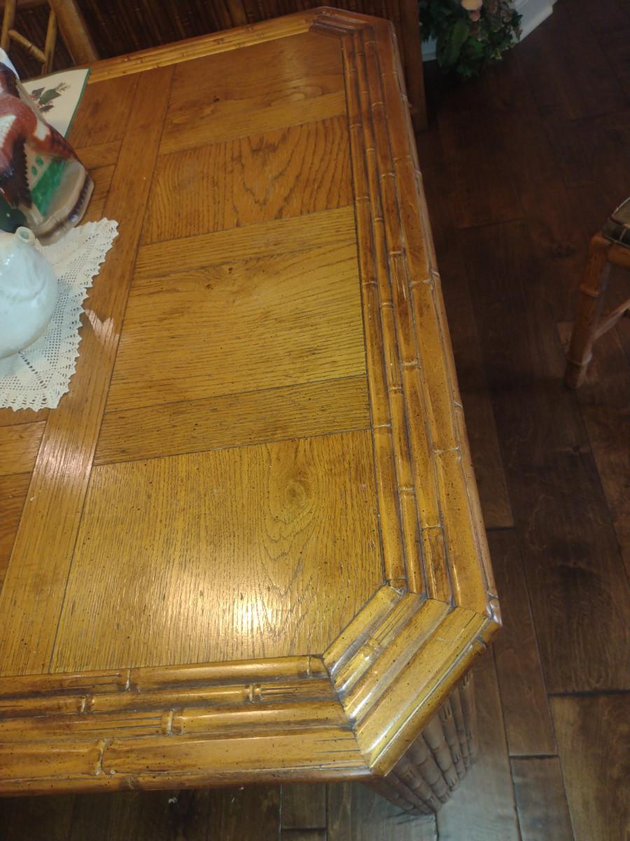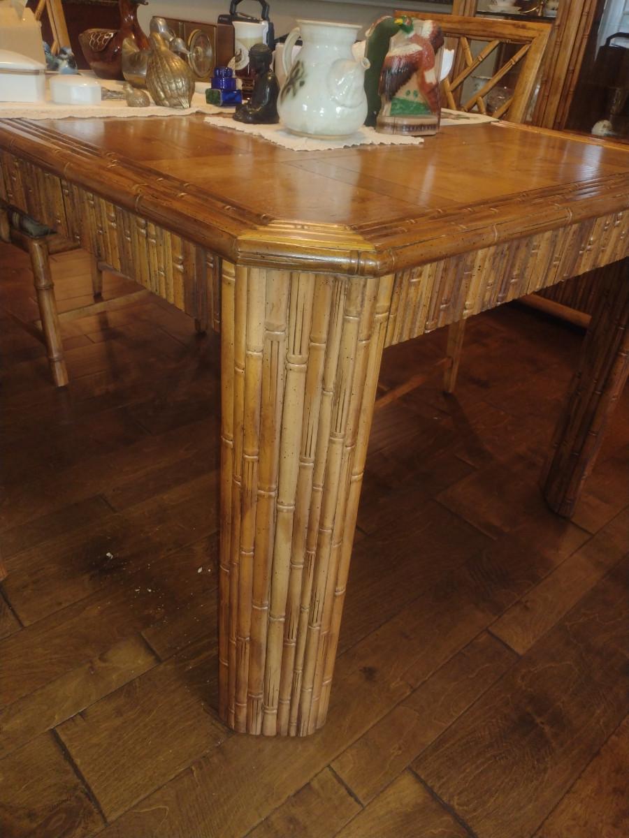 Century Furniture Co. Bamboo Design Dining Table with Four Chairs. Two leaves included (each approx 19 1/4" wide). Table dimensions are approx 41" x 54" x 30 1/4" tall (no leaves inserted). No contents included.