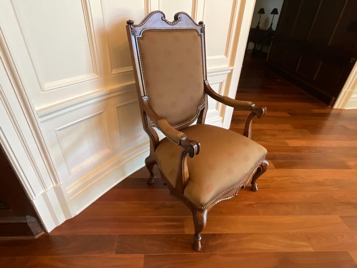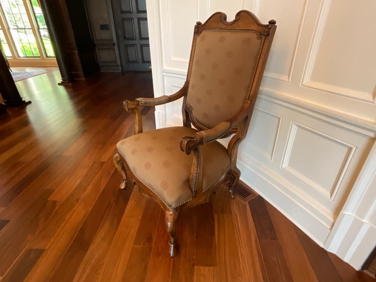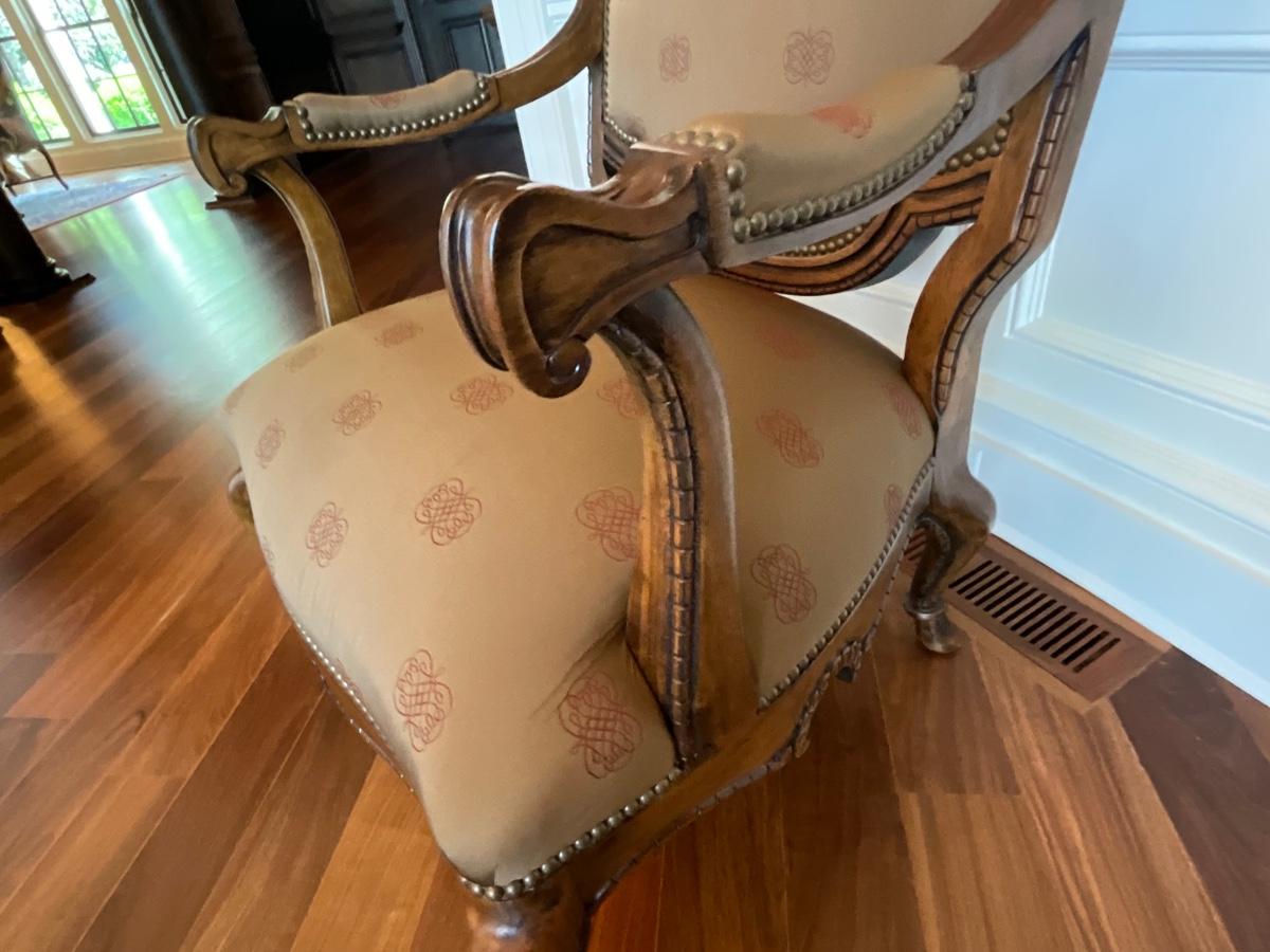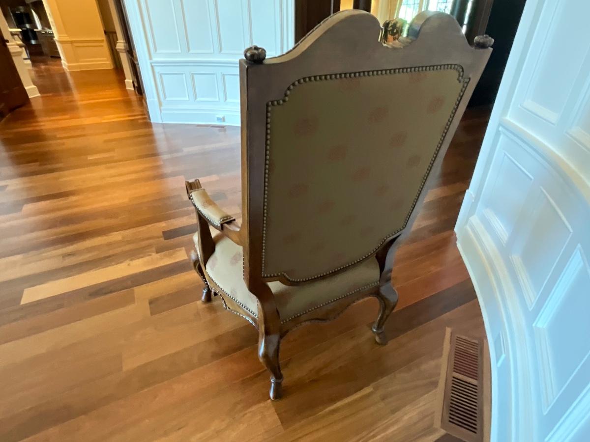 Century Silk upholstered and Wood armchair. 31 inches wide 26 inches deep and 48 inches tall. Seat width is 25 inches, seat depth is 22 inches and it’s 20 inches from the floor to the seat